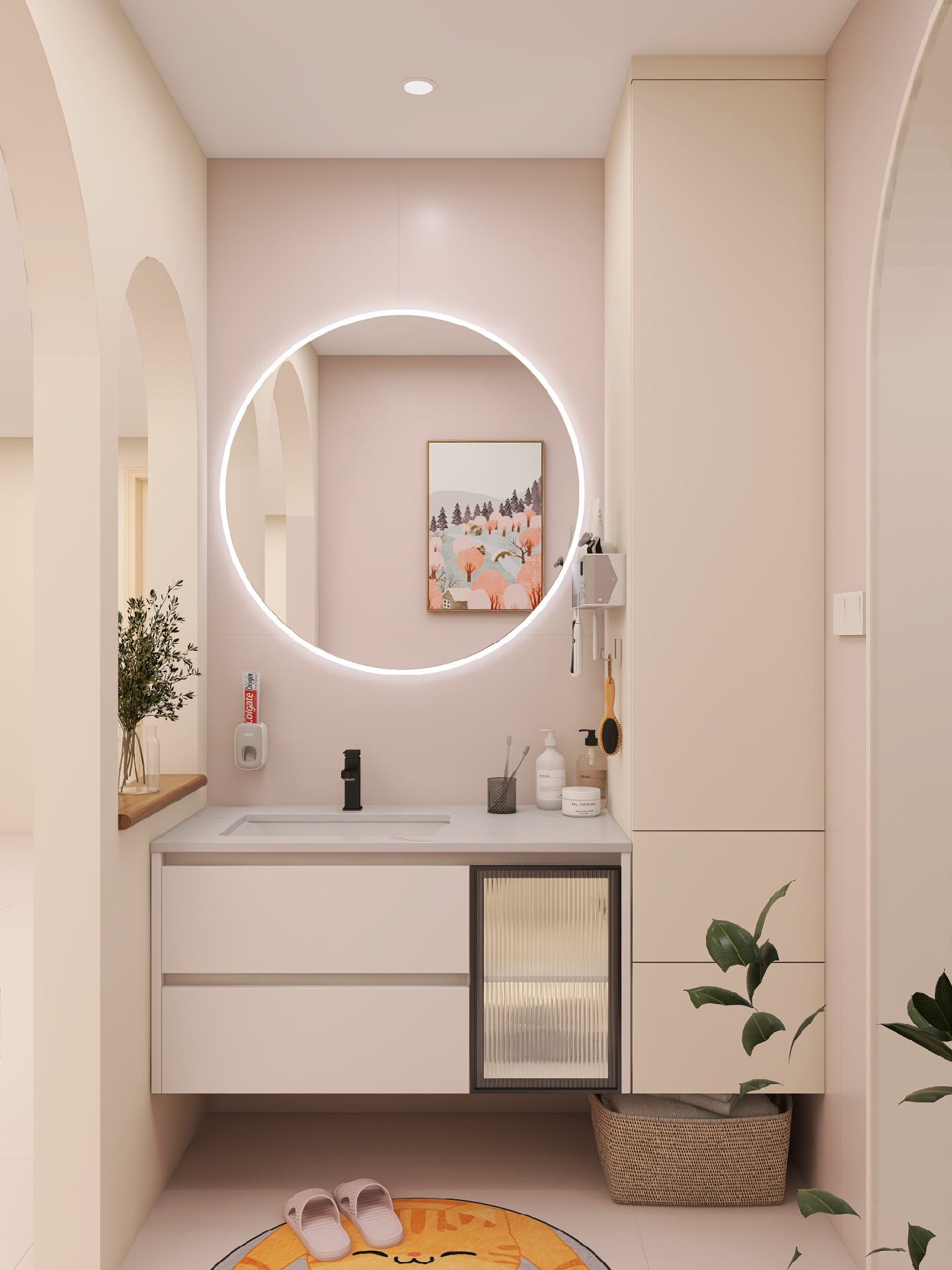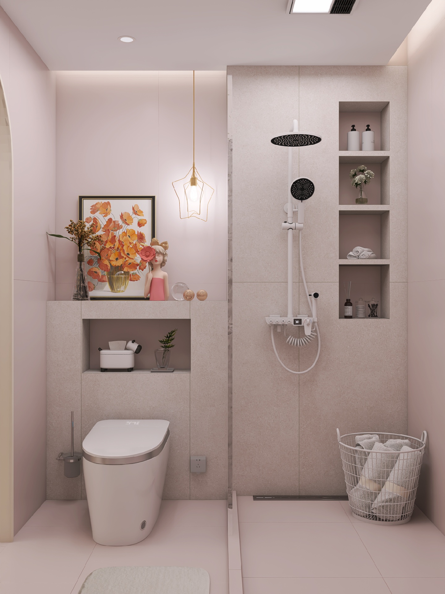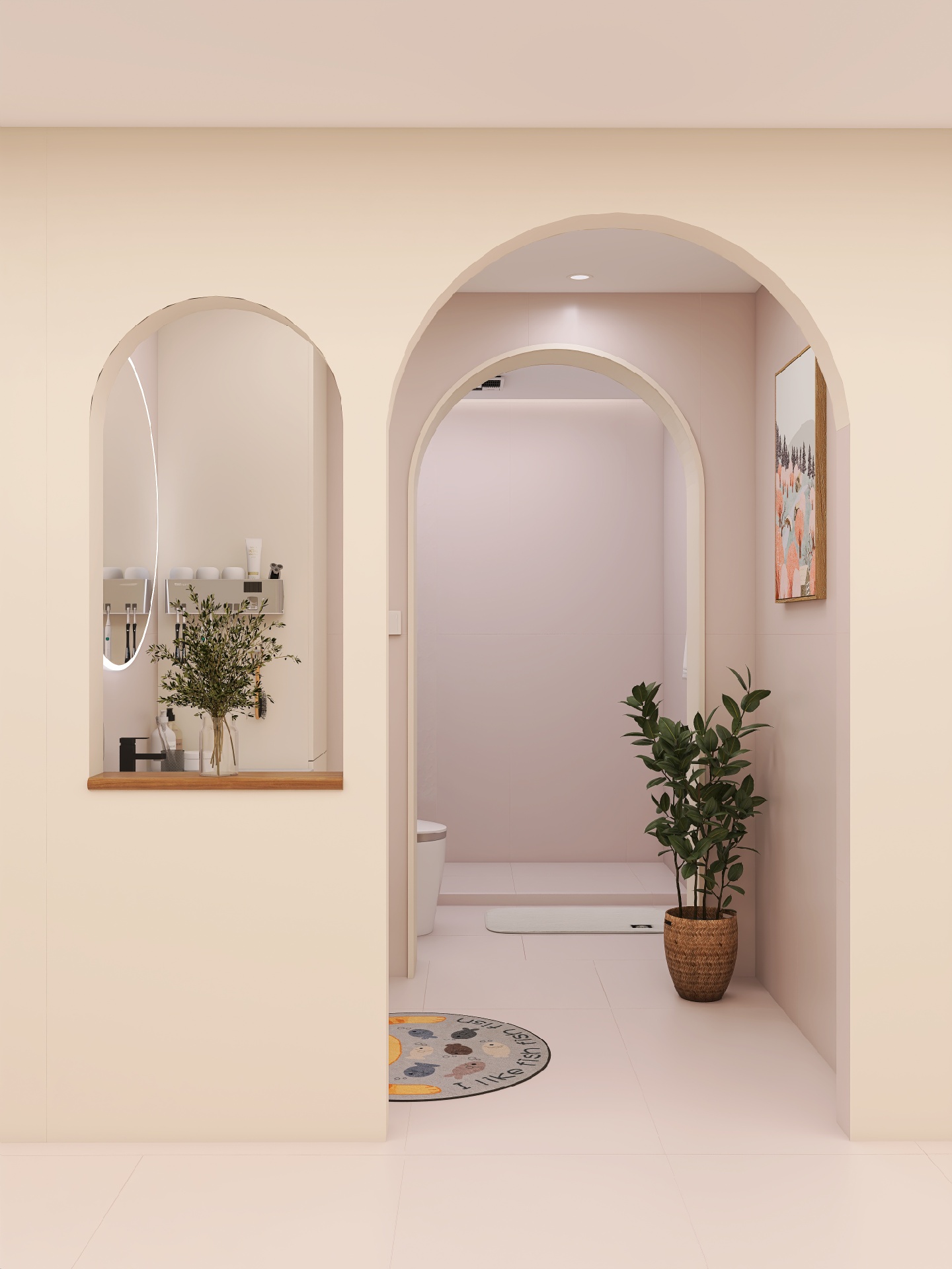 浴室原木风装修、双拱门设计、粉色微水泥墙面,最后再打开灯光,艺术画廊既视感,卫浴整体采用蔡妃品牌,卫浴天花板,就像高端的“艺术展品”浴室更美观。