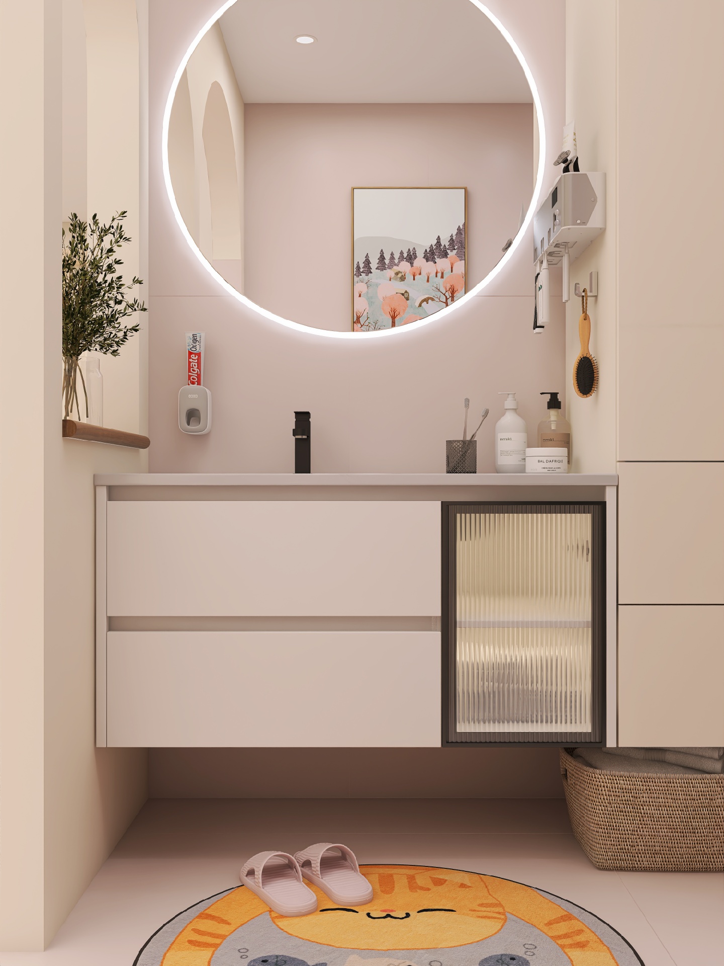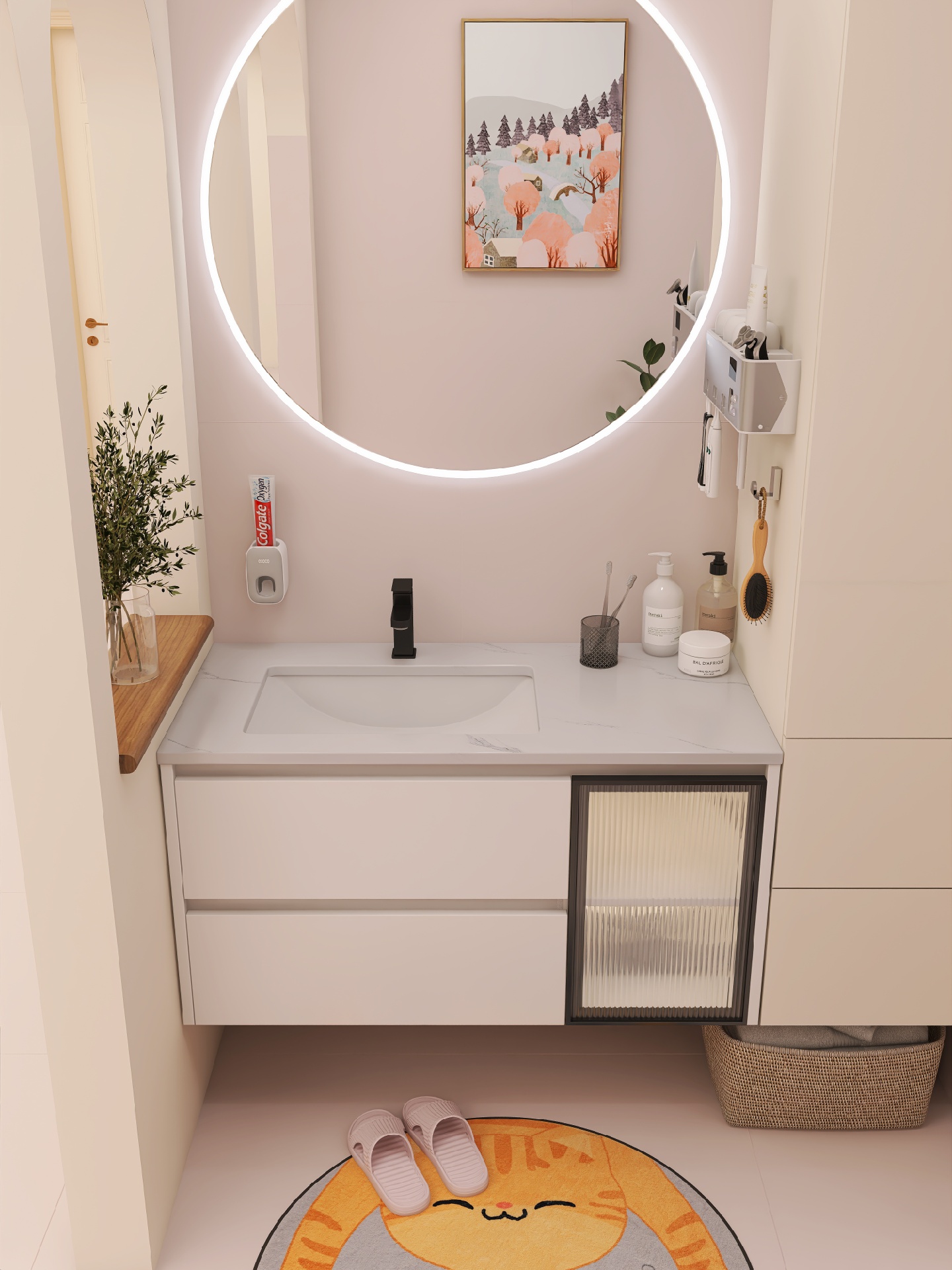 浴室柜白色外观,双层的超大空间,满足储物🧺需求,右边半透明的长虹玻璃,拥有朦胧的艺术美感。