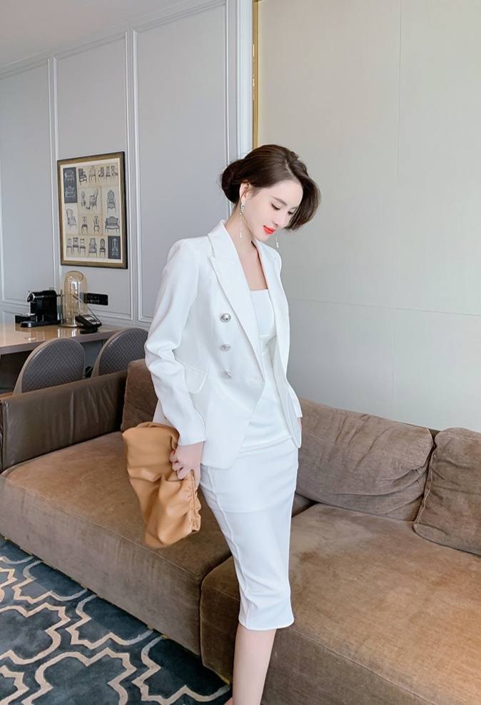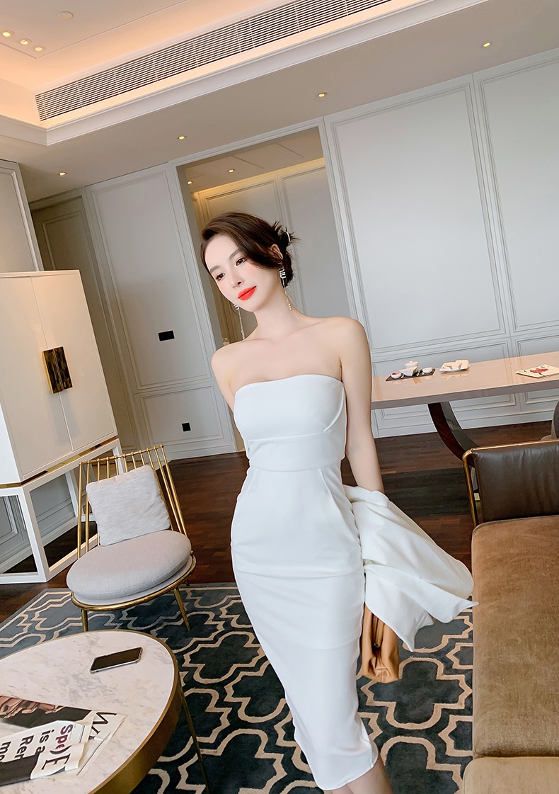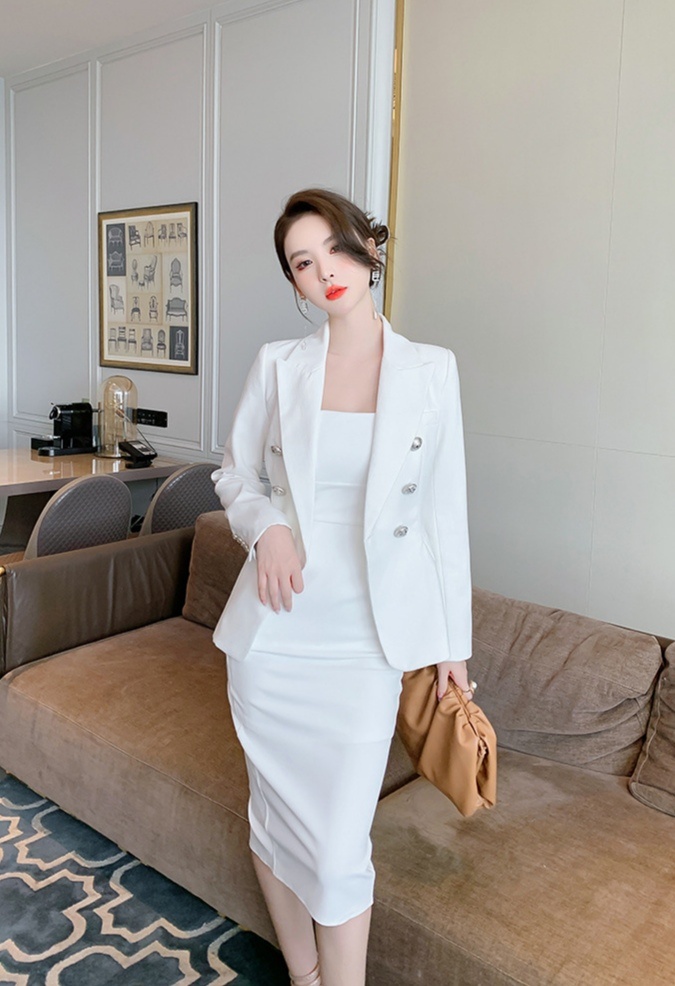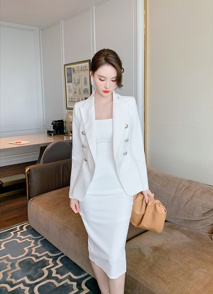 简约裹胸裙外搭白色小西服