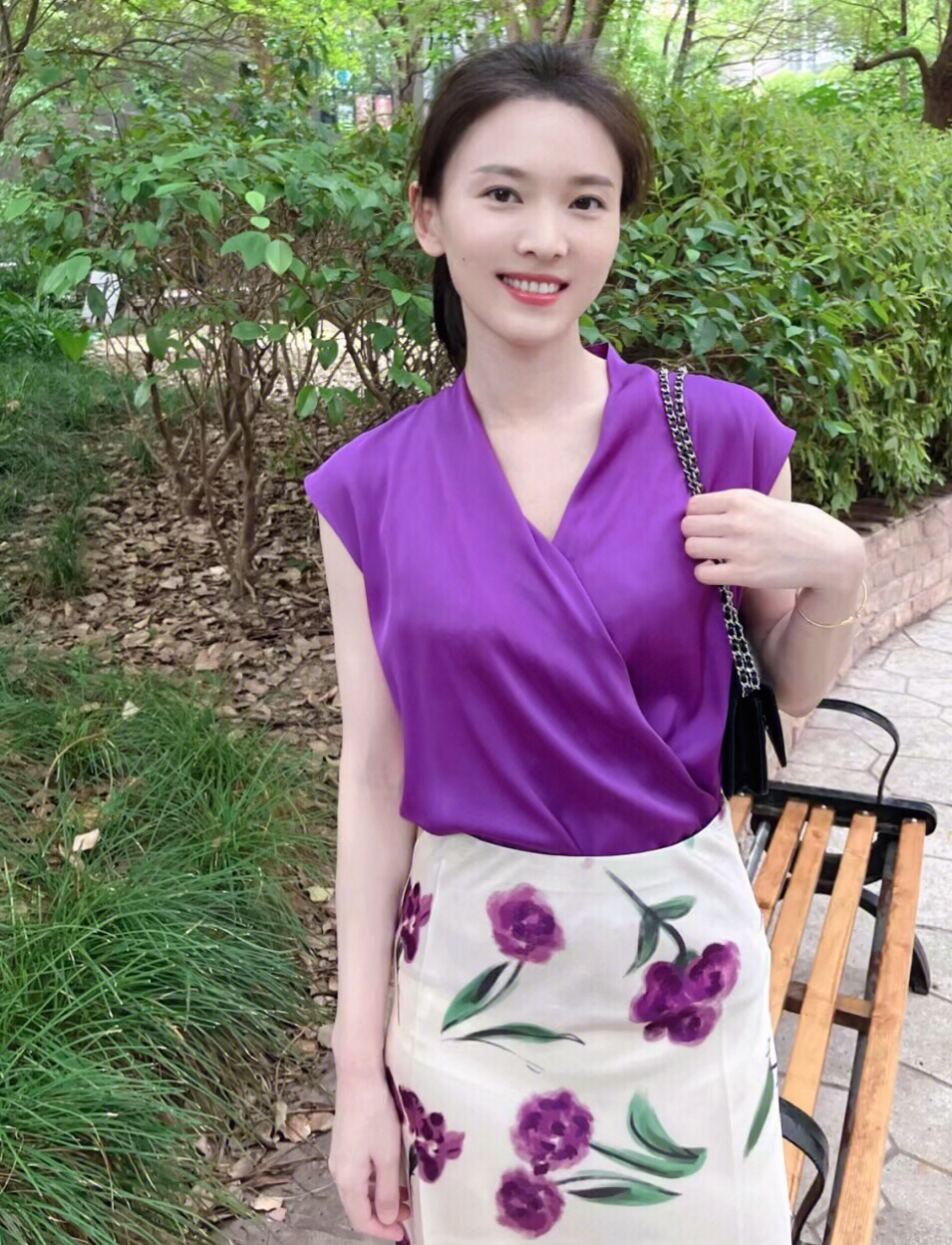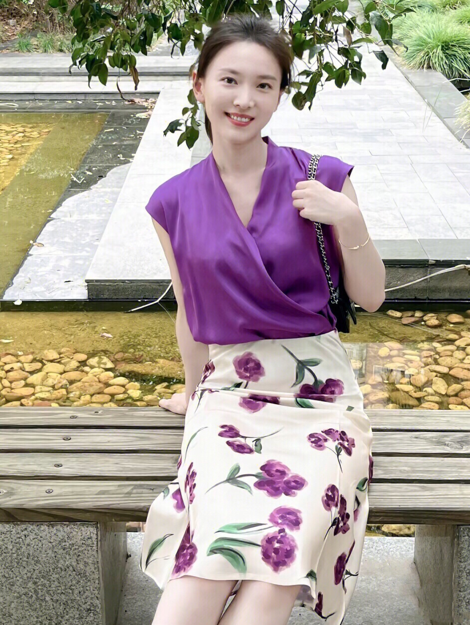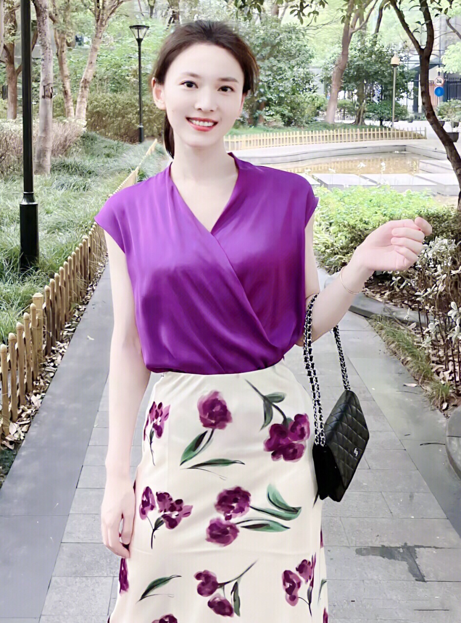 这套小紫色上衣搭配印花半身裙,温柔优雅,漂亮大气上档次。