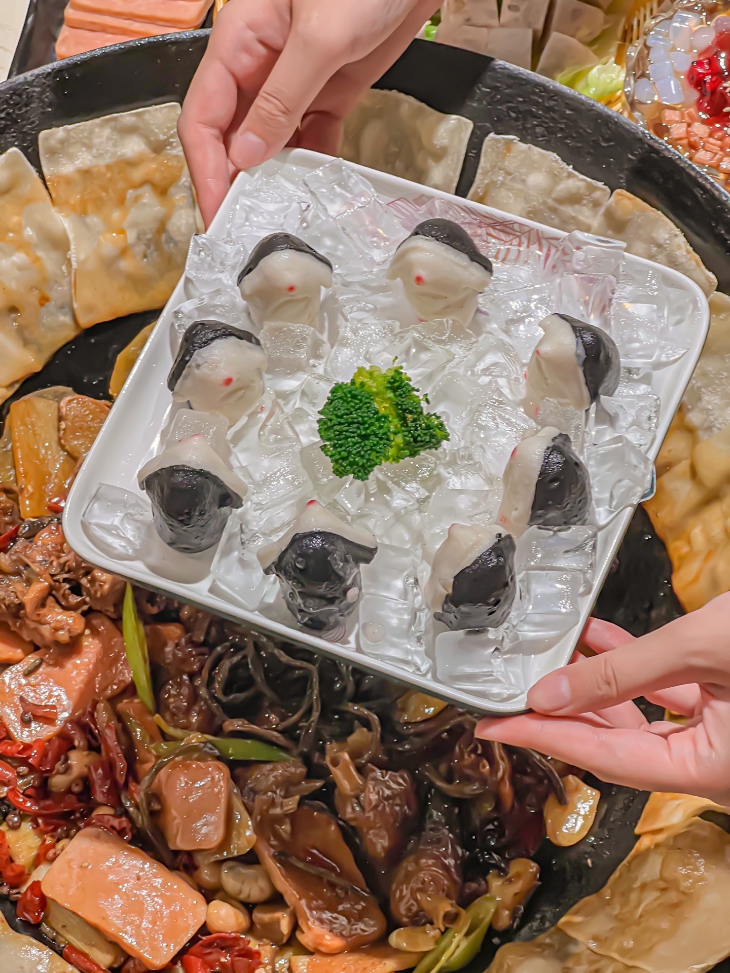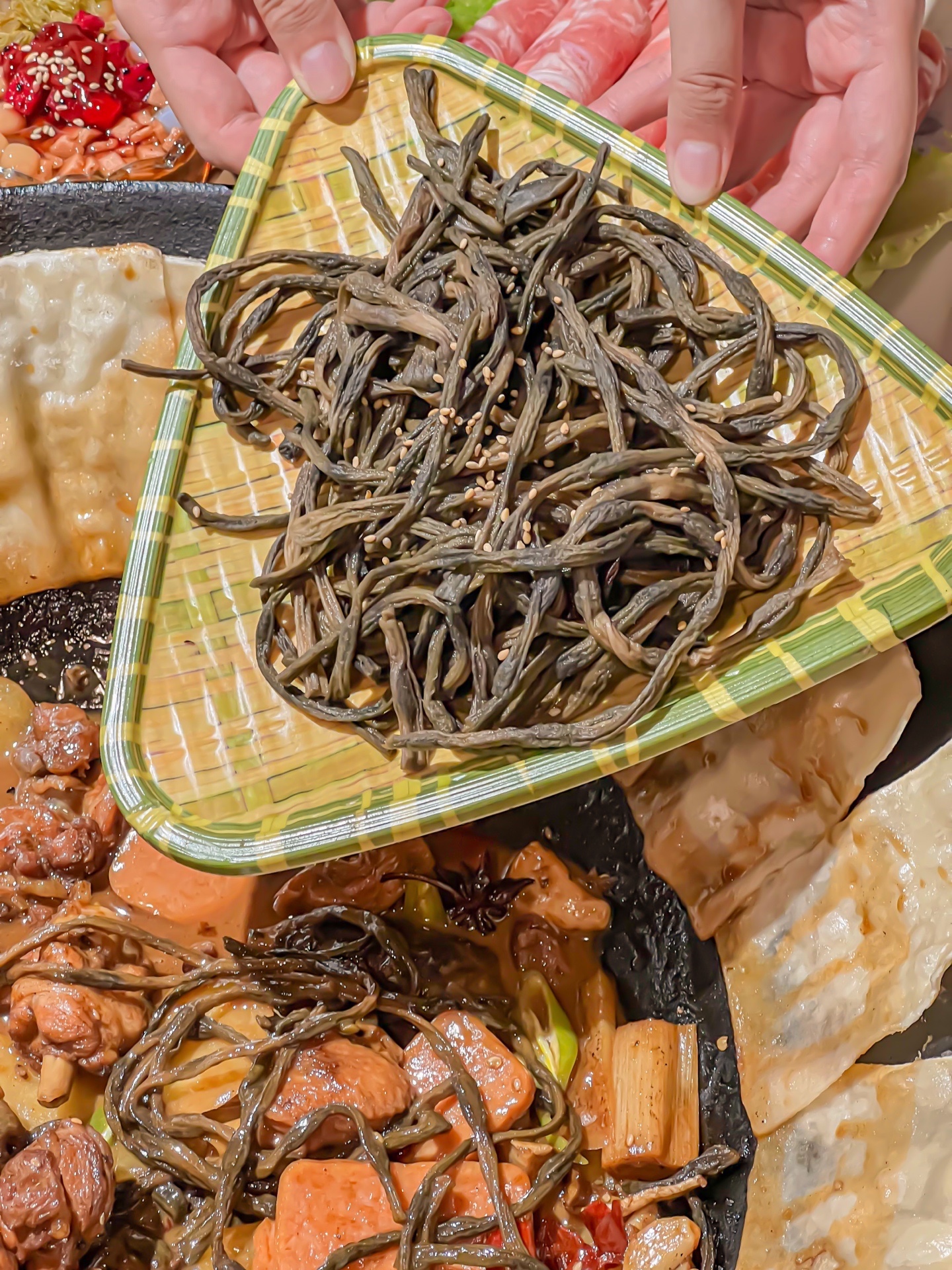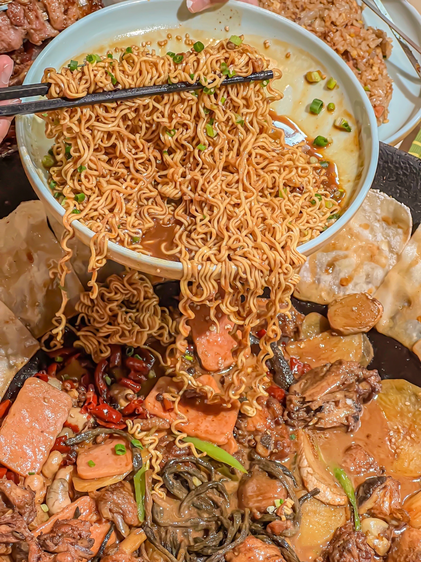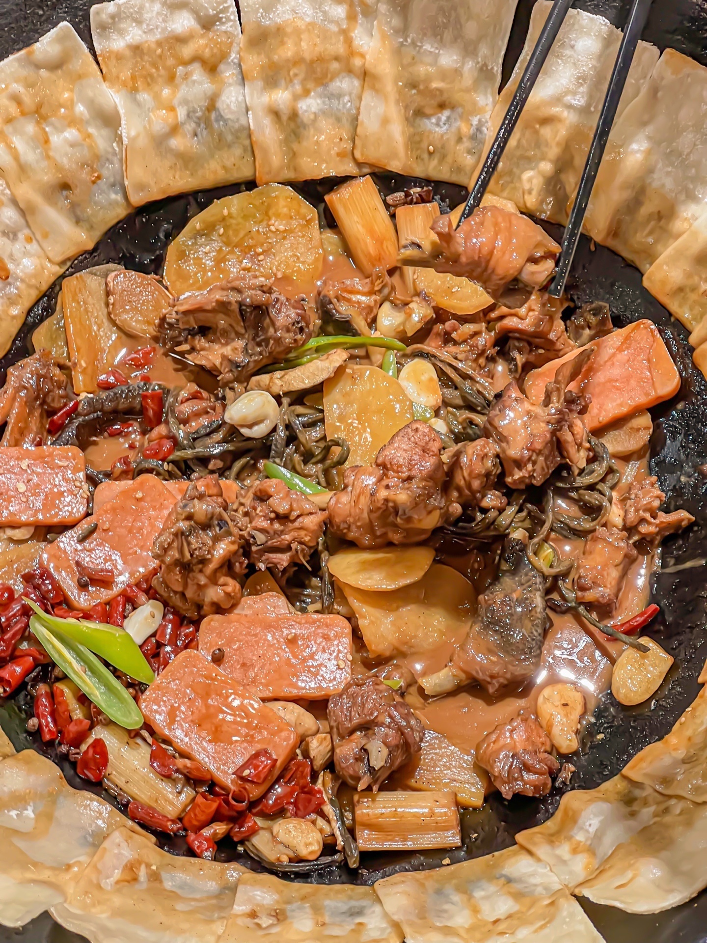 大铁锅装着满满的鸡块和贴饼,吃了直呼绝绝子!一整锅的鸡肉!!大块又入味,点了微辣,很是开胃。食肉狂欢者着实爱了~上桌前已经充分的吸收汤汁,夹起鸡肉时总有汤汁附着其上,吃起来贼过瘾!贴饼围成一圈儿,卤汁完美浸透软糯热乎,记得再加上方便面,大口嗦面太过瘾!!!吃完加汤可以涮其他好吃的食材~