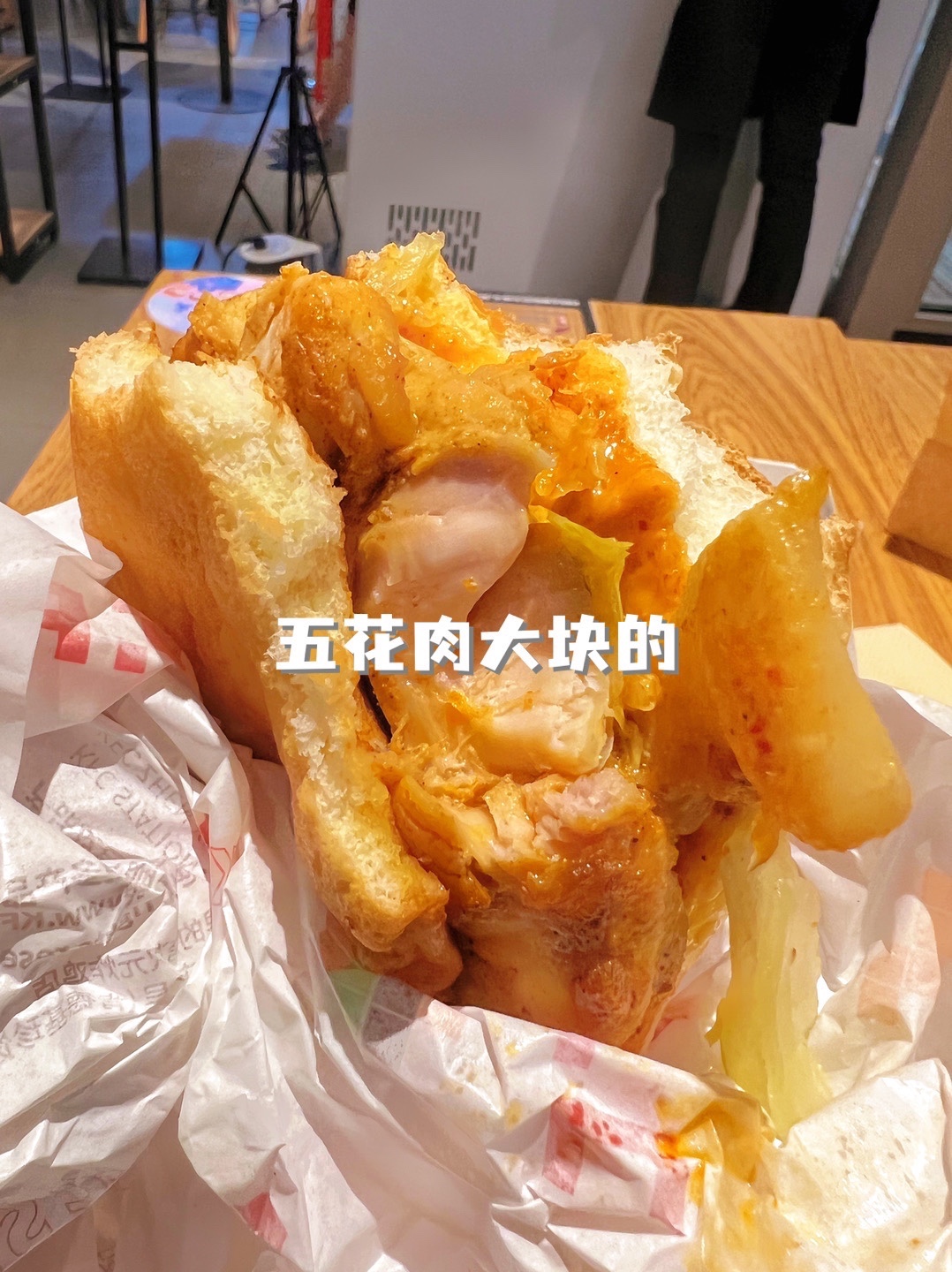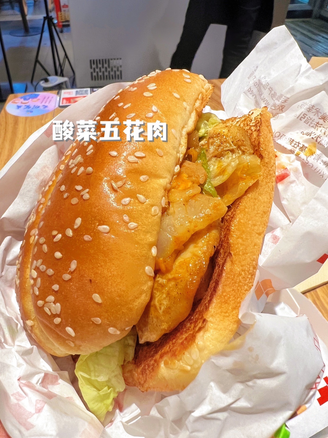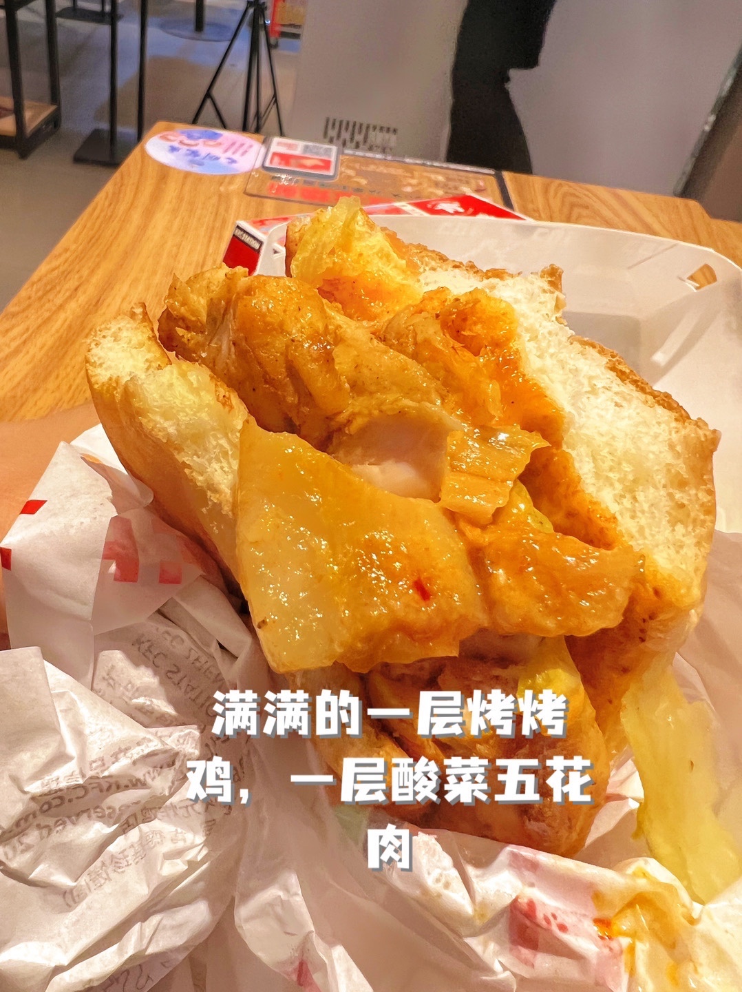 汉堡夹两层肉的,下面层是奥尔良烤鸡腿肉,上面层是东北酸白菜和看得见的大块五花肉,肥瘦参半的,咬下去酸爽开胃,这个味道我喜欢。