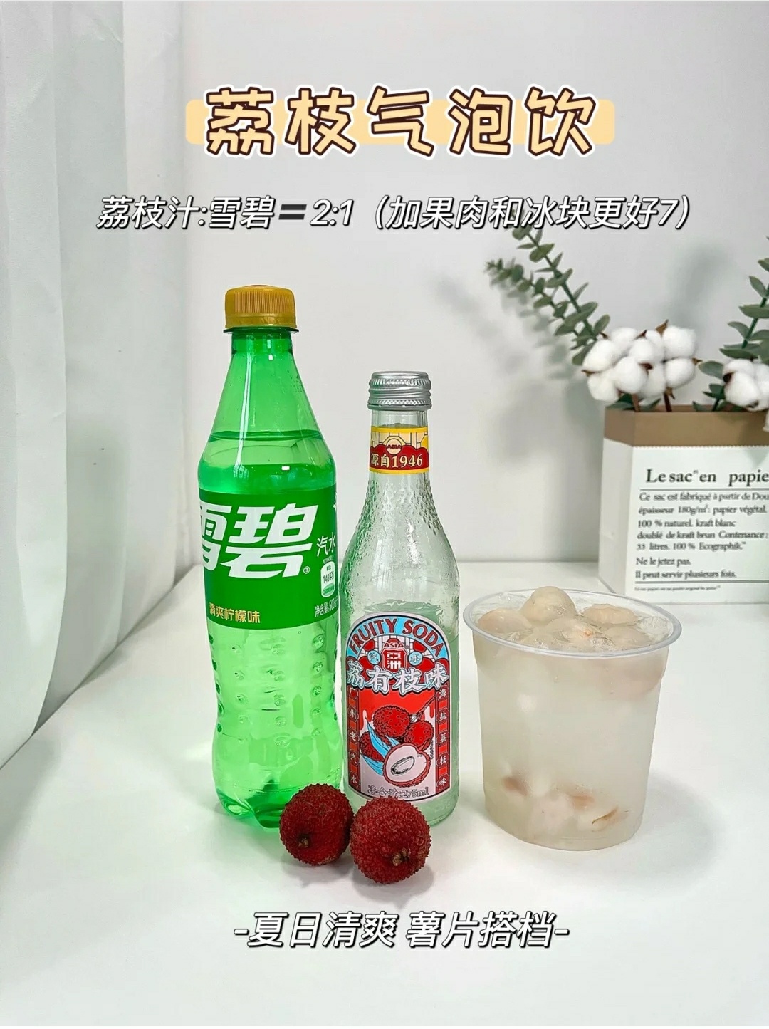 荔枝汁:雪碧=2:1(果肉+冰块🧊)
