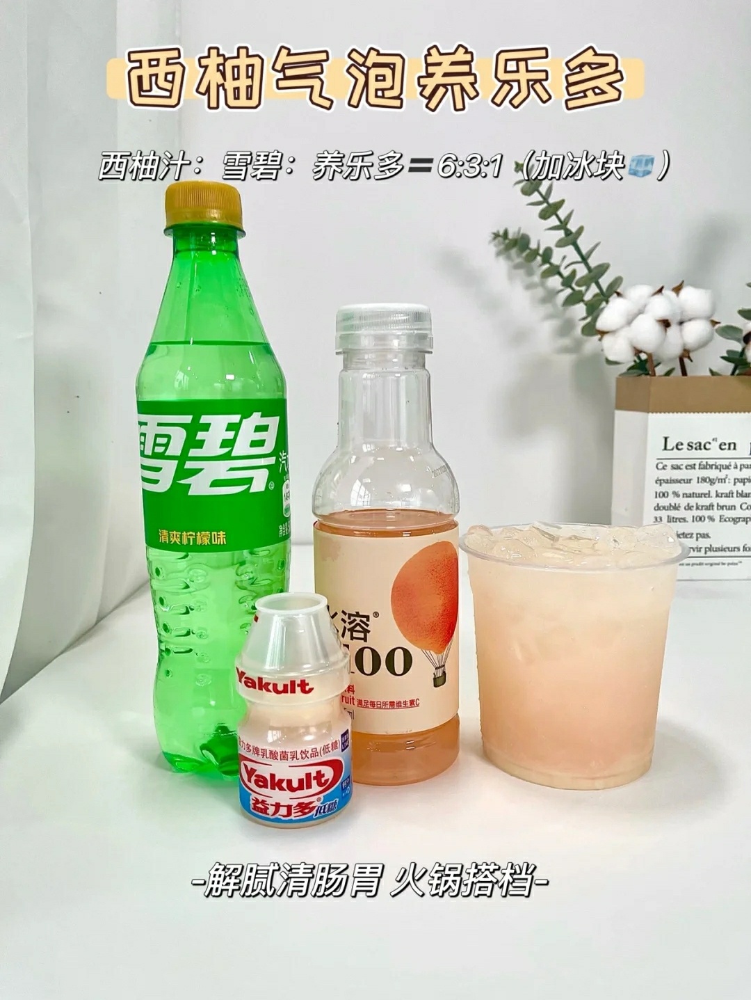 西柚汁:雪碧:养乐多=6:3:1+冰块🧊