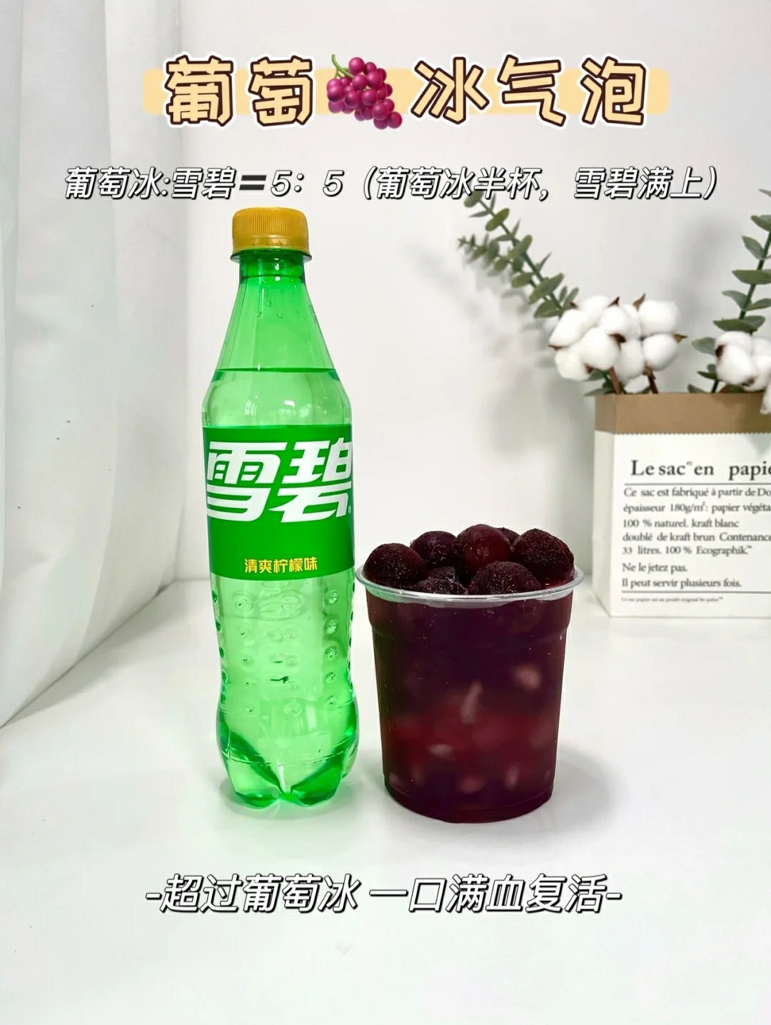 葡萄冰:雪碧=5:5(葡萄冰半杯+雪碧满上)