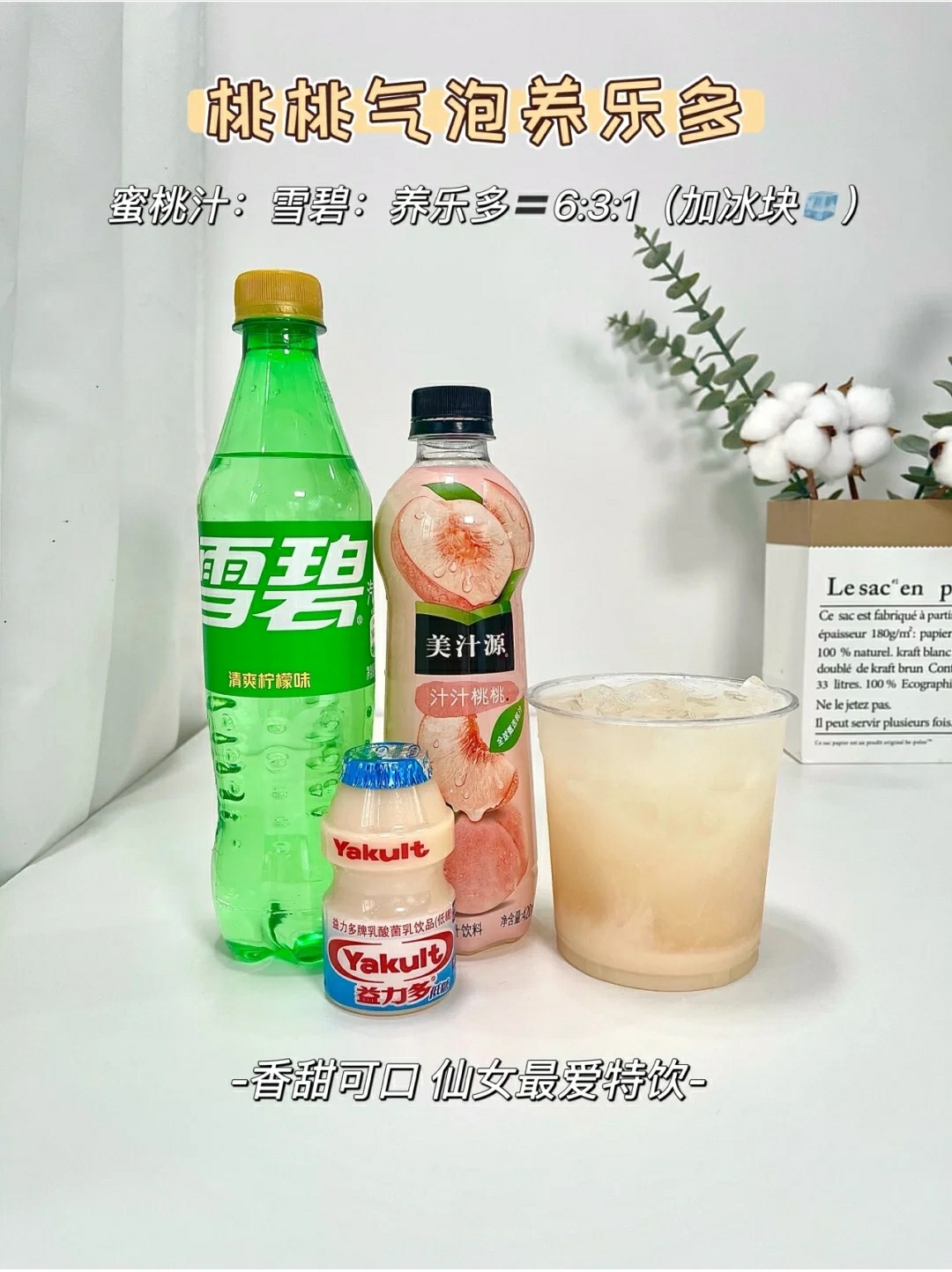 蜜桃汁:雪碧:养乐多=6:3:1+冰块🧊