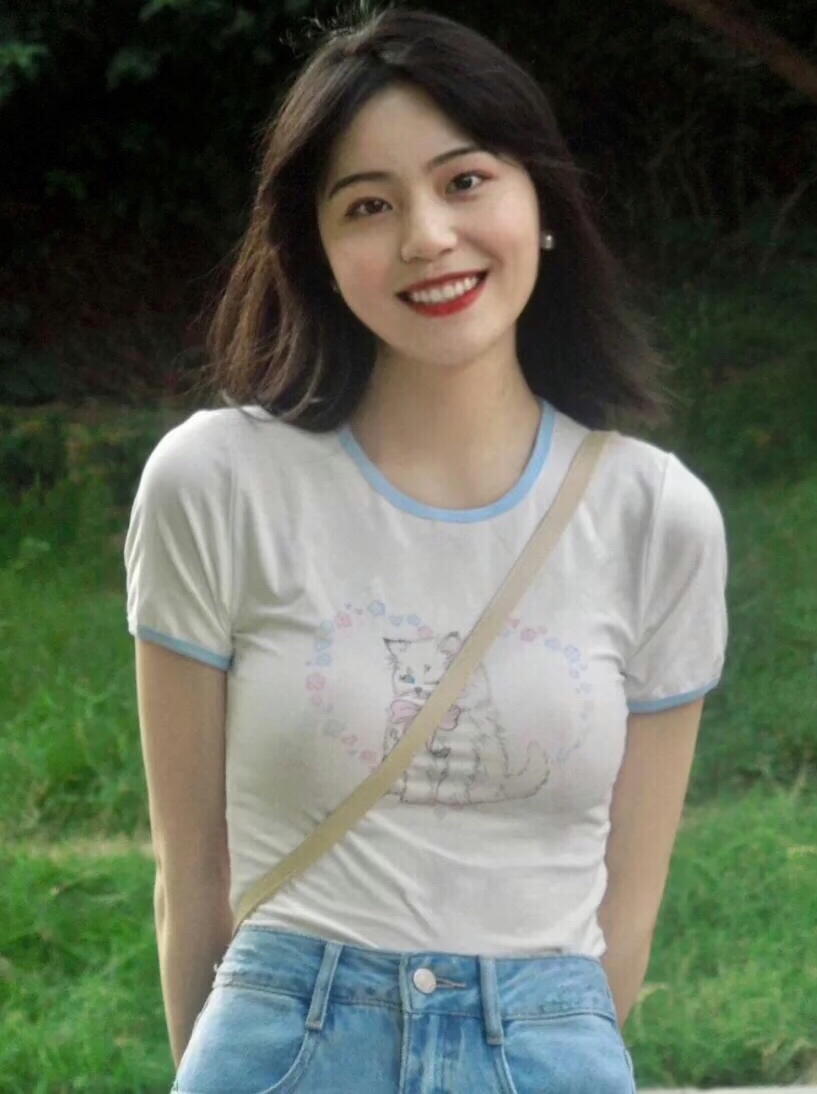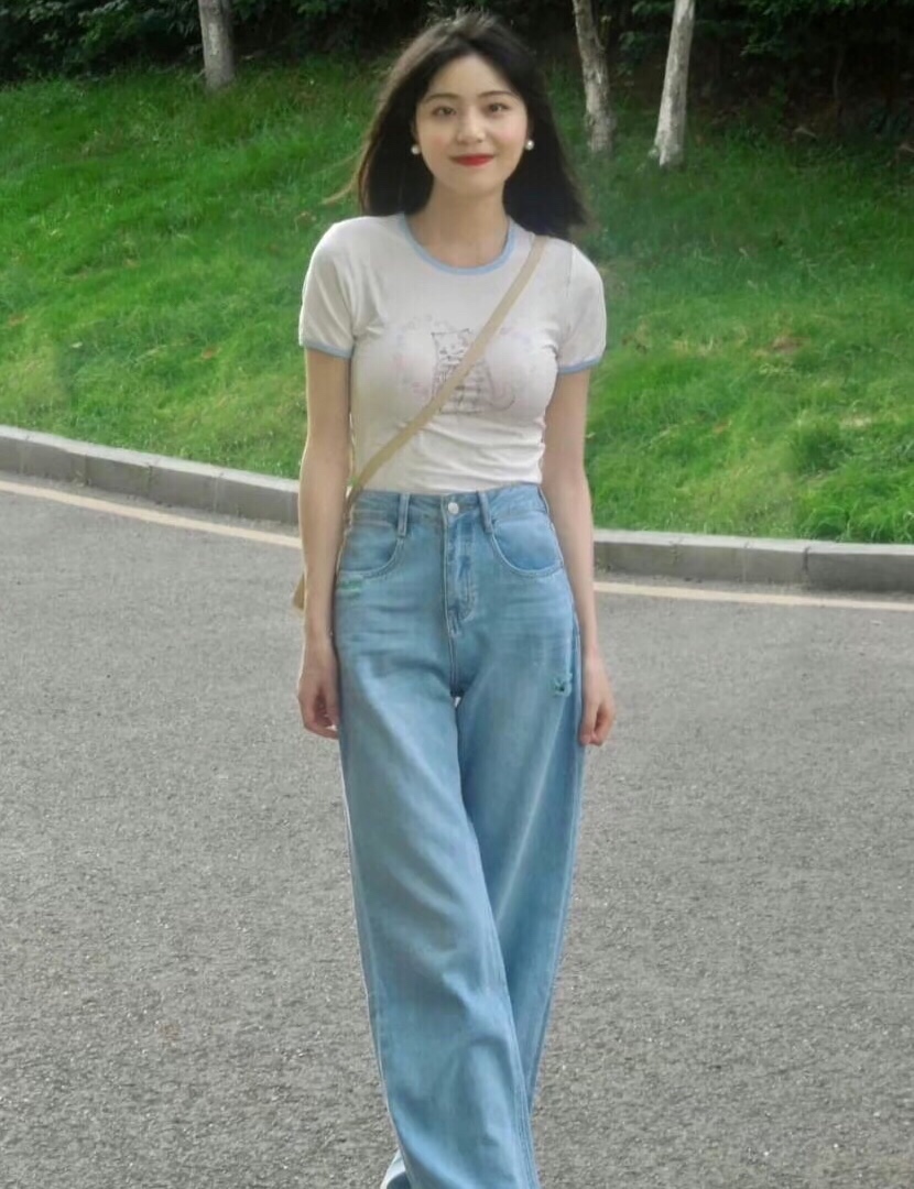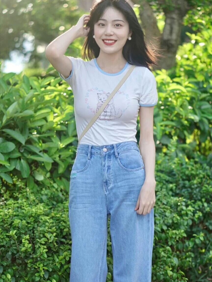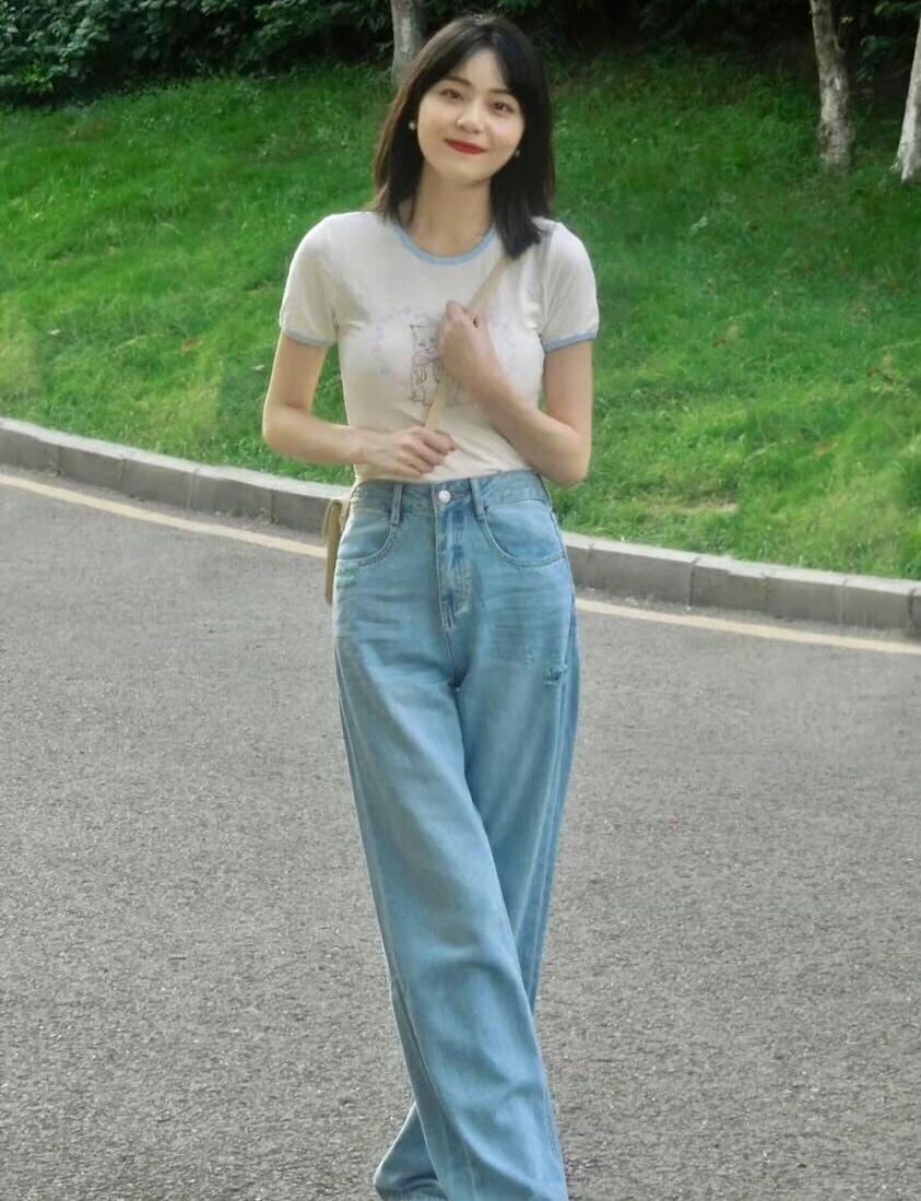 基础款浅色T恤可以搭配牛仔裤,简约不挑人~