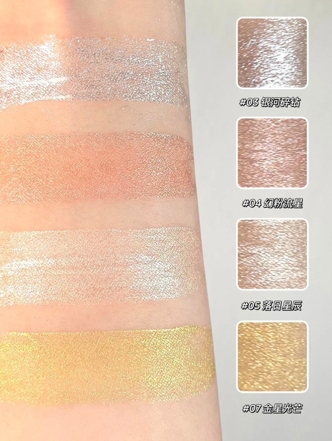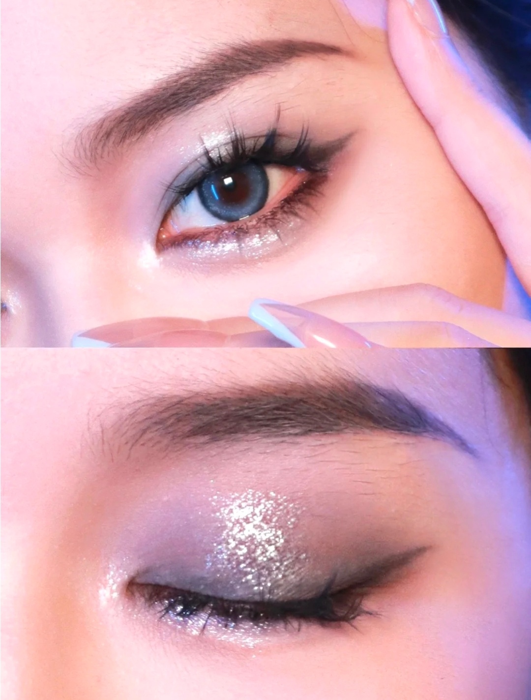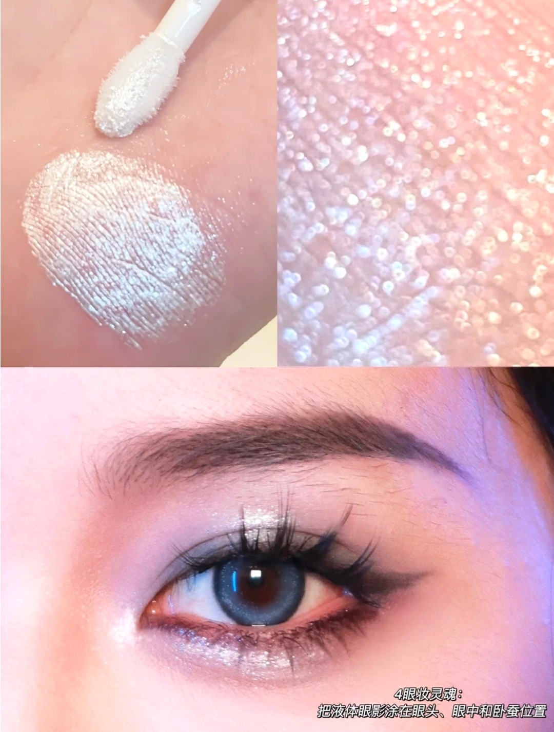 ◻️液体眼影用的是nyx全球新品液体眼影#03银河碎钻,刷头精细用量,轻轻点涂在眼中、眼头和卧蚕位置,直接用手晕染开,呈现爆闪妆效,立马变身夏日碎碎冰女孩~