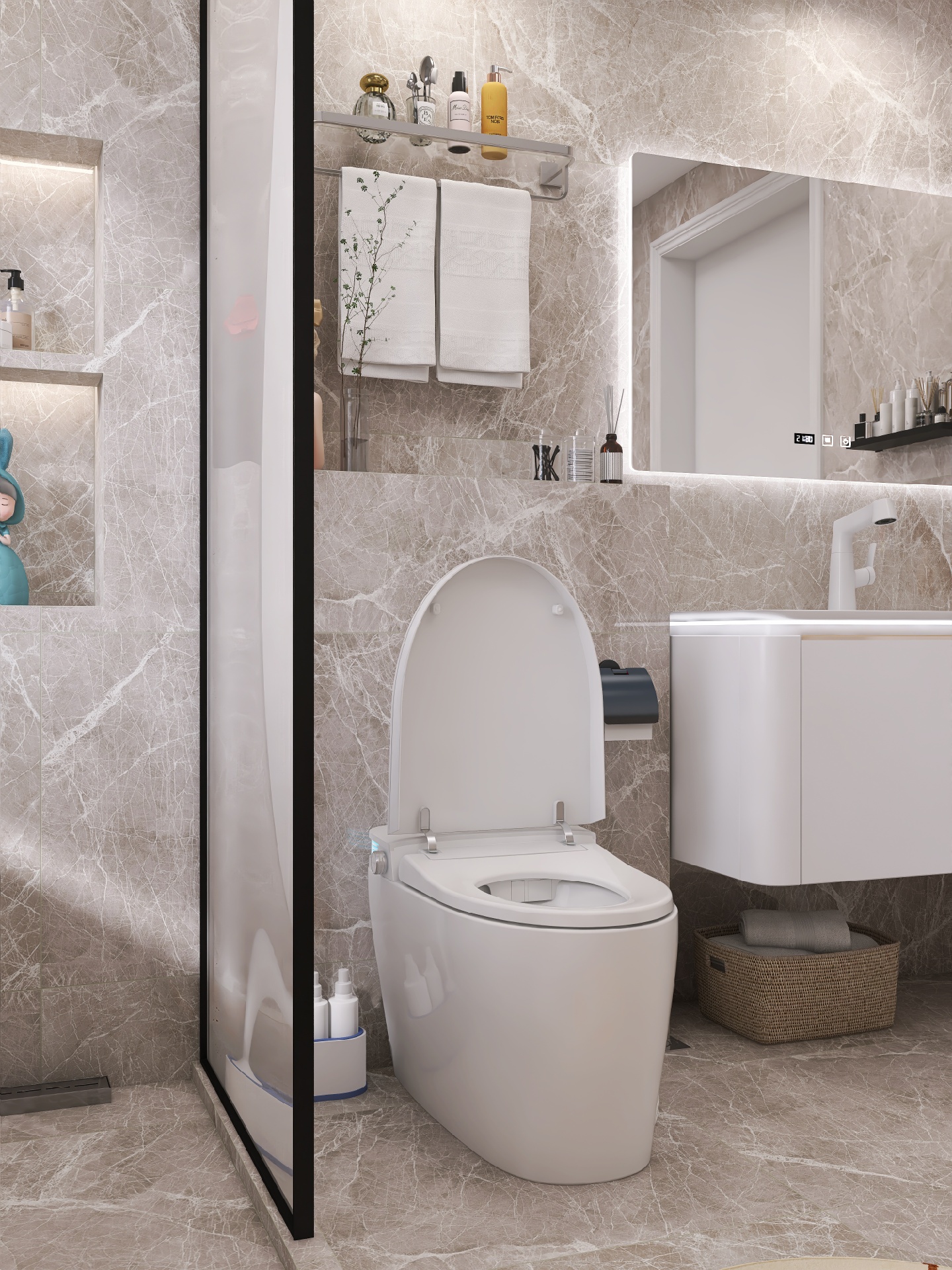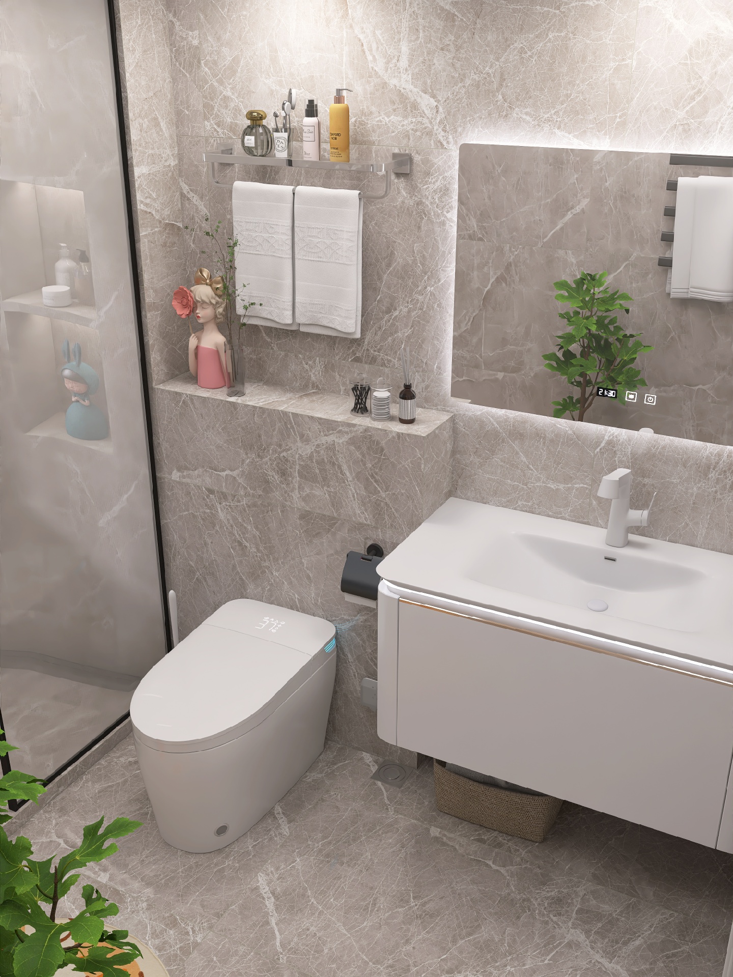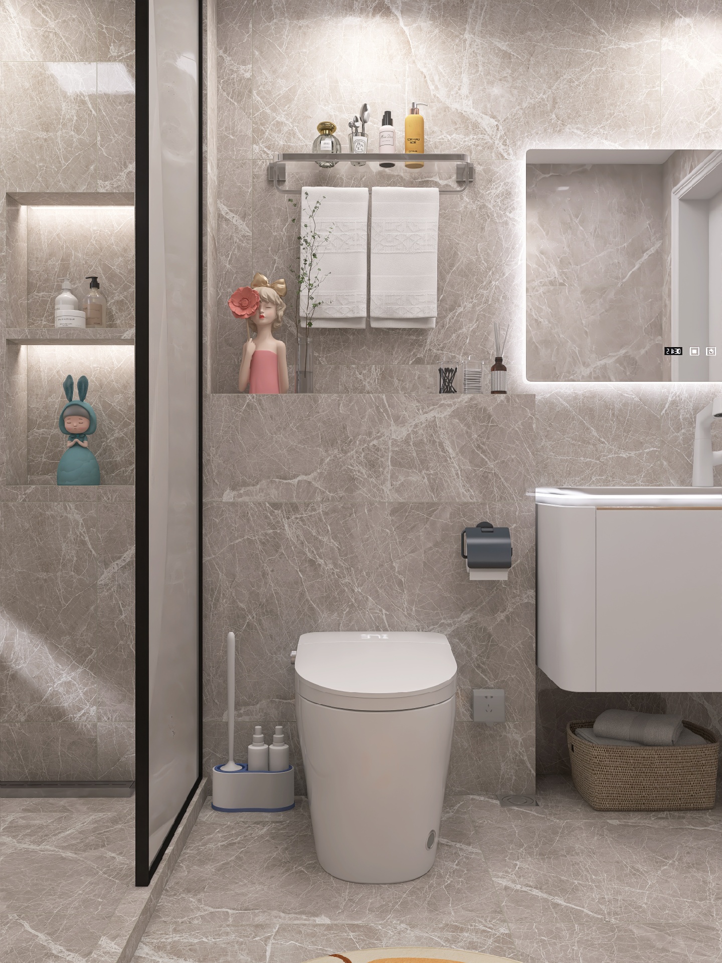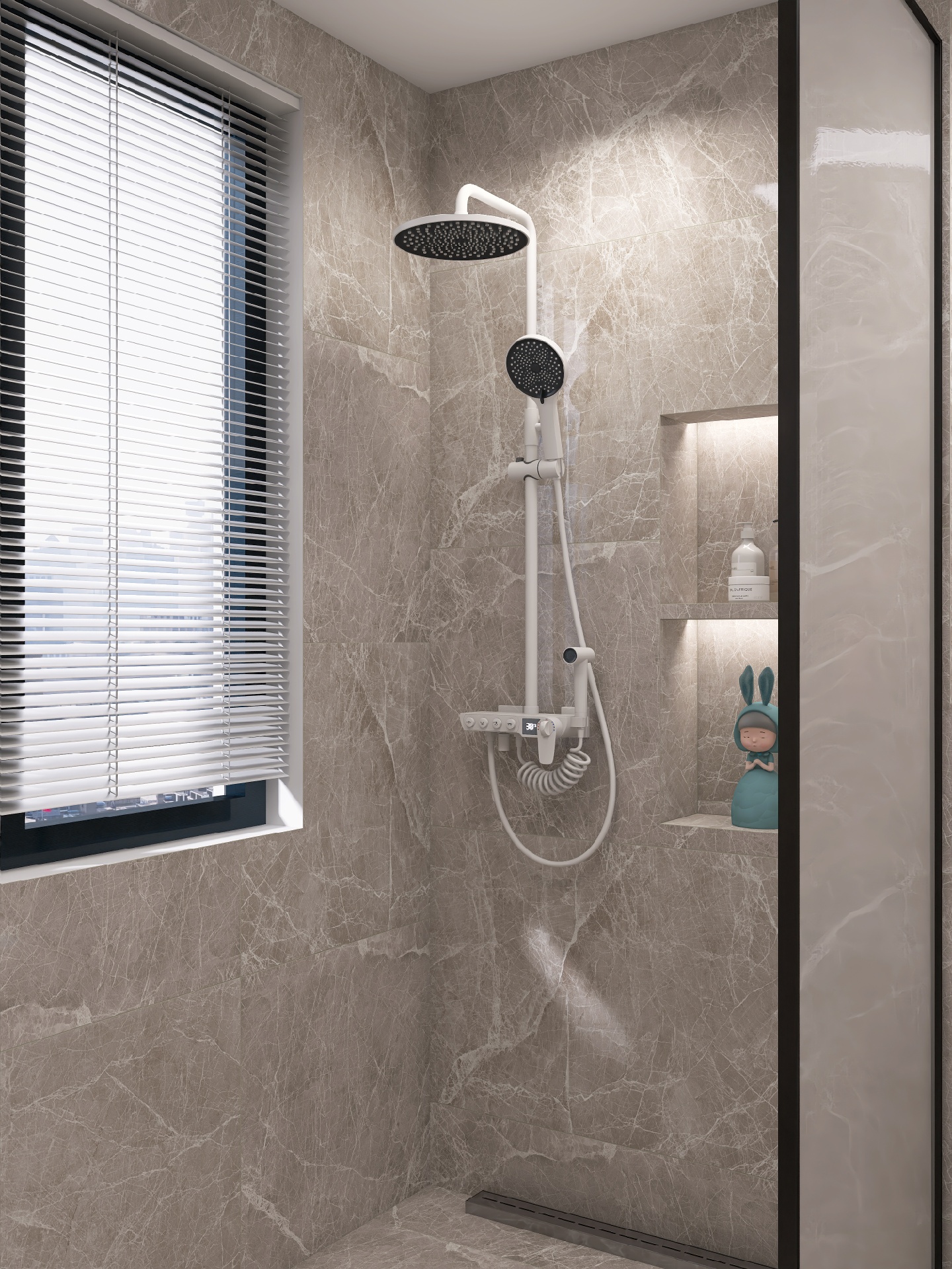 墙面和地面都选择的米灰色瓷砖,大理石的纹理很有质感,亮面的瓷砖受光反射,浴室会更亮堂,而且光面瓷砖清洁方便。