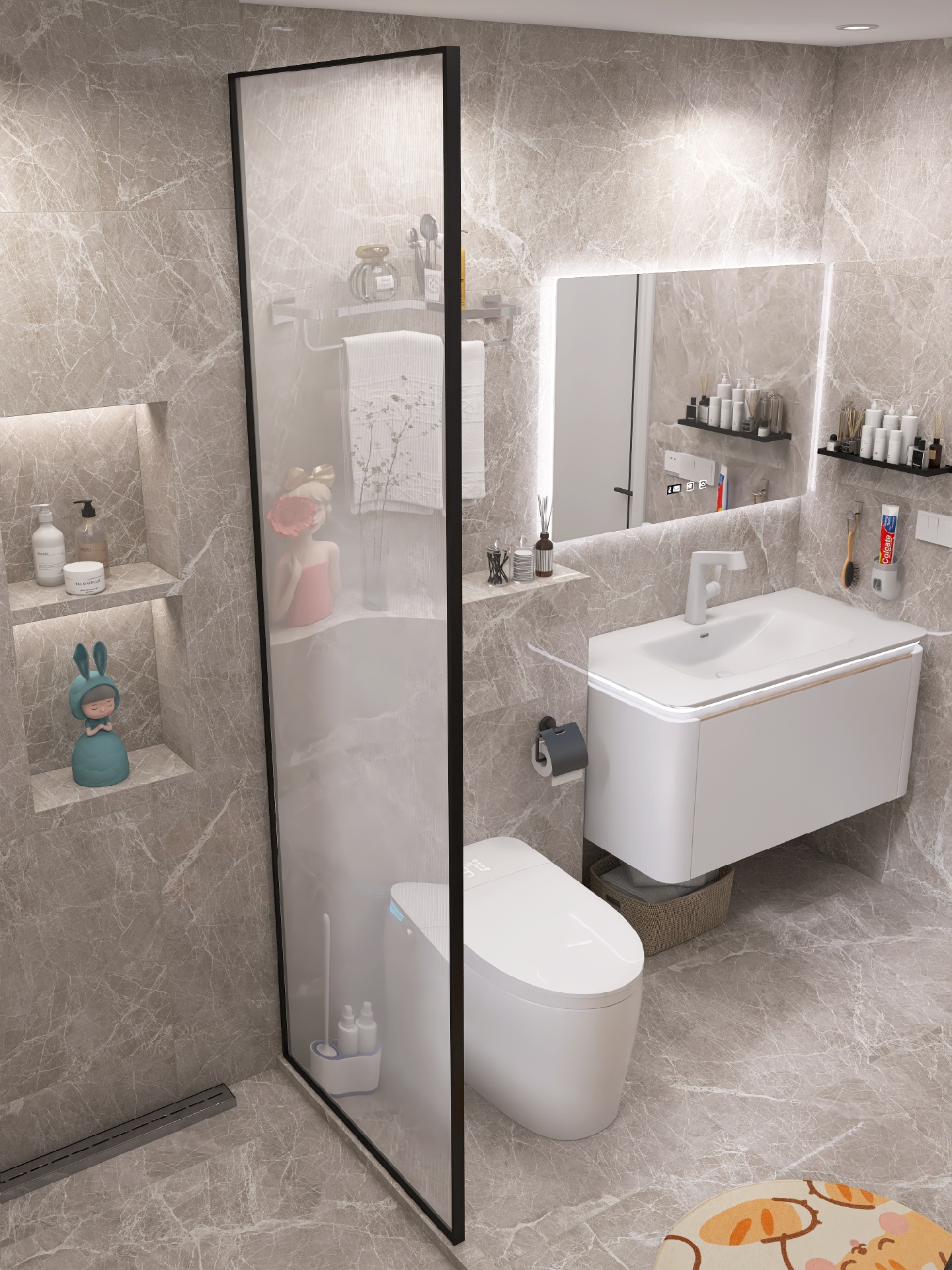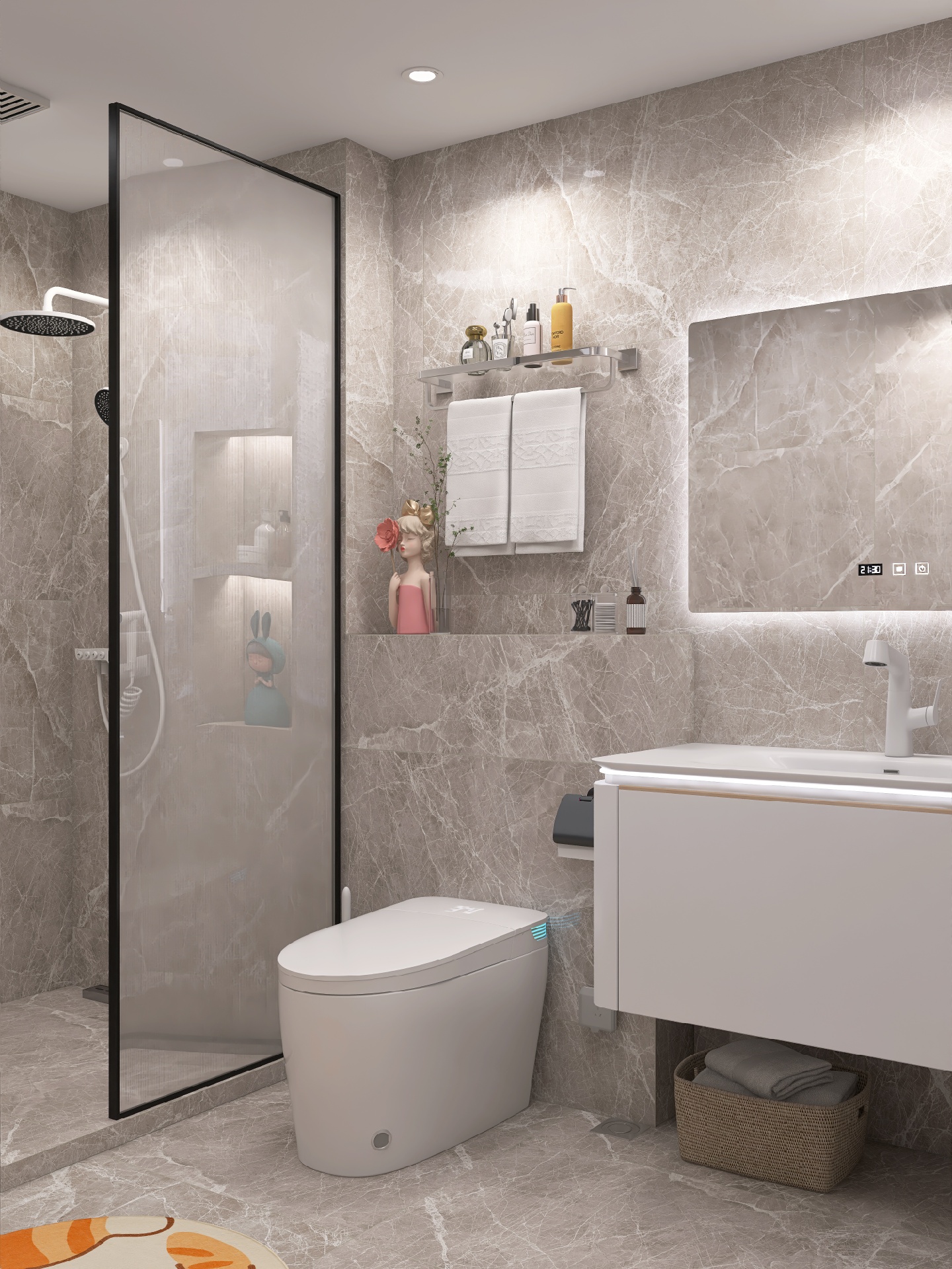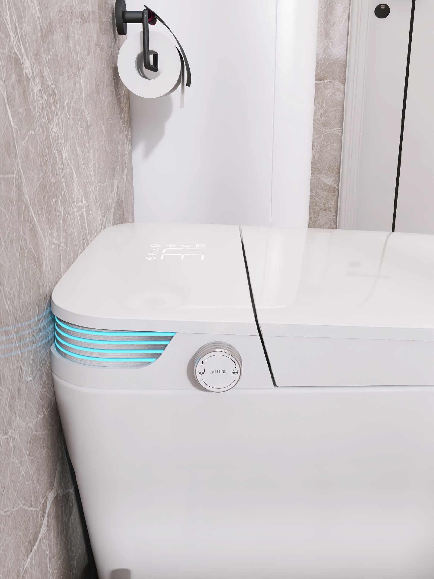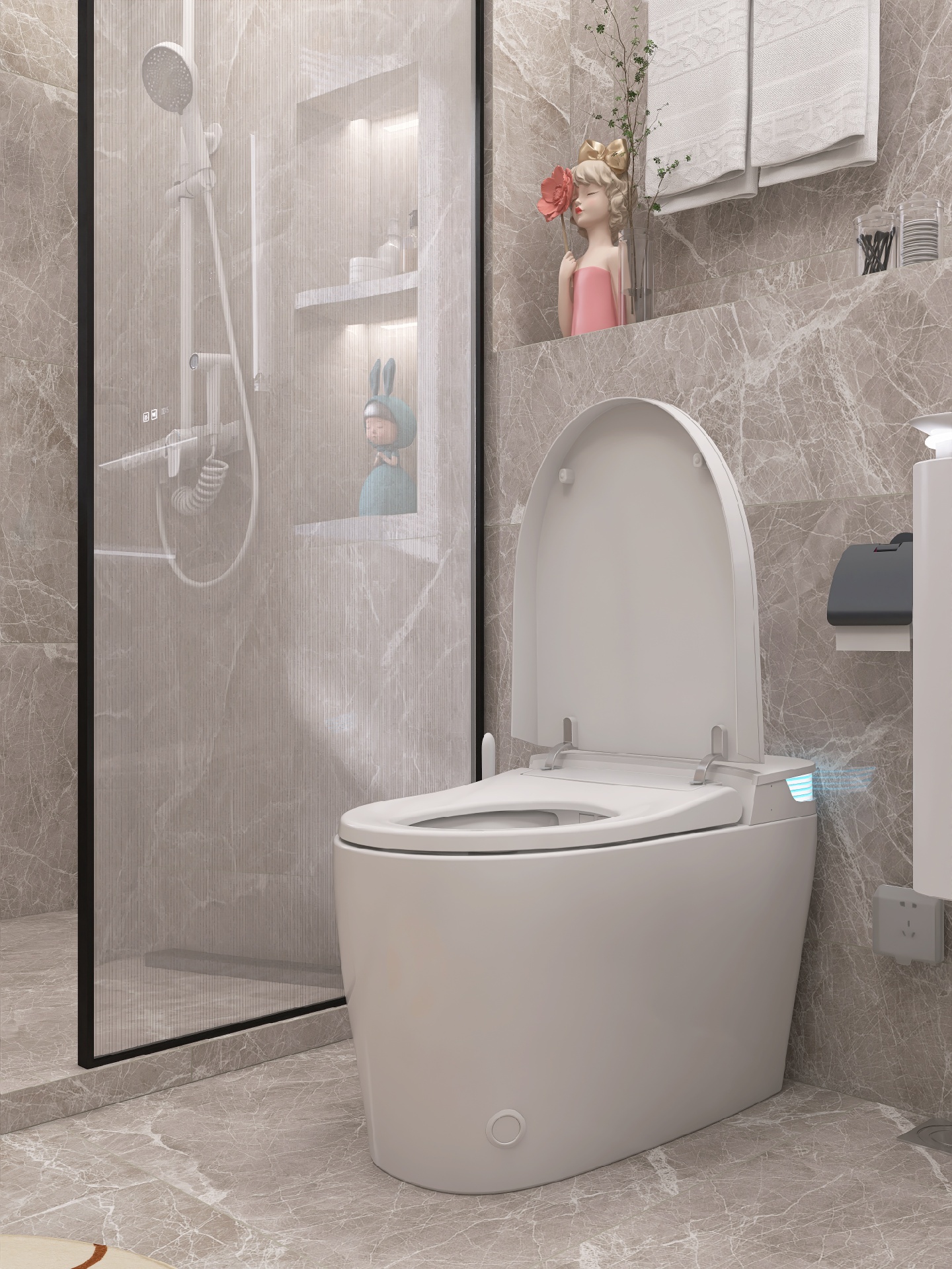 现代简约风装修设计功能至上,追求实用性,同时也要兼顾颜值,智能马桶我选的是蔡妃家的,卫浴界的天花板,白色陶瓷釉面和浴室瓷砖一样光滑靓丽✨,相呼应很搭配。尾部的蓝色氛围灯酷毙了,白色无边的显示屏也是突.破传.统,还有AI语.音控制功能,chao级赞。