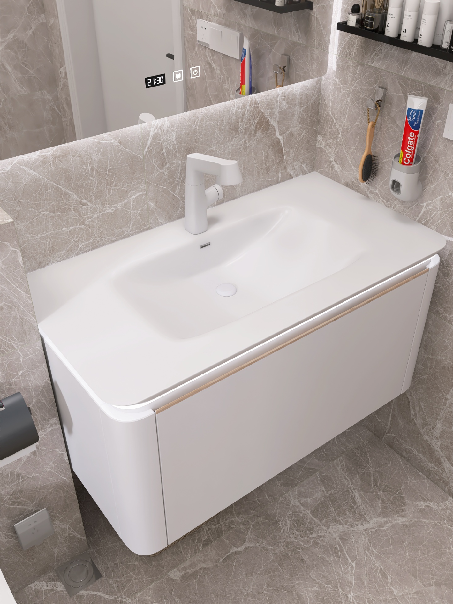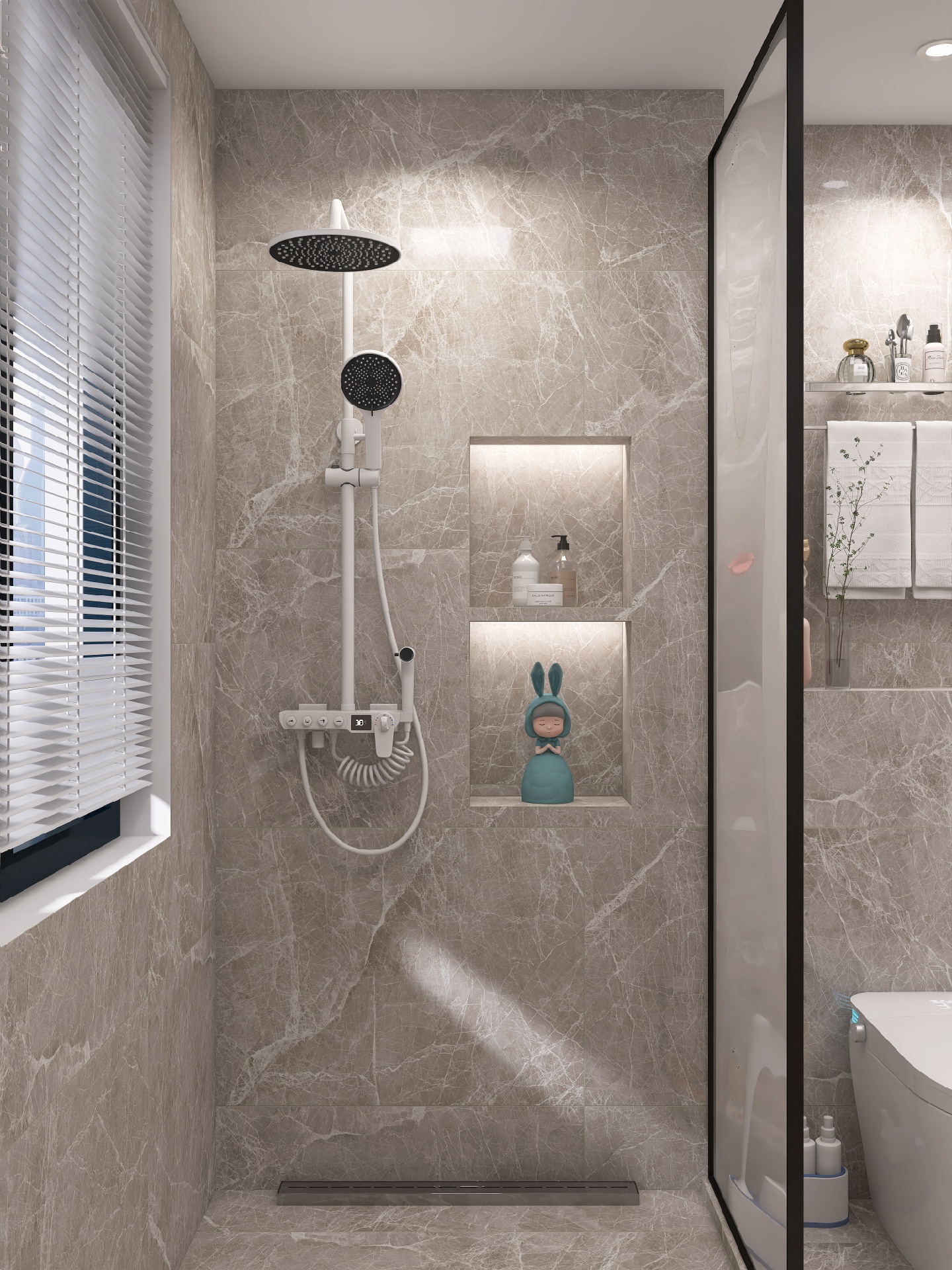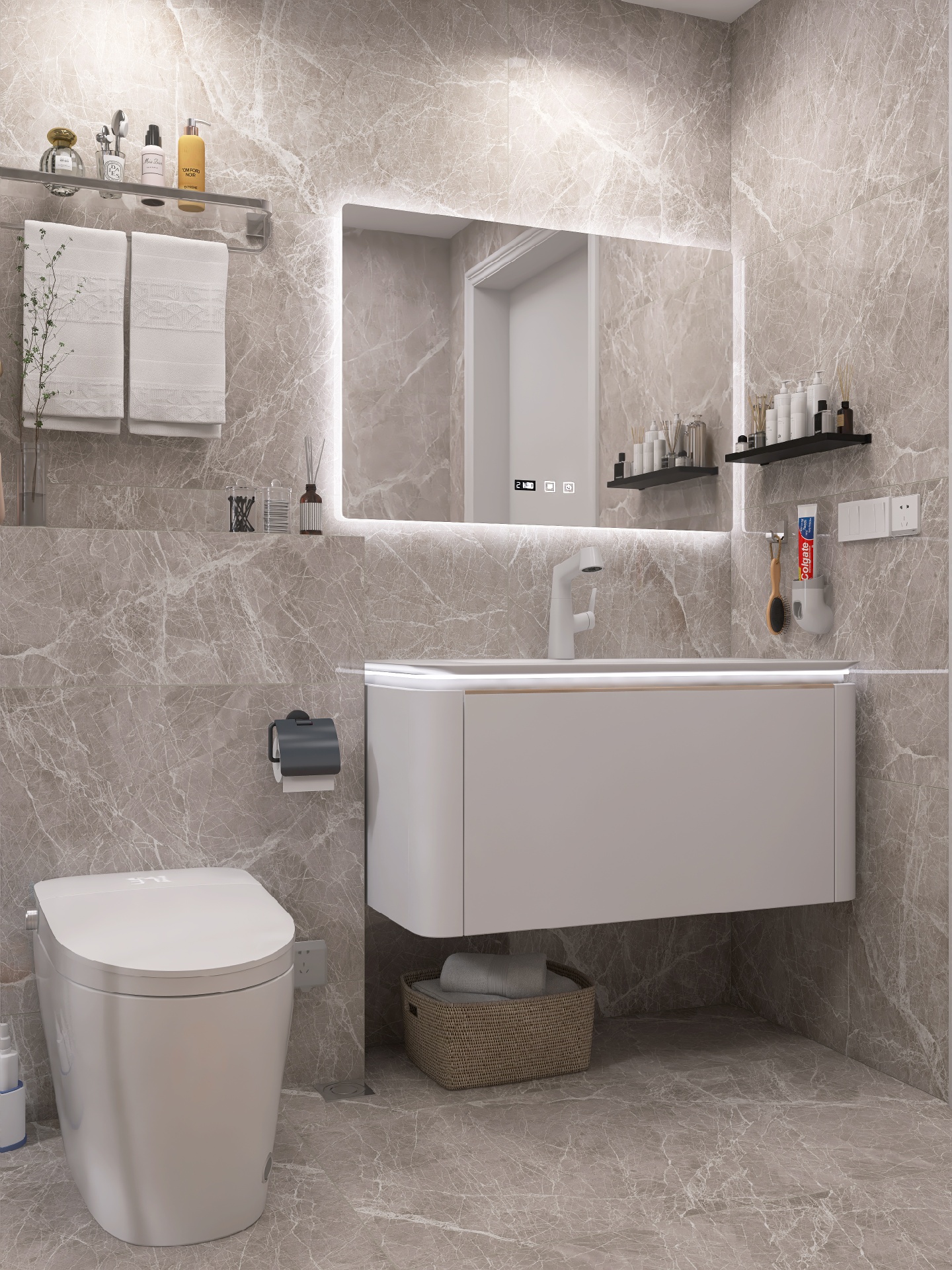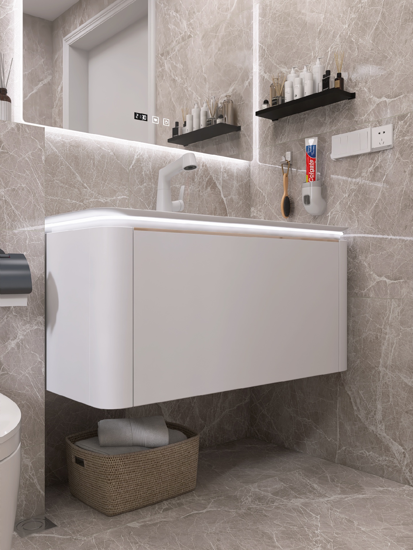 现代简约风装修设计功能至上,追求实用性,同时也要兼顾颜值,智能马桶我选的是蔡妃家的,卫浴界的天花板,白色陶瓷釉面和浴室瓷砖一样光滑靓丽✨,相呼应很搭配。尾部的蓝色氛围灯酷毙了,白色无边的显示屏也是突.破传.统,还有AI语.音控制功能,chao级赞。