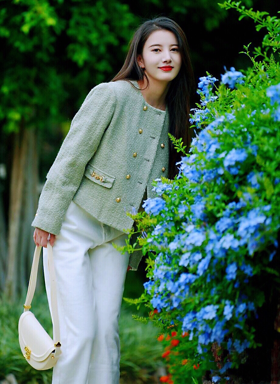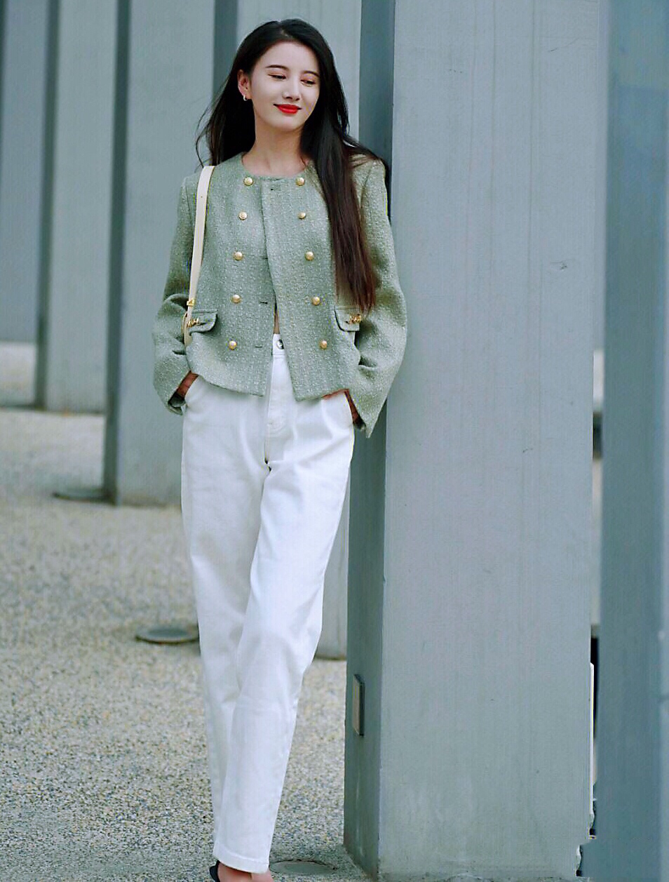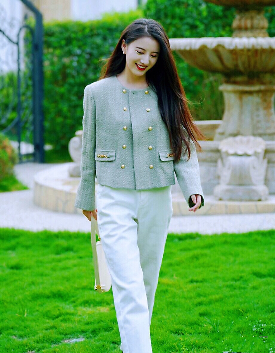 秋天第一天,穿上绿色小香风外套搭配白色牛仔裤,简约时尚~
