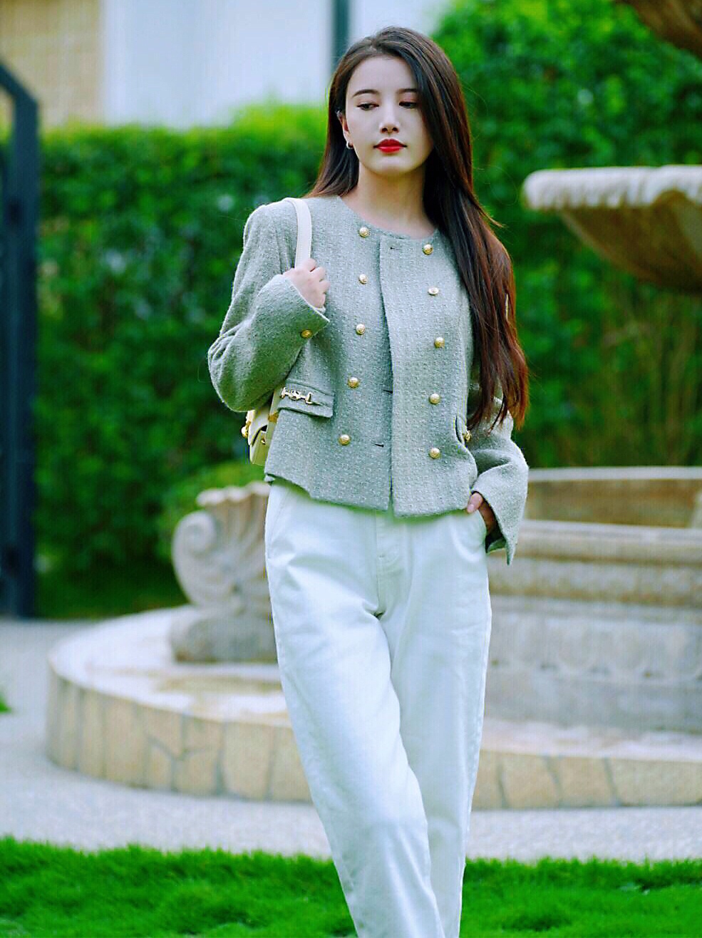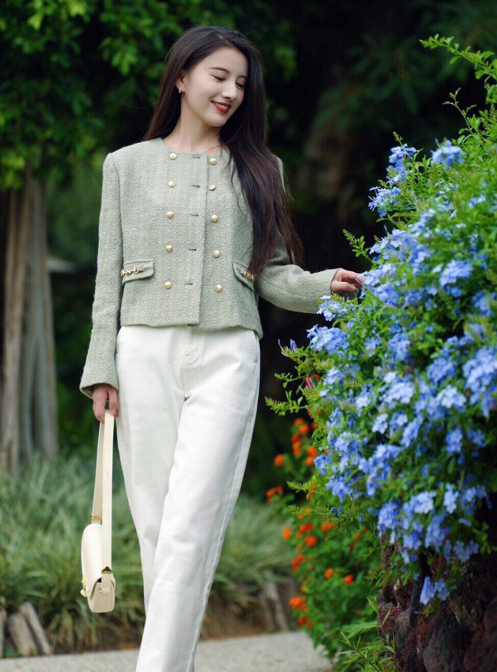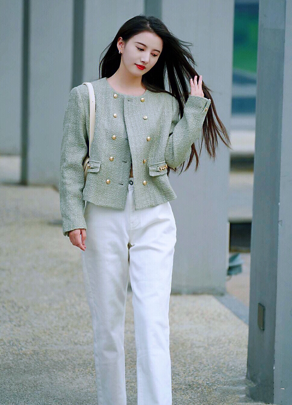 秋天第一天,穿上绿色小香风外套搭配白色牛仔裤,简约时尚~