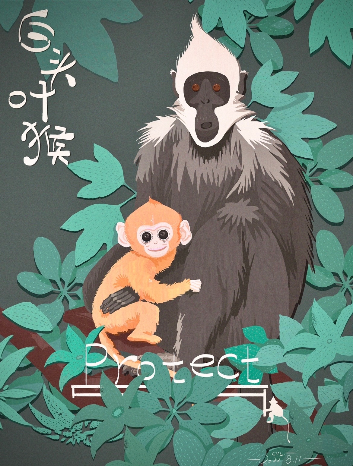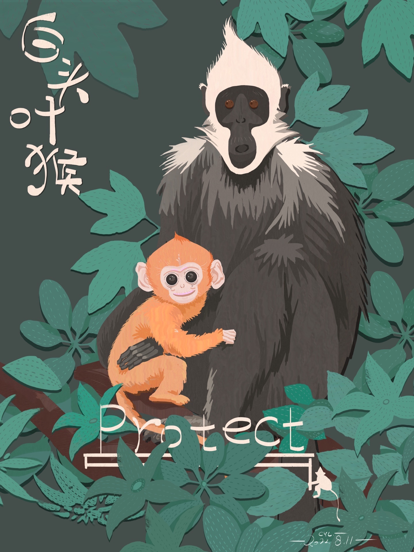 画的公益海报,濒危物种白头叶猴小时候居然是金色的诶!