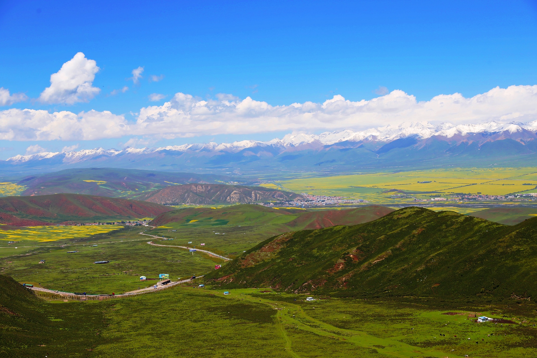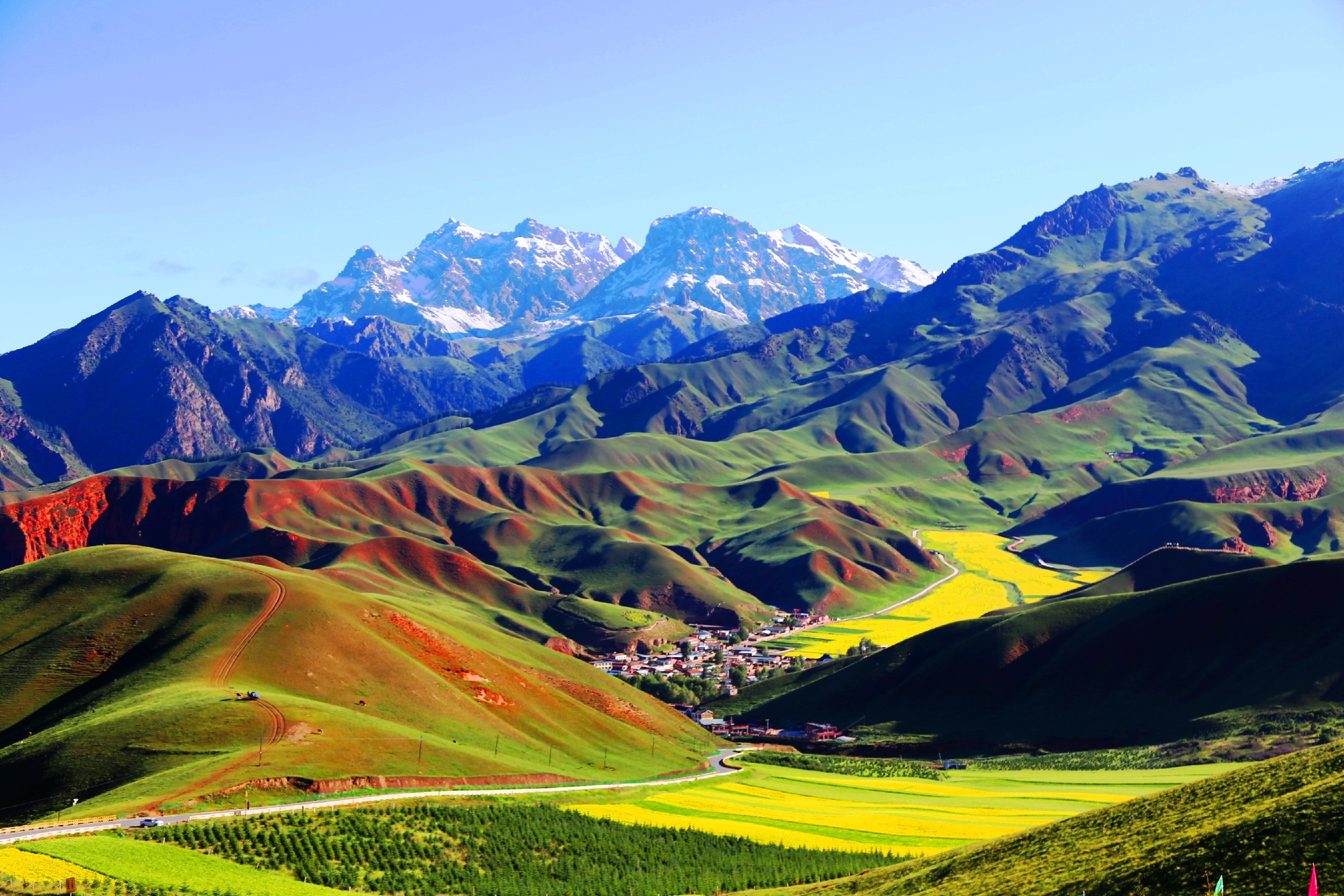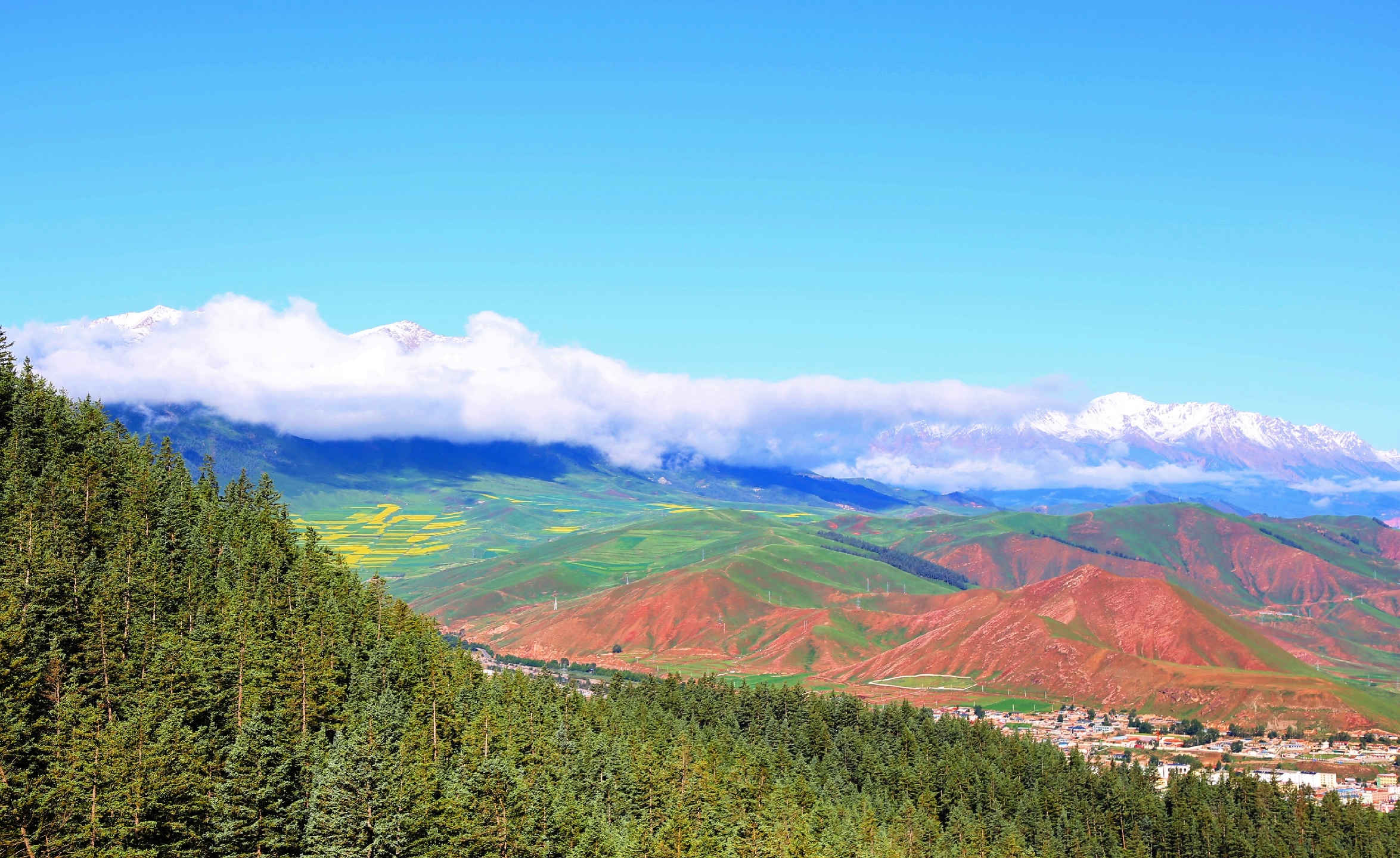 大美青海,连绵卓尔山脉像一块彩色画布,白色雪山绿色青山黄色油菜花红色岩土层层叠叠,俨然像一幅精美的油画,美不胜收!站在卓尔山顶视野极度开阔,山对面是一山尽览四季景色的牛心山,左右两侧分别是拉洞峡和白杨沟风景区,背面是连绵起伏的祁连山,山脚下滔滔八宝河像一条白色的哈达环绕在县城周边。处处美景,宛如仙境,令人心旷神怡。