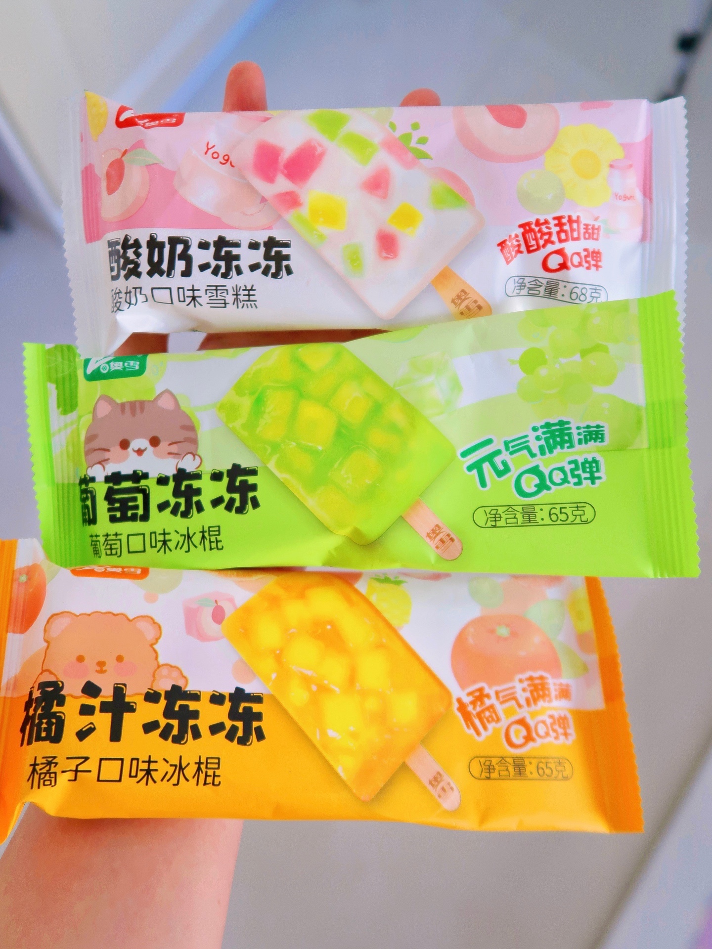 之前总能刷到有人推荐酸奶冻冻雪糕,我终于买到了,坐标沈阳,批发才八毛!而且我发现它一系列还有葡萄冻冻和橘汁冻冻,都买回来啦,一次性吃三根都不心疼~