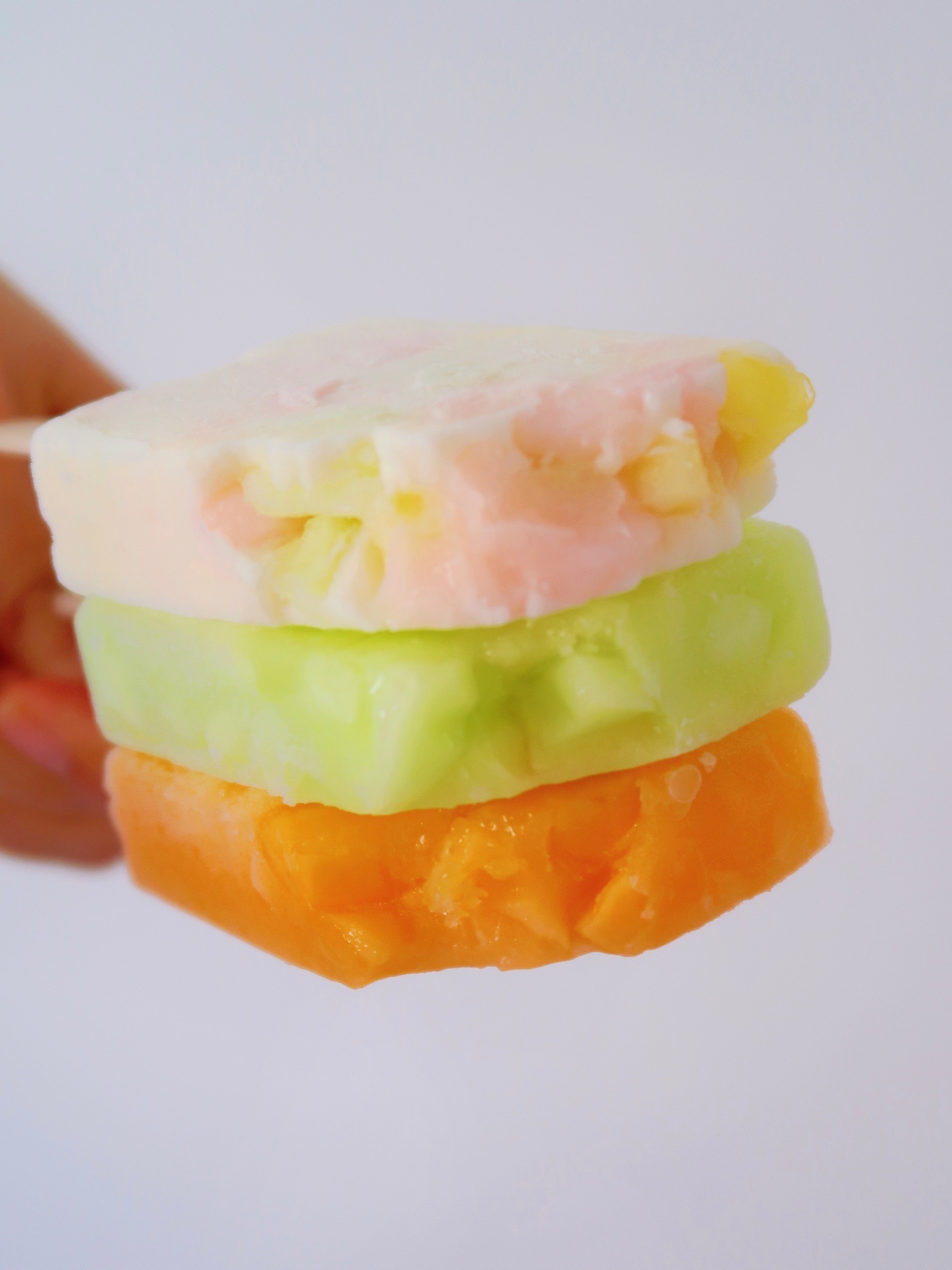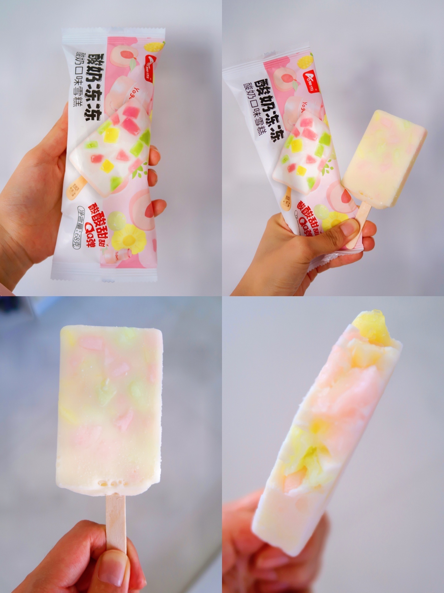 这根真的非常好吃‼️酸奶是乳酸菌的味道,里面有三种口味的冻冻,粉色是桃子的🍑,绿色是葡萄的🍇,黄色是菠萝的🍍,冻冻非常多,每一口都能吃到,性价比超高~这款我真的会无限回购!