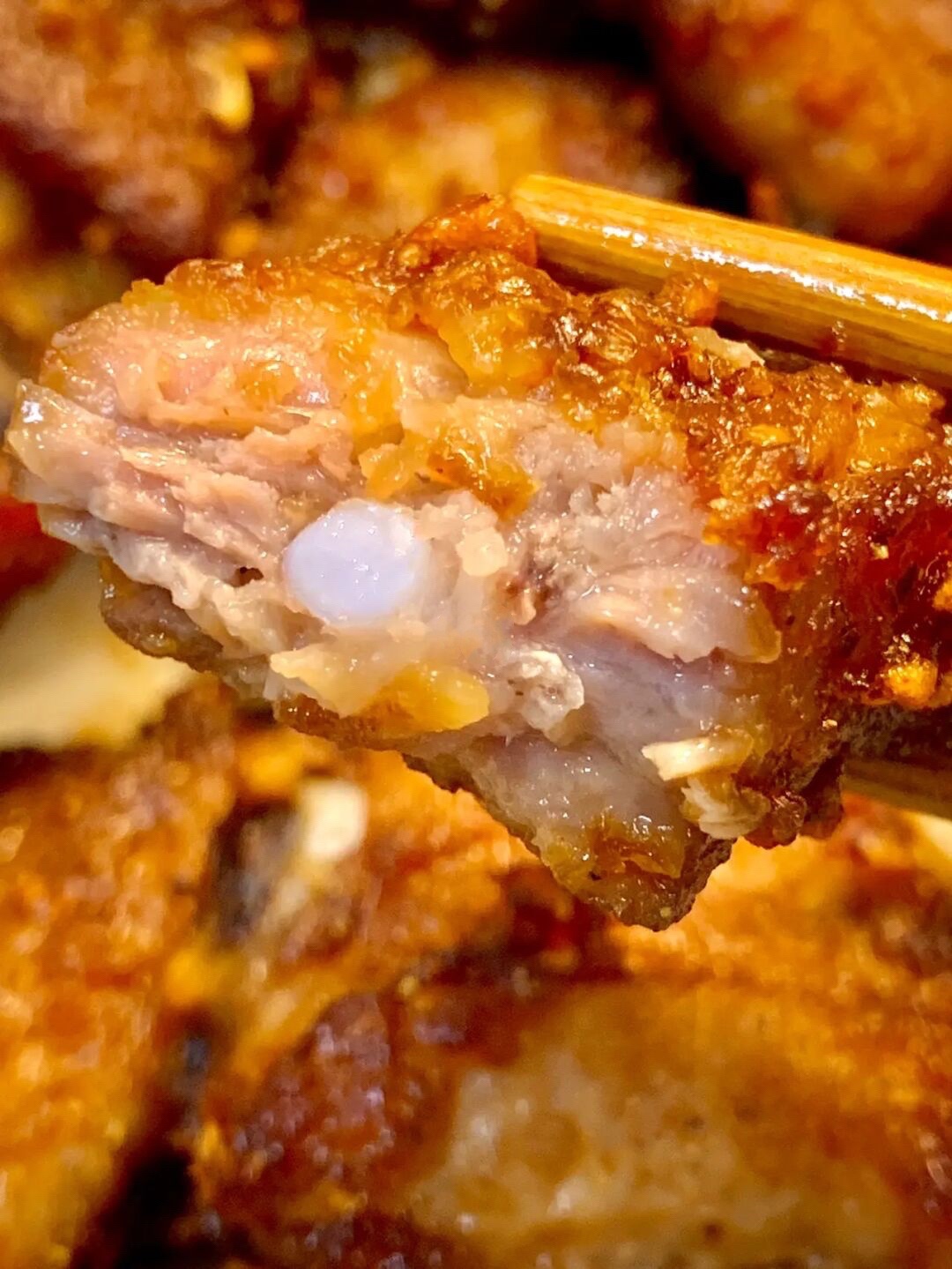 2️⃣油温烧至六层热(筷子放下去边缘有密集气泡)时下排骨,一面炸制成型后再缓慢翻动(一面附着在表面的蒜末脱落),全程效果炸制表面金黄捞出,大概6.7分钟左右(具体时间根据排骨大小和火候调整哈)。