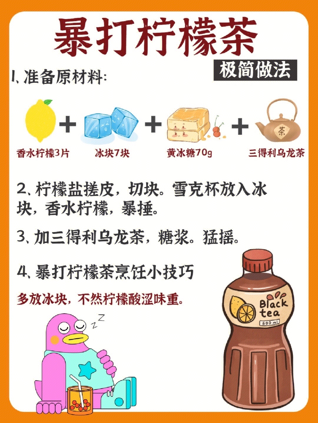 4⃣️暴打柠檬茶的烹饪技巧多放冰块,不然柠檬酸涩味重。