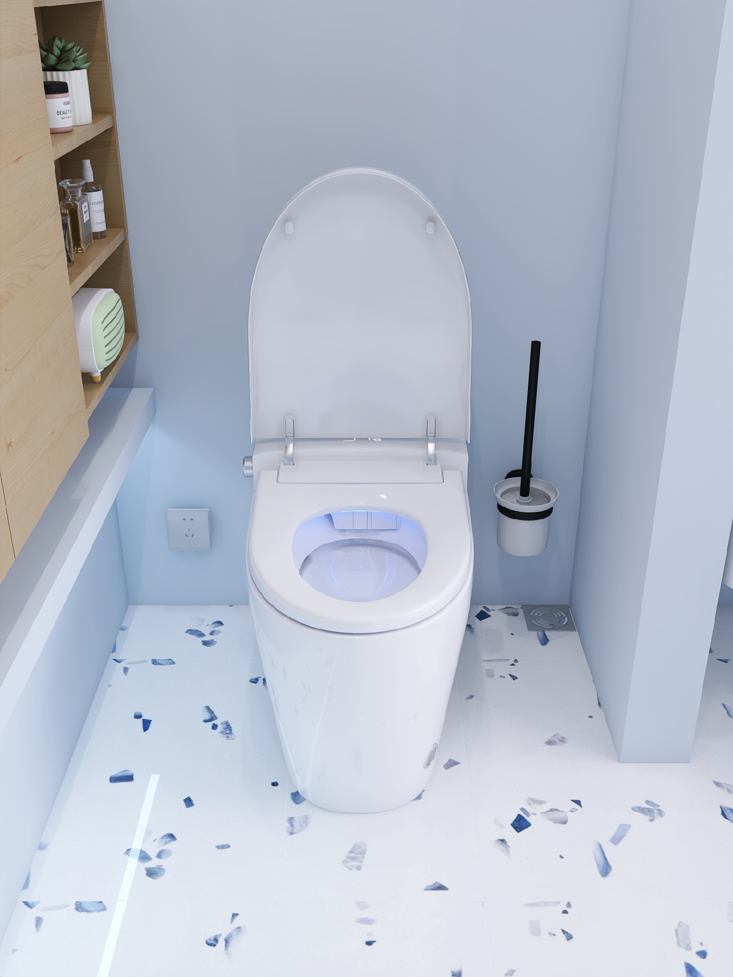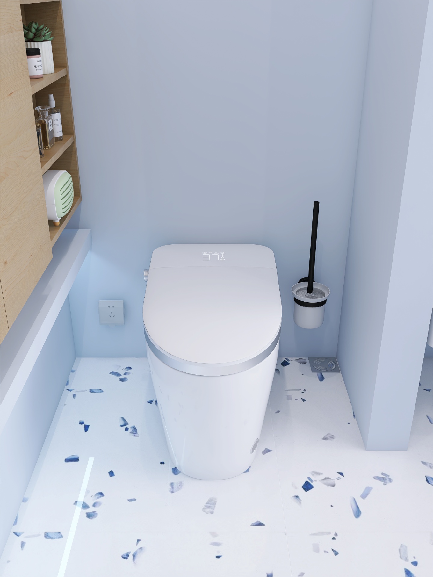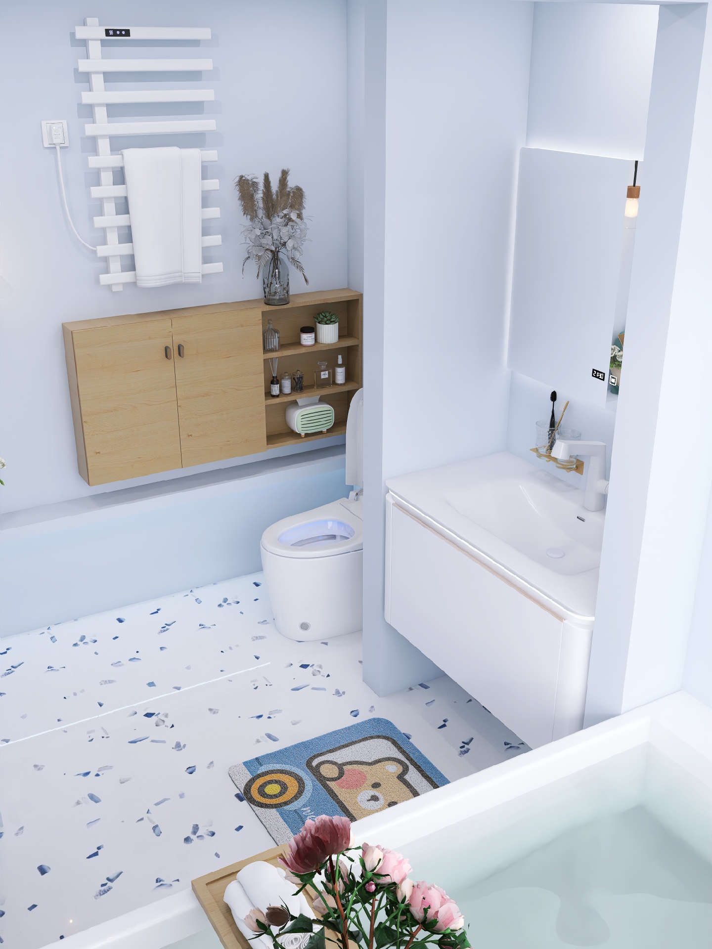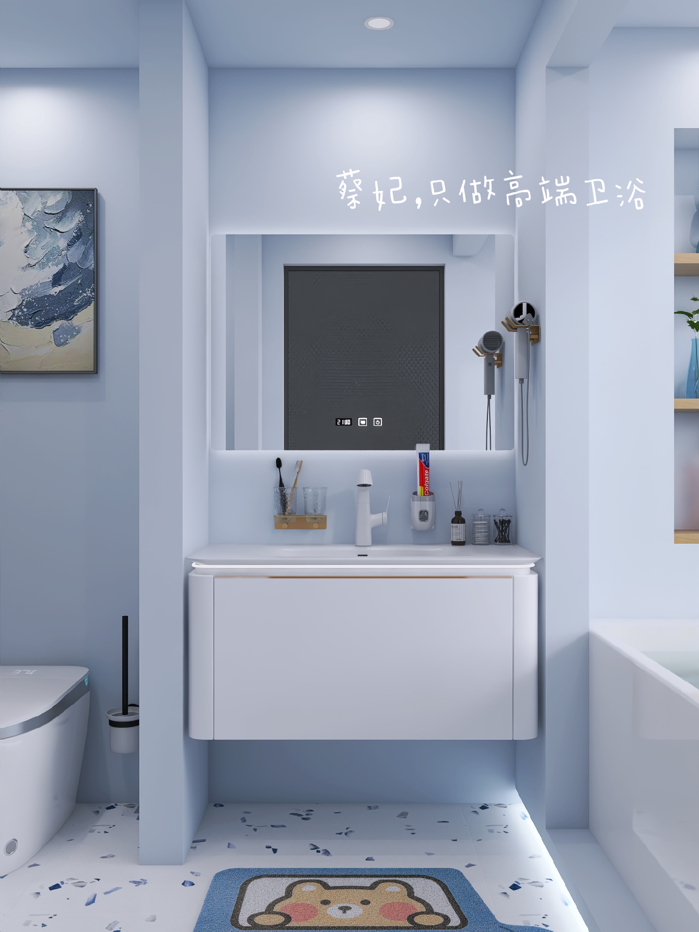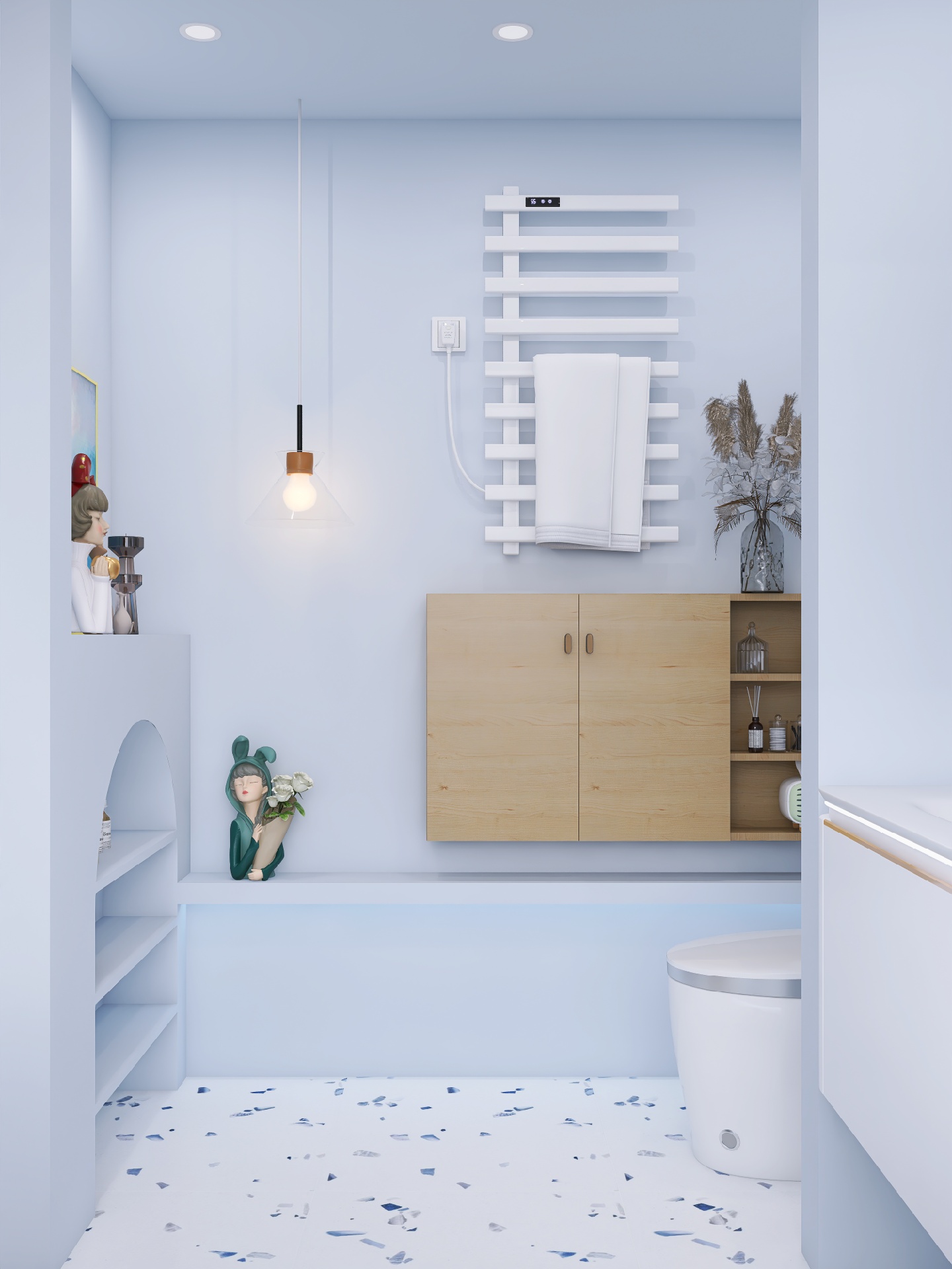 雾霾蓝带有一些灰度,比天蓝色内敛一些,更加沉稳,用来装修卫生间不夸张之余也不失特色。