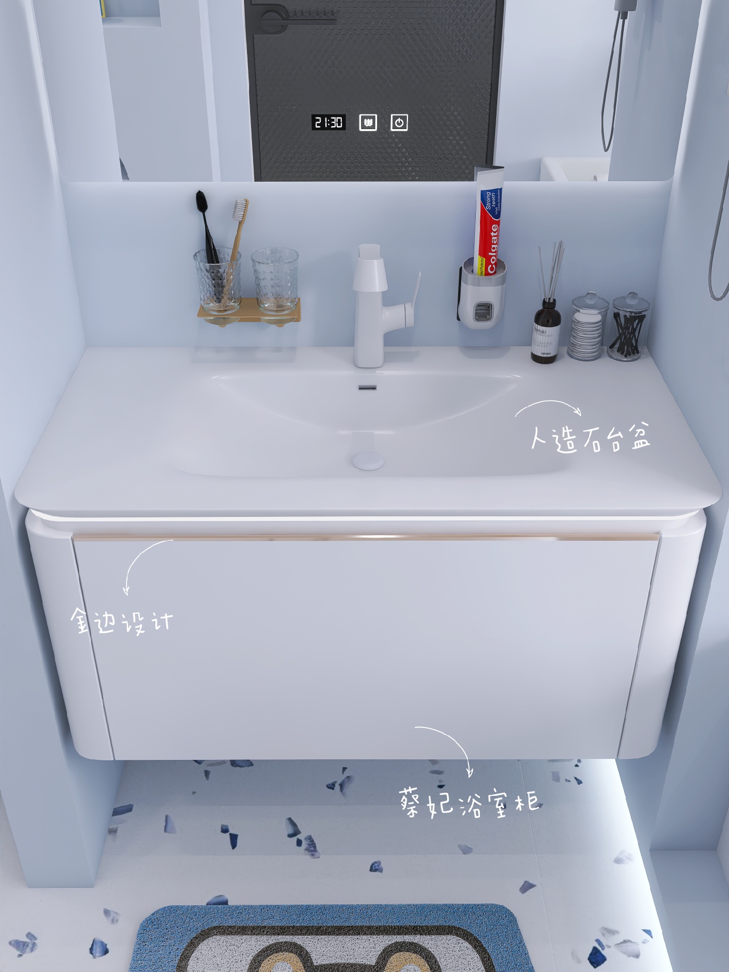 所选的纯白色浴室柜走的是北欧风,把手处的金边就已经拥有的欧式气息。