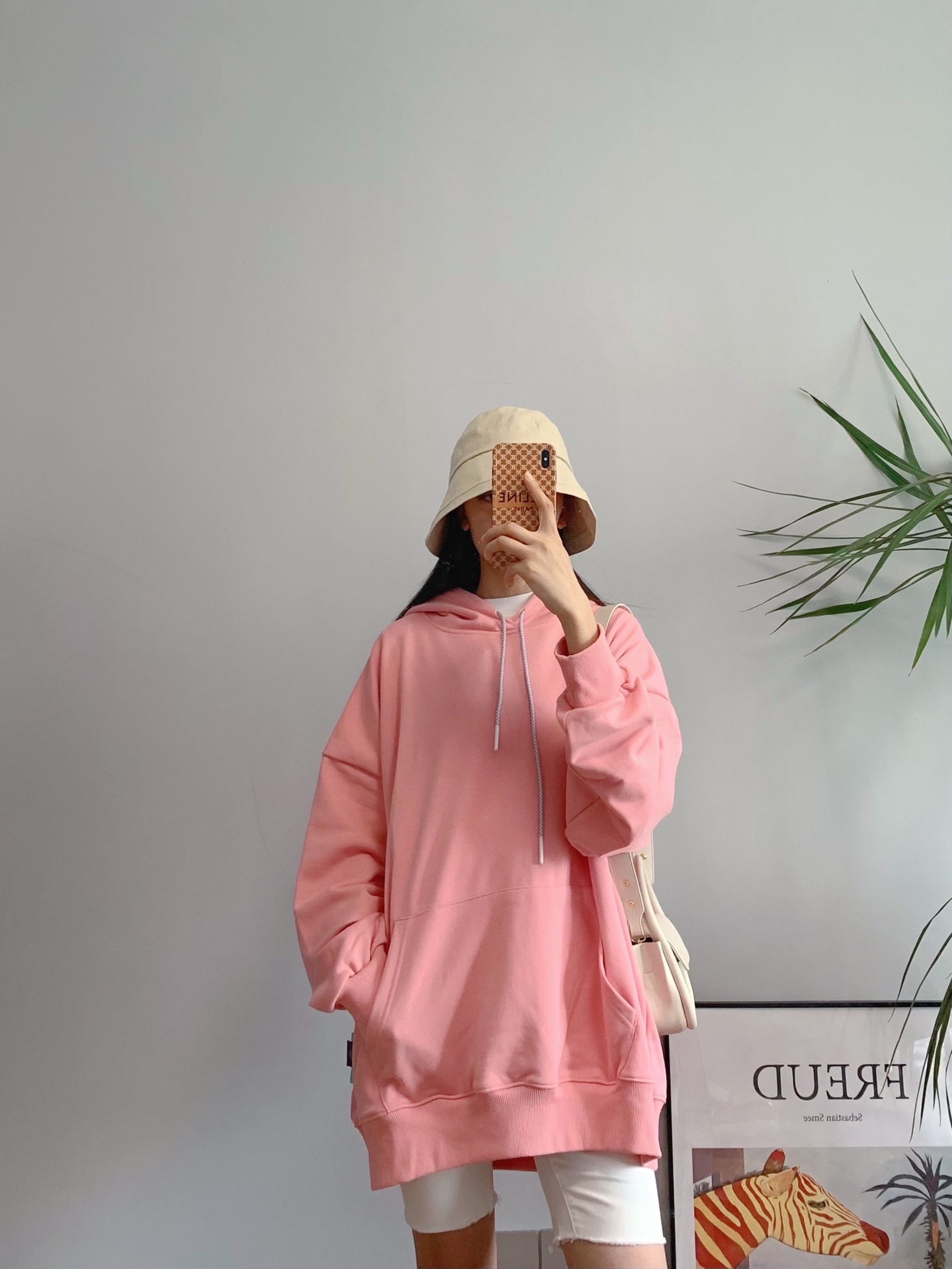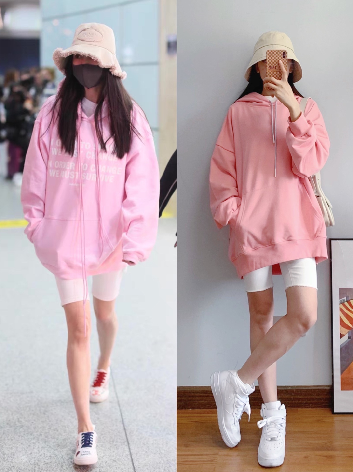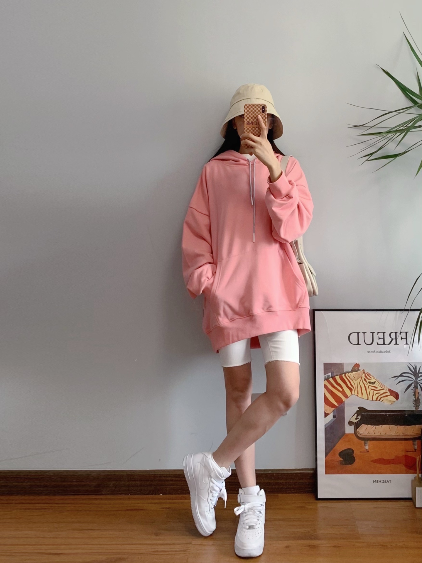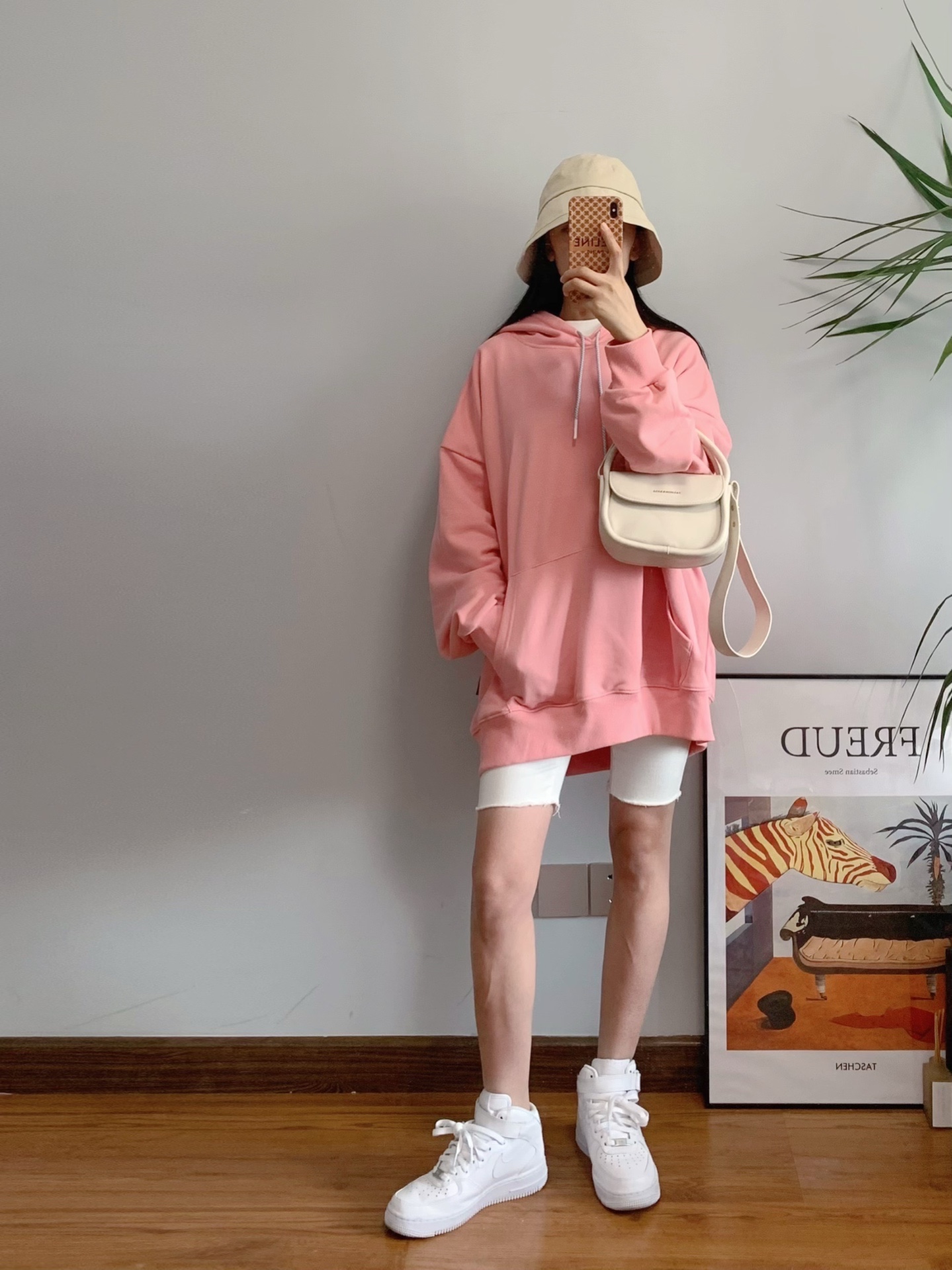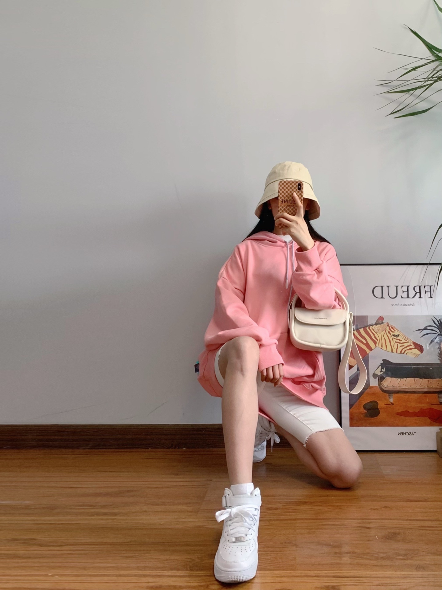 📝【粉色卫衣➕内搭T恤➕白色高腰紧身五分牛仔短裤➕白色运动鞋➕浅棕色渔夫帽】