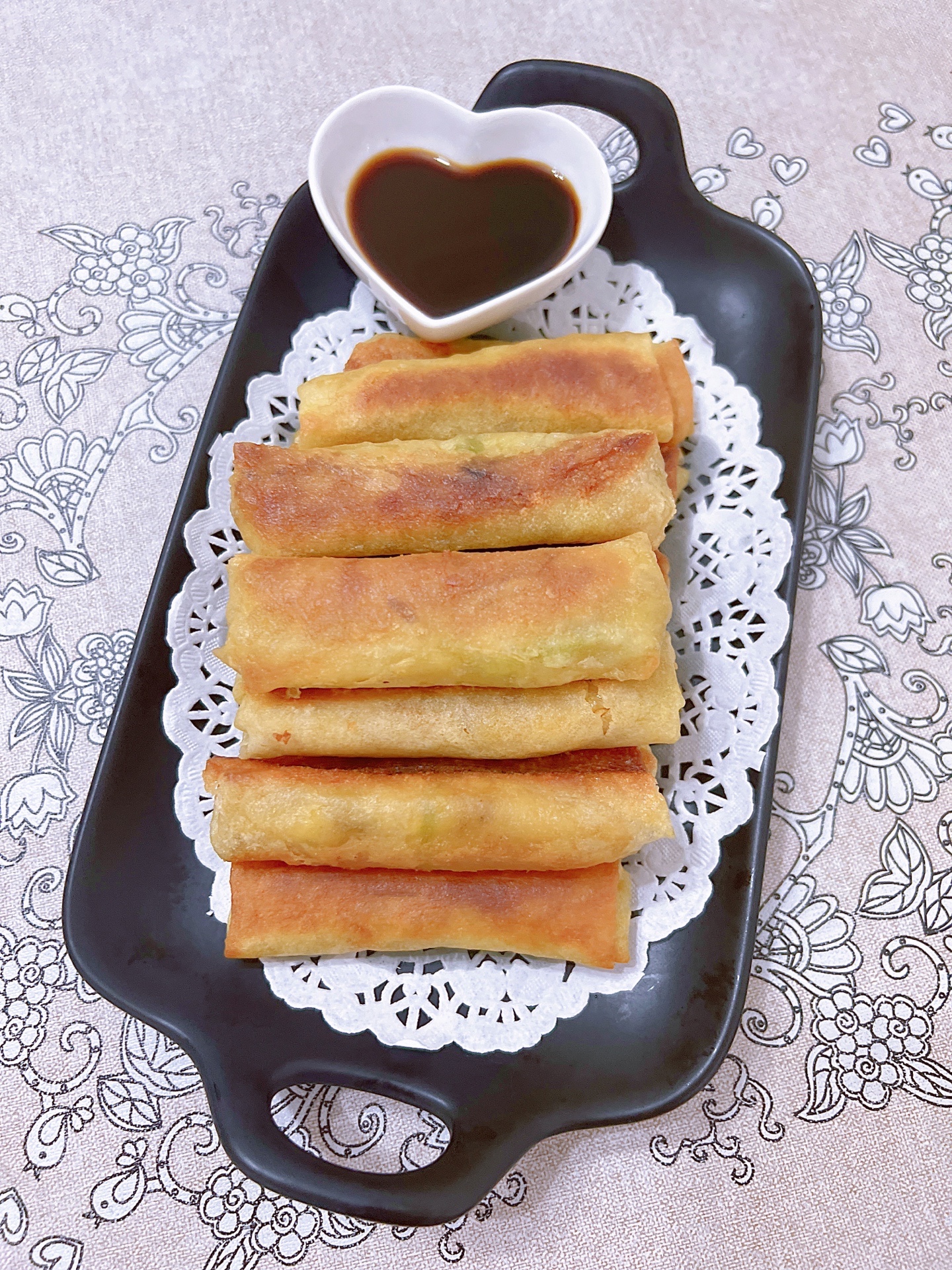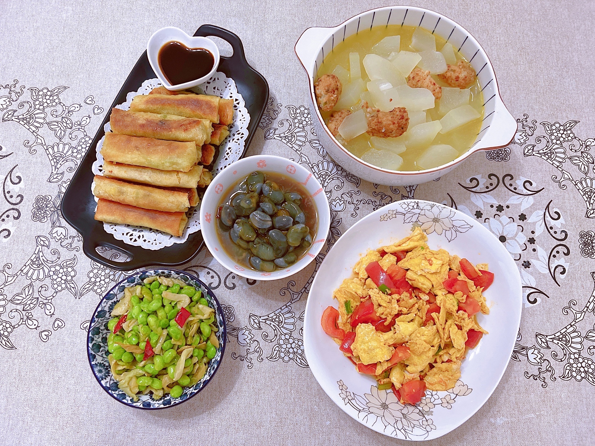 晚餐:煎春卷、番茄炒蛋、毛豆炒菜瓜干、冬瓜肉丸汤