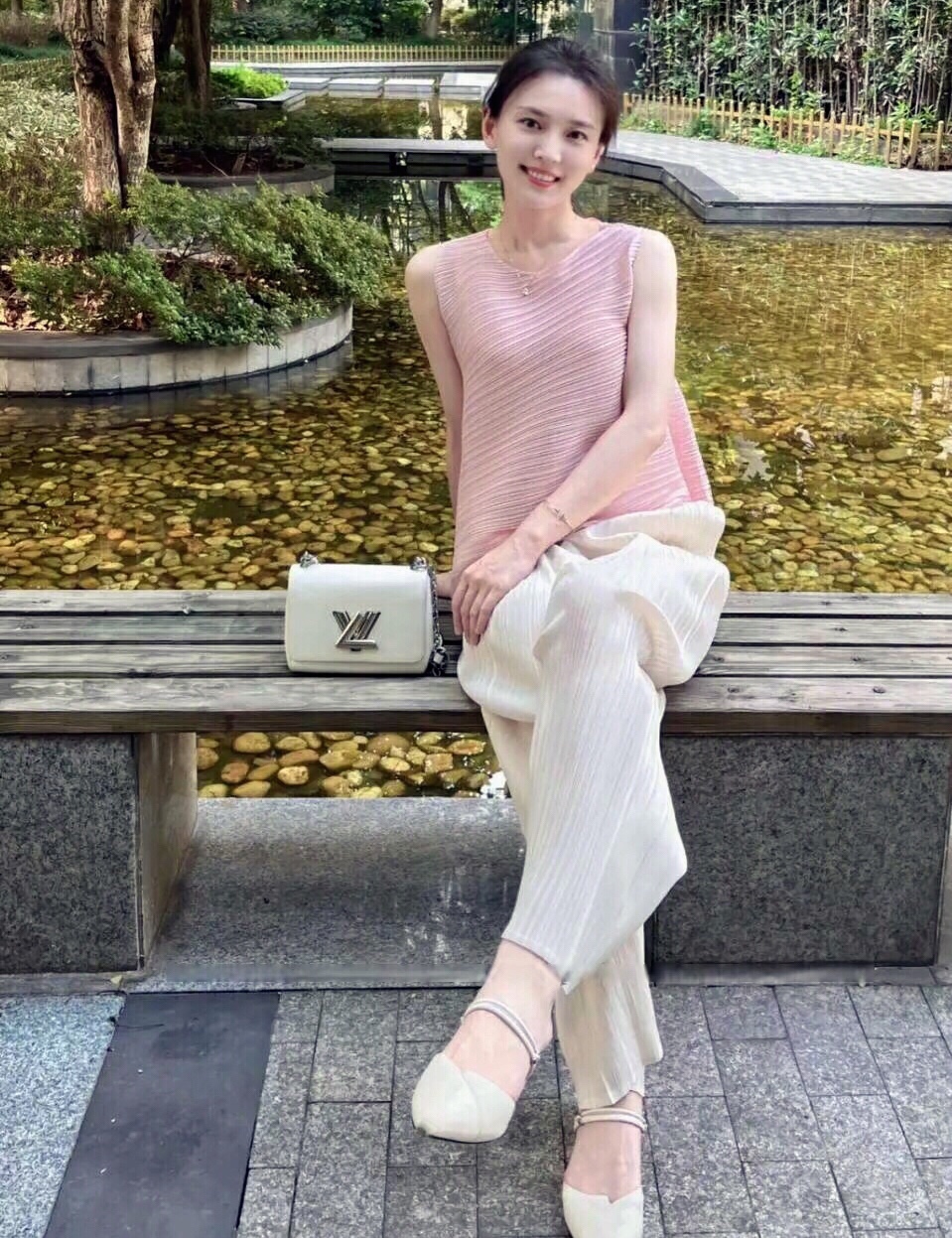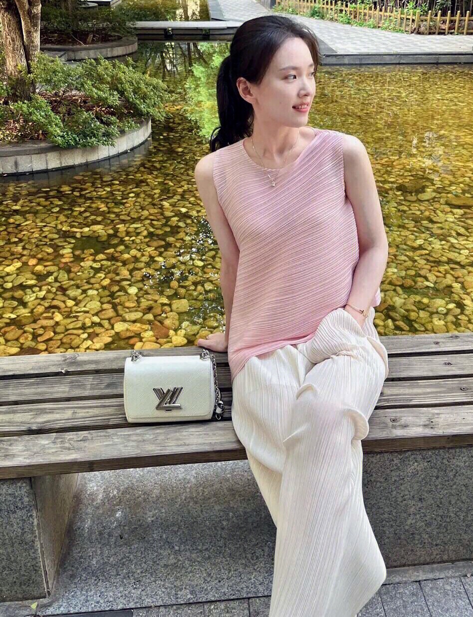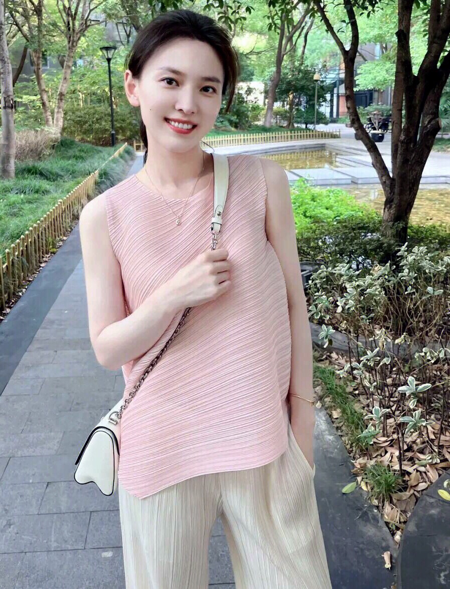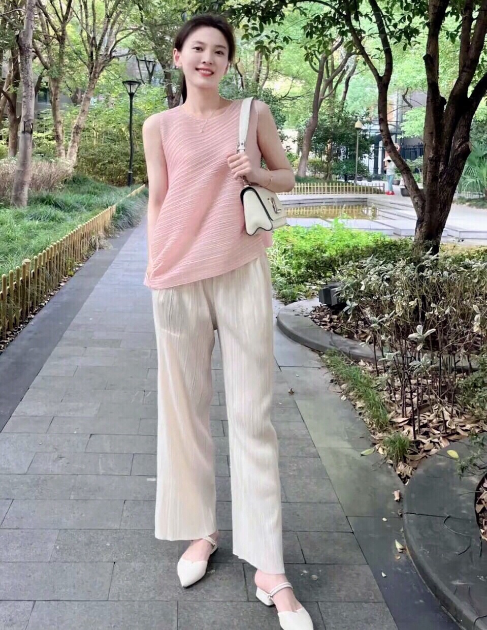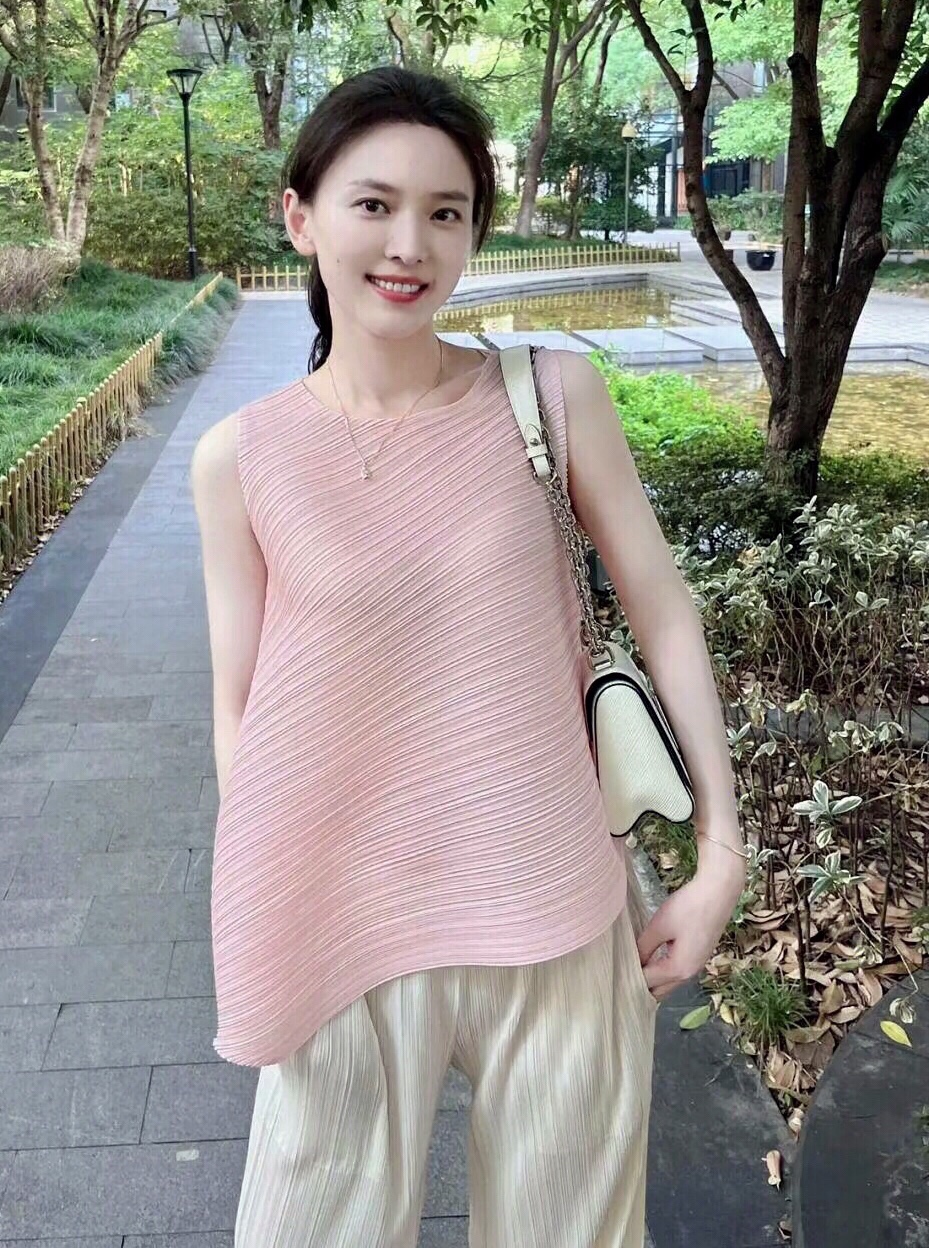 这件粉色无袖上衣搭配白色的阔腿裤,对于梨形身材的女性非常好看,值得大家尝试。