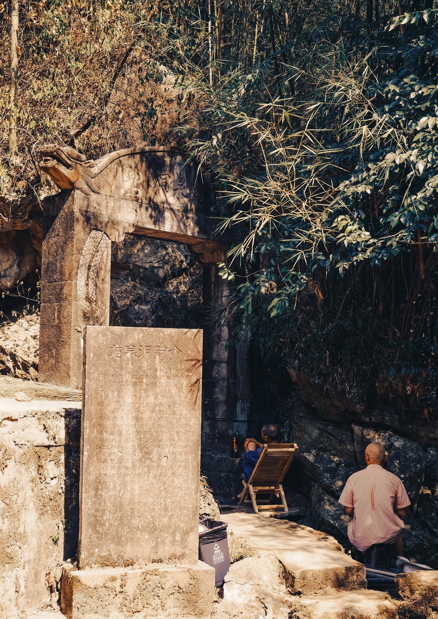 洞外已经有人乘凉了,穿过石牌坊,走进去,一阵冷风吹过,带着洞内的湿润水汽,凉凉的,就像“天然空调”一样,特别适合夏日避暑🌿。一时间,成为近期遭受连续高温炙烤的当地居民追寻的梦想,他们有的在里面打牌、下棋,也有的人在小憩。