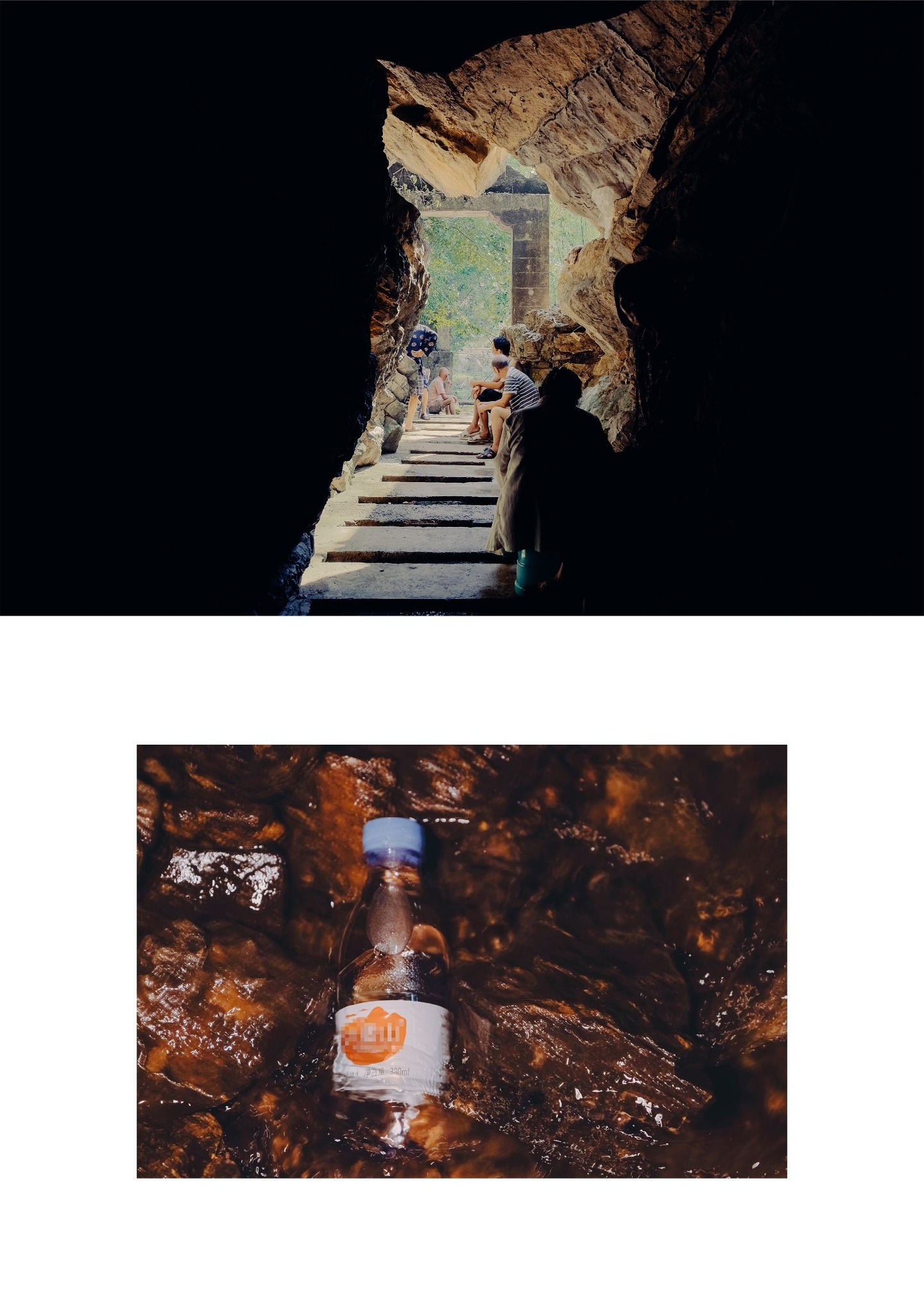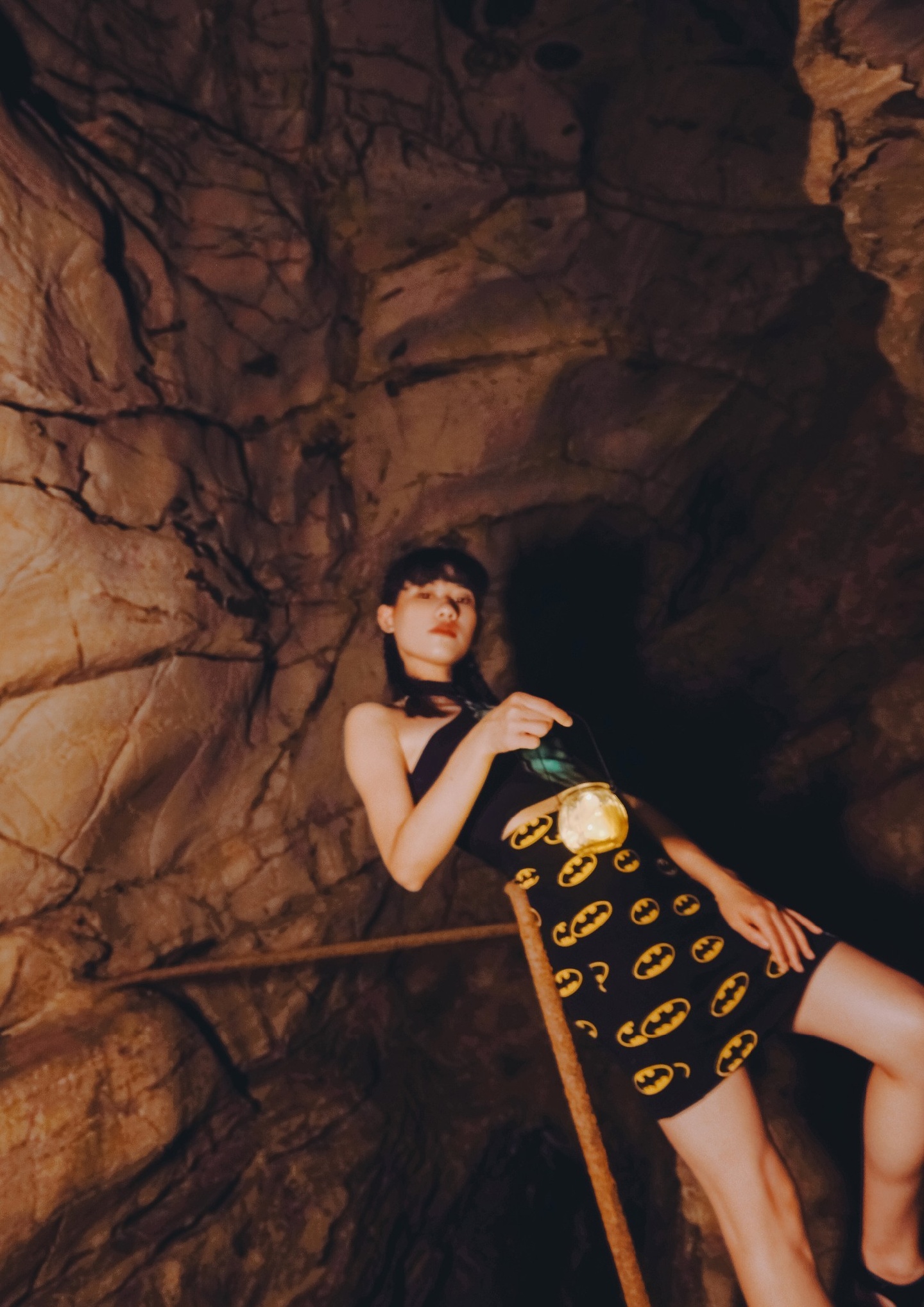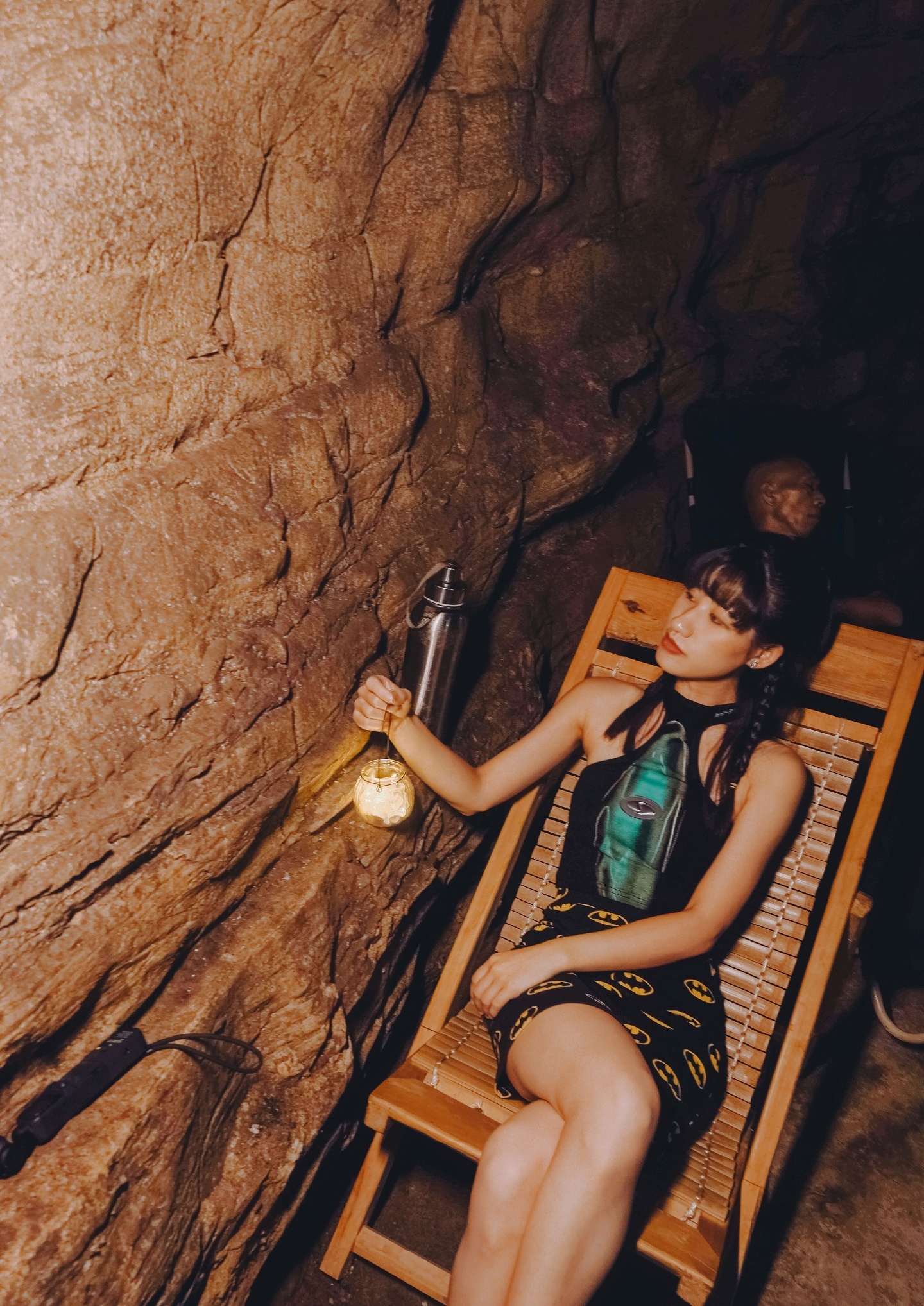 胆大的Pom Pom执意上二层探索,里面漆黑一片,全靠手里的强光手电筒🔦照路。洞口栖息着鸽子这么大的蝙蝠🦇,感应到光,就四处乱飞,还有一只奶猫大小的老鼠🐭在岩壁上窜来窜去。不知为何,在洞内竟还有几张像模像样的石桌和石凳。再往下走,洞口变得越来越窄,仅容一个人通过,洞底有一个深不见底的水潭,潭面冒着幽幽的蓝光,潭里难道有水怪?哈哈哈,开玩笑的!