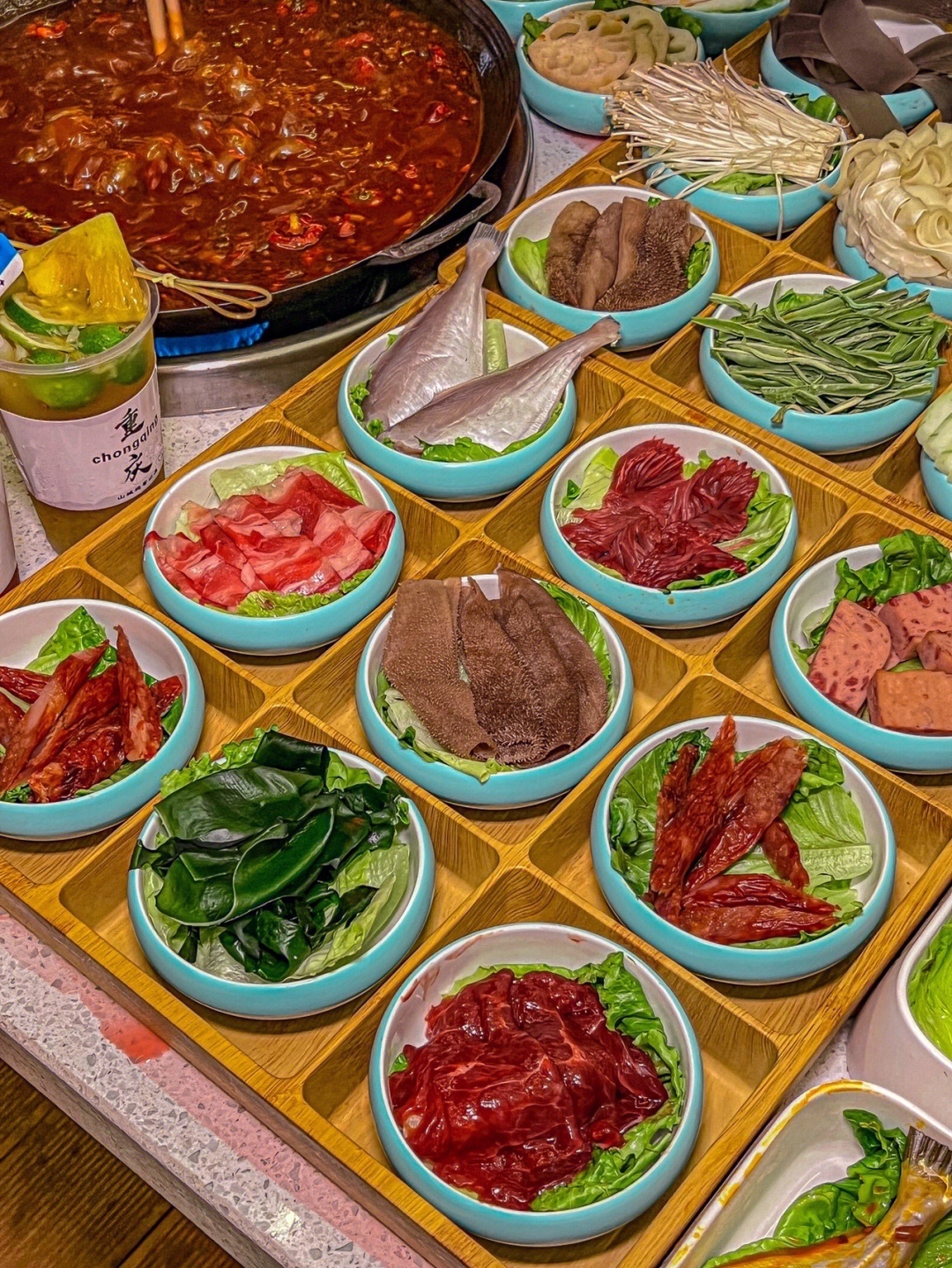 火锅菜可以直接点他家的九宫格,68r9个菜 128r18个菜,很爱他家的火箭鱿鱼和肥肠,其它菜品也hin新鲜~