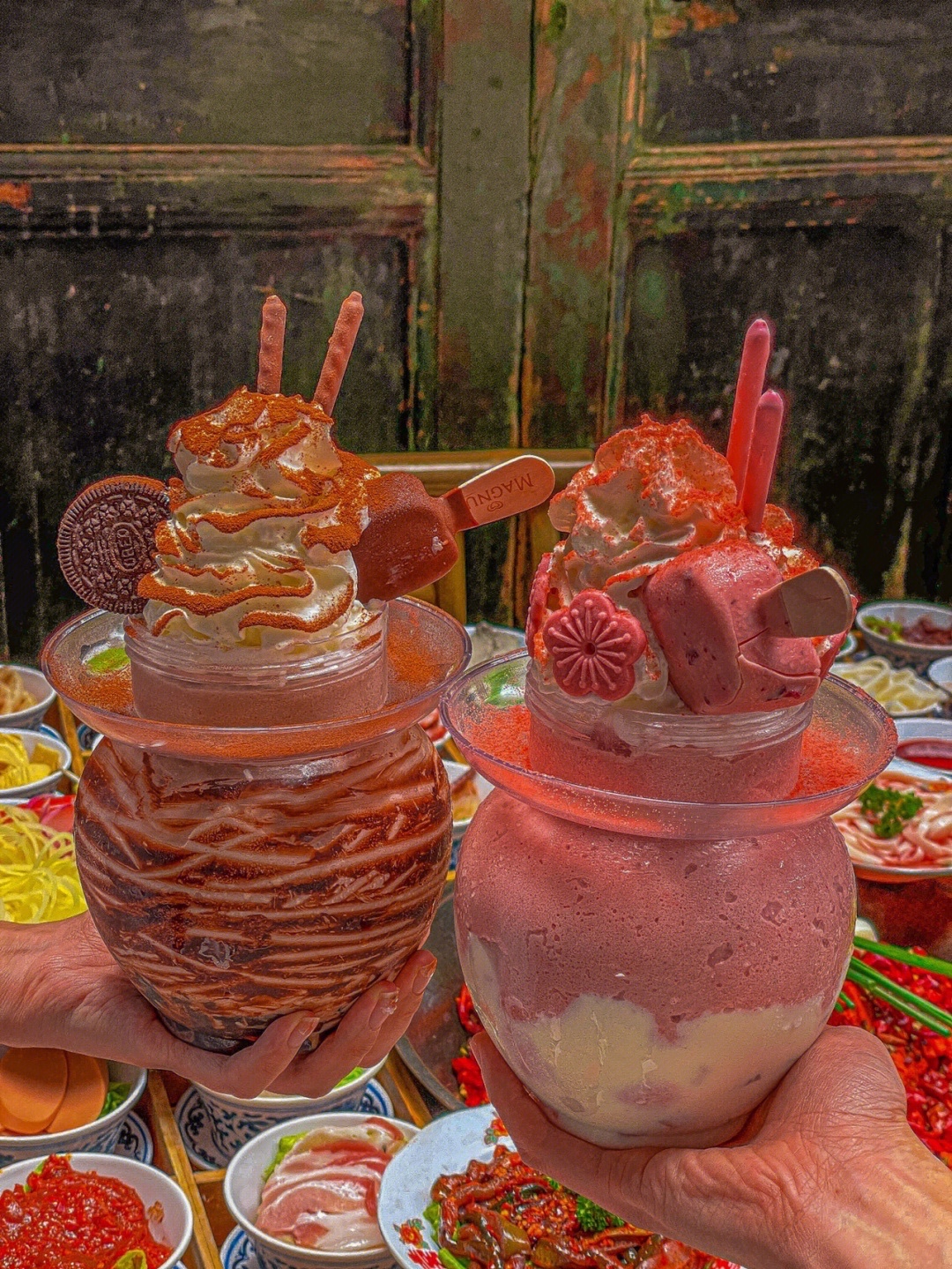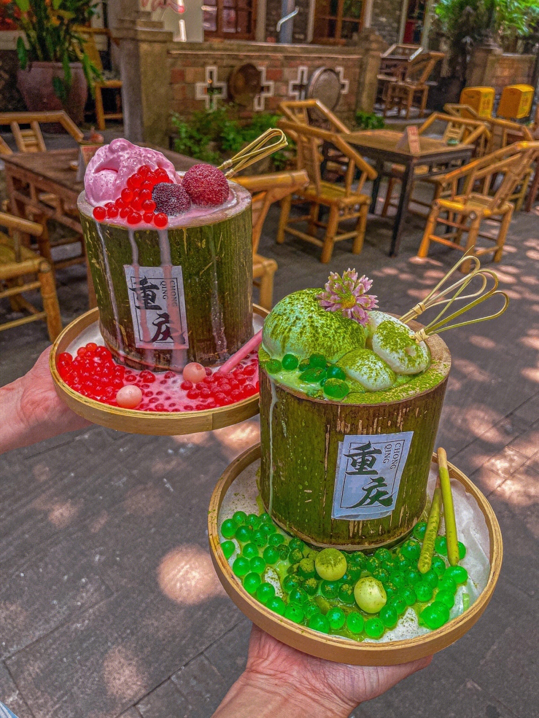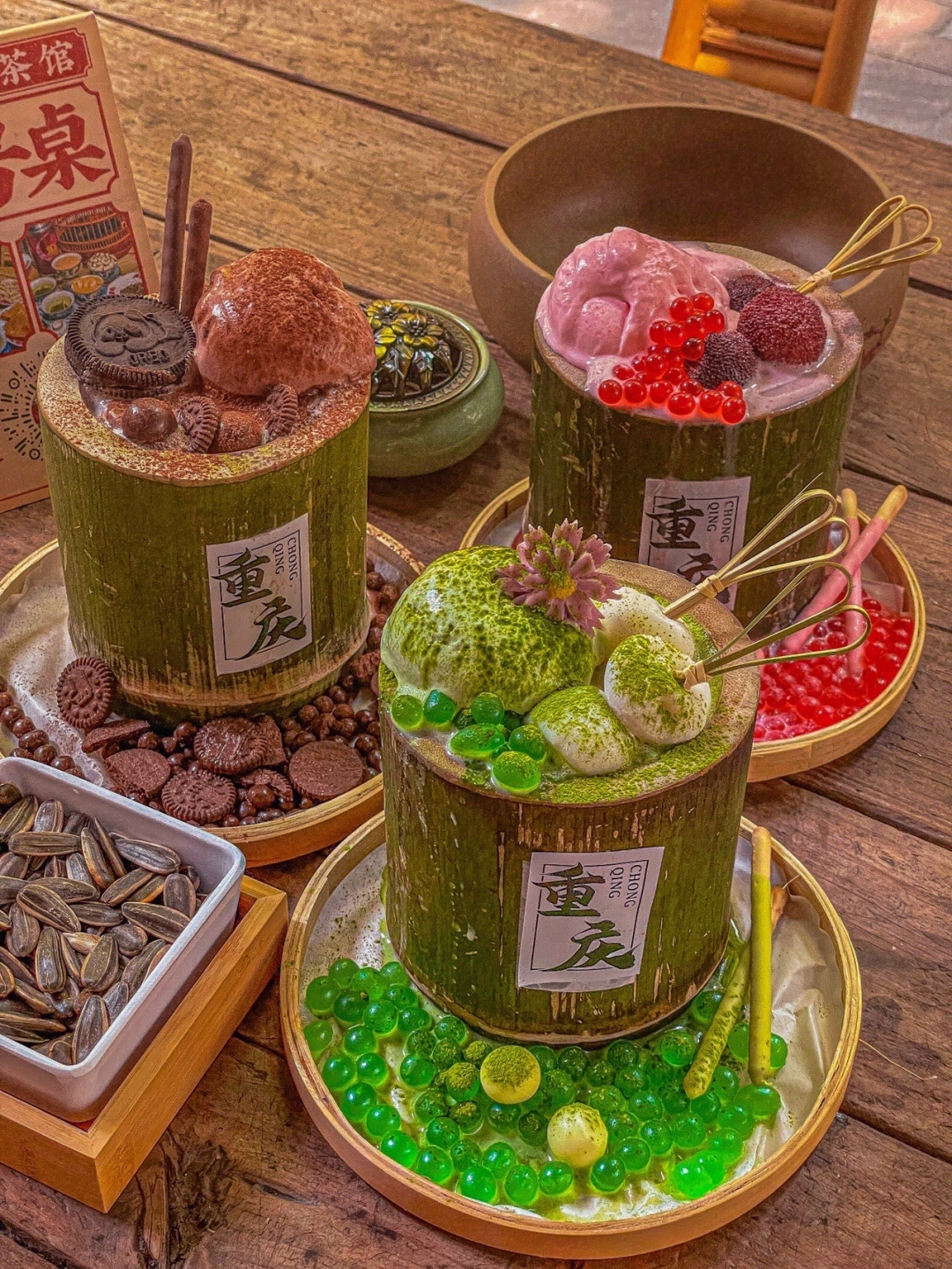 颜值真的好🉑️!来重庆一定要打开的地标奶茶!!要不然白来了!竹筒装的冰淇淋太有仪式感了!一共三个口味,顶部是冰淇淋🍦每个盘子还有不同口味的爆爆珠!!