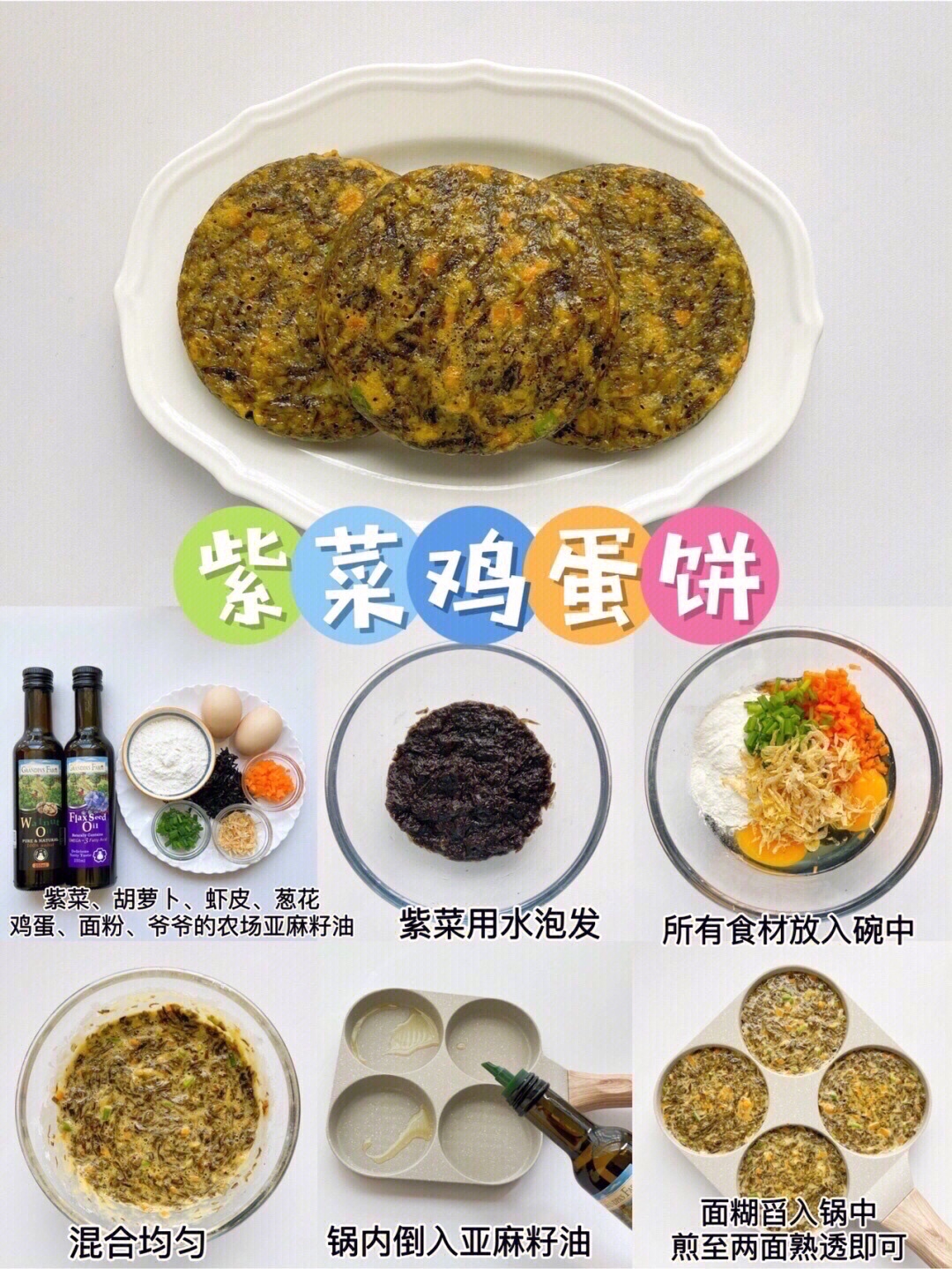 食材:紫菜、虾皮、葱花,胡萝卜、面粉、鸡蛋、亚麻籽油