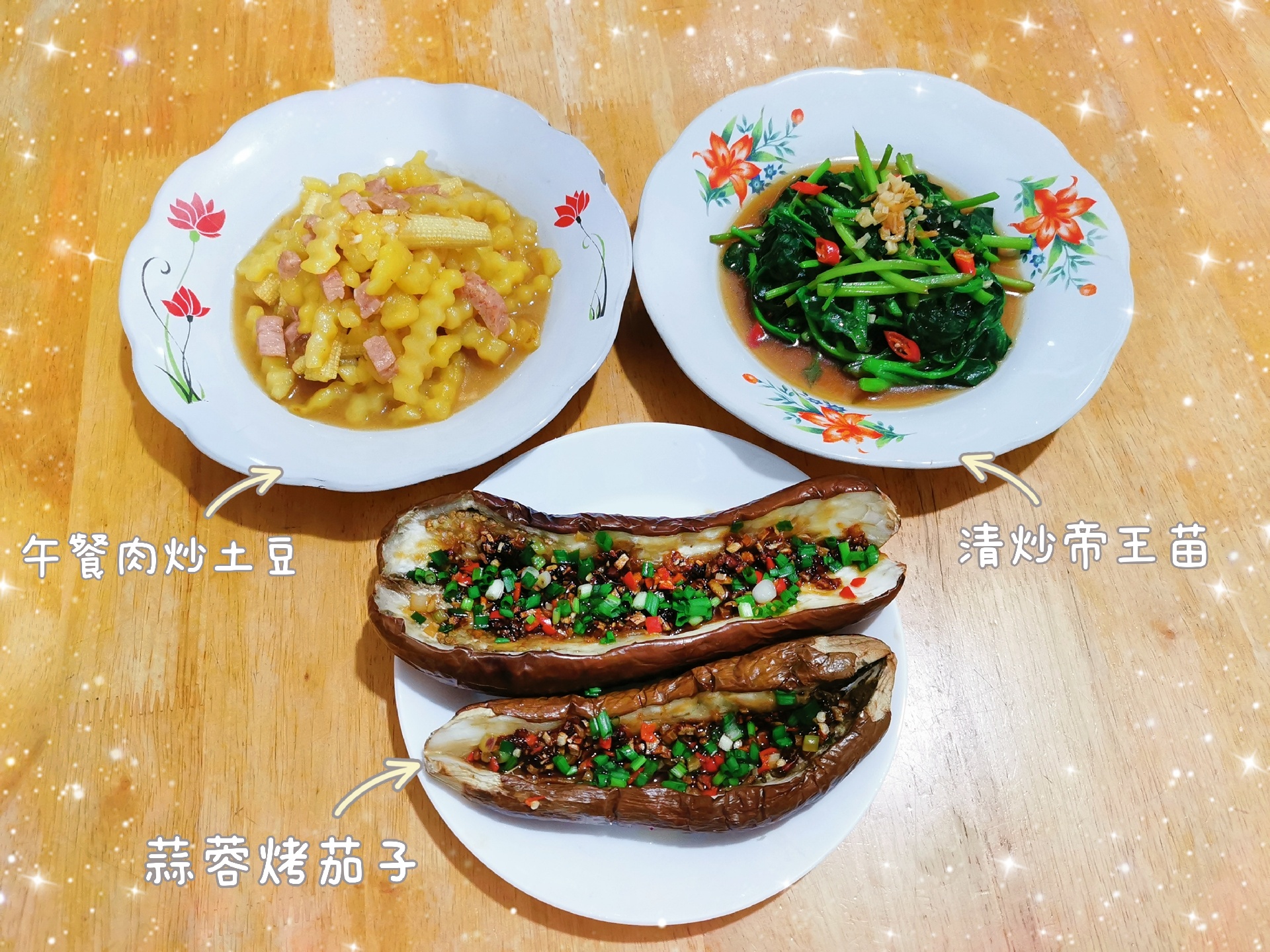 蒜蓉烤茄子 午餐肉炒土豆 清炒帝王苗