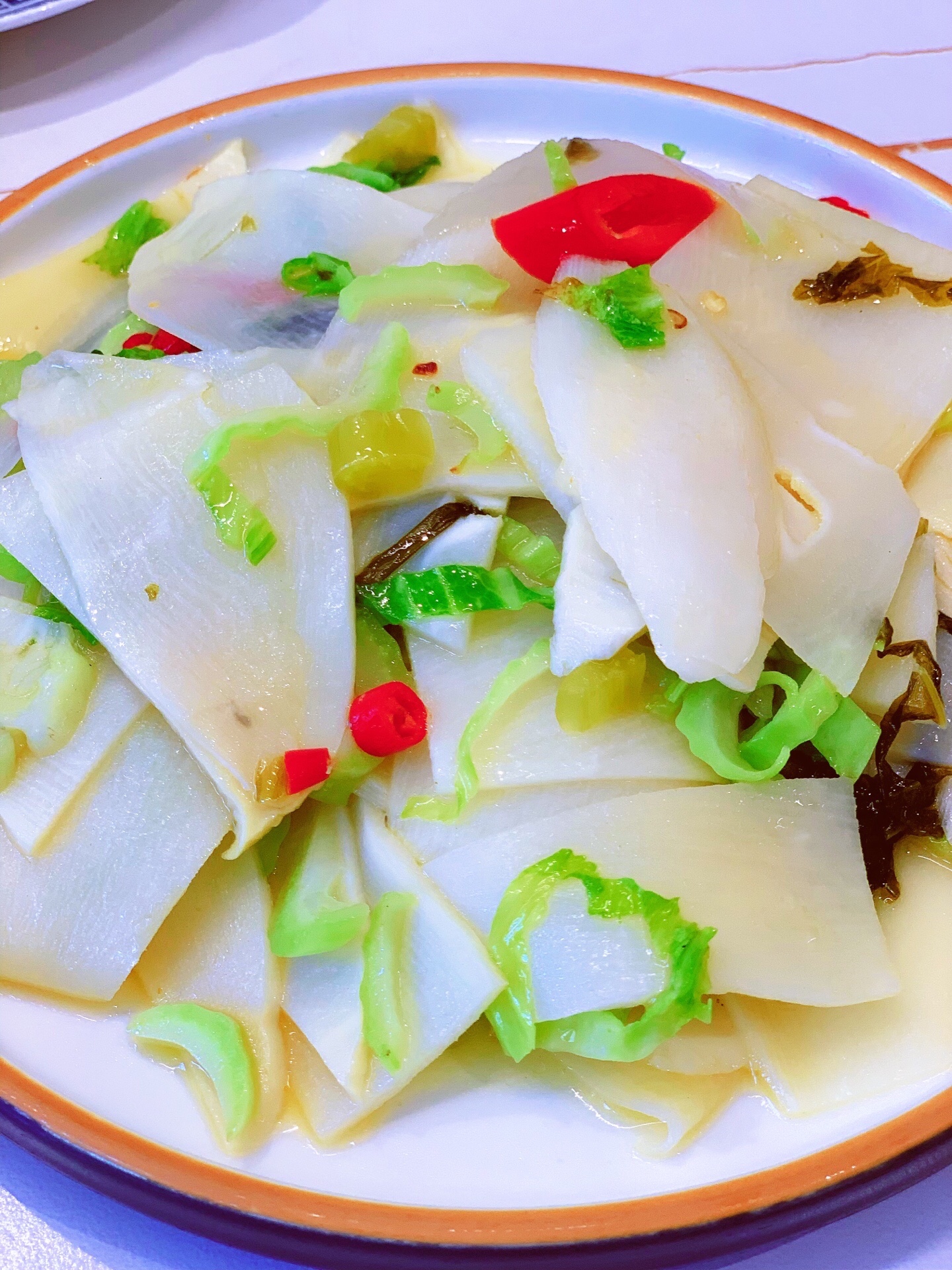 碧绿炒笋衣,¥39。感觉是那种腌渍不久的酸菜搭配笋片,味道酸酸可口。并且那个酸菜吧感觉是没有腌渍多久的,所以那个味道比较清爽。笋片因为酸菜的加入很入味。