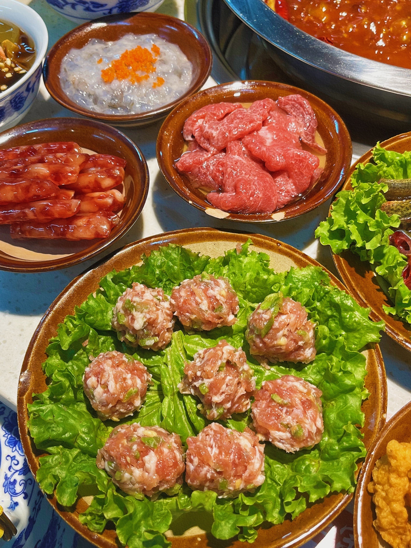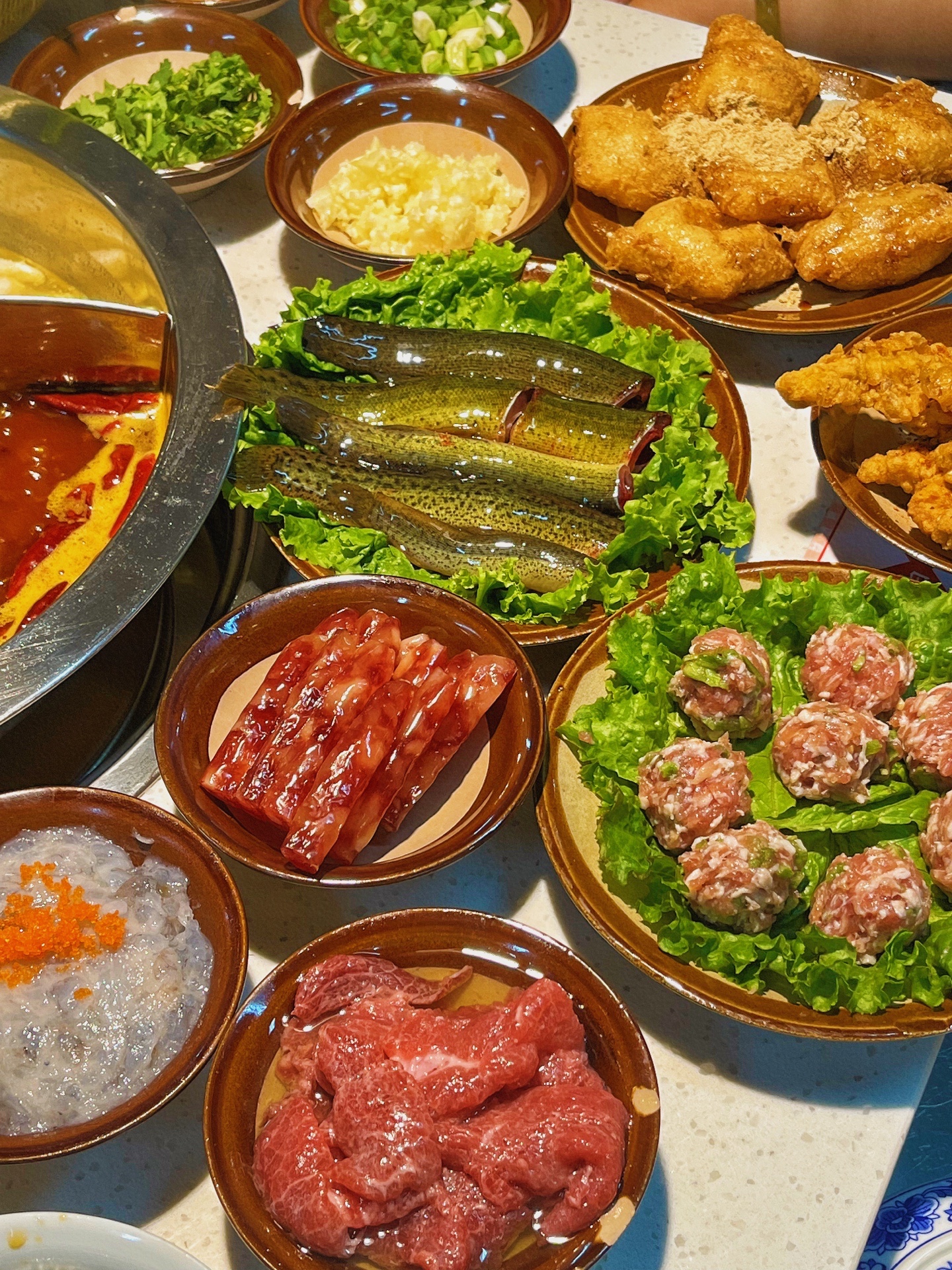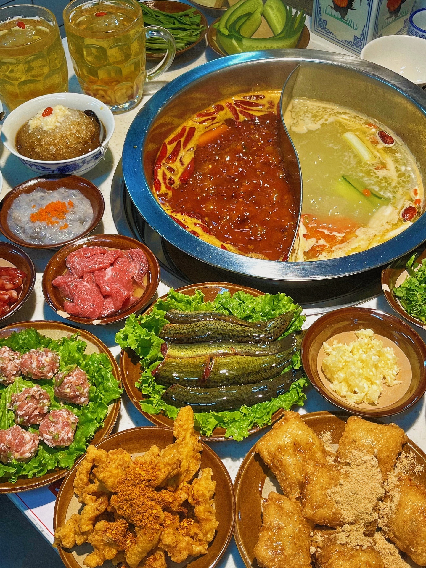 ◾️推荐:龙眼水8r、嫩牛肉、鳝鱼、现杀泥鳅24r、爆浆豆腐12r、山城酥肉、蛋煎糍粑、手工鱼籽虾滑、重庆贡菜丸子30r