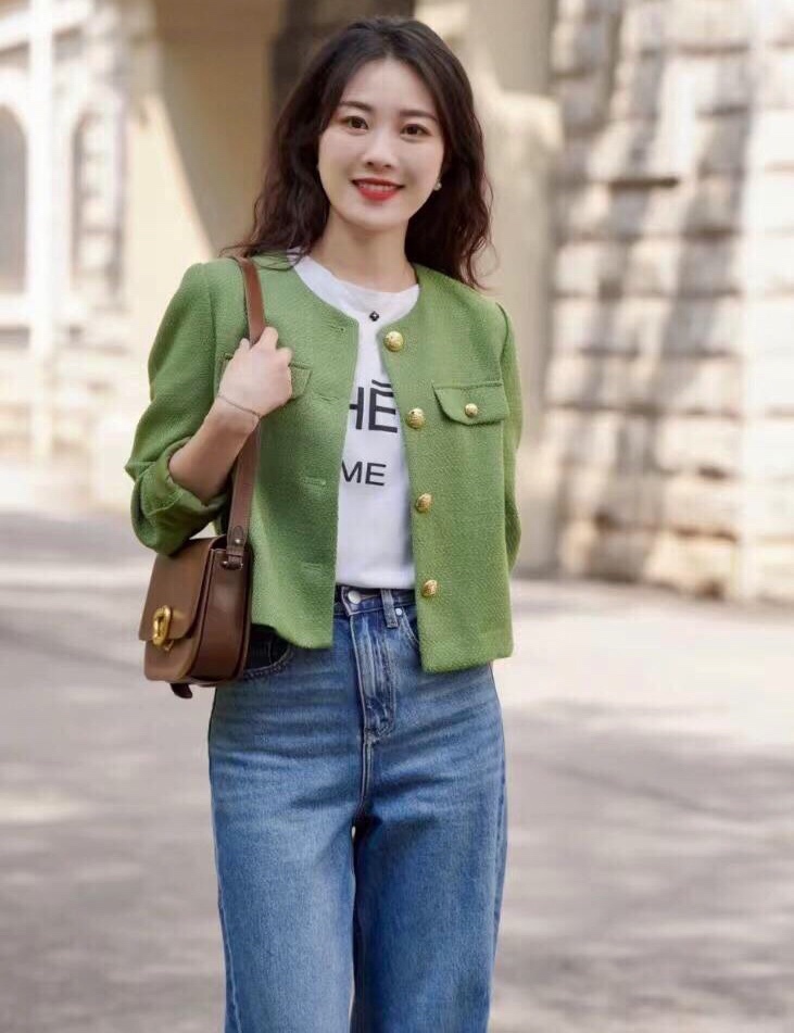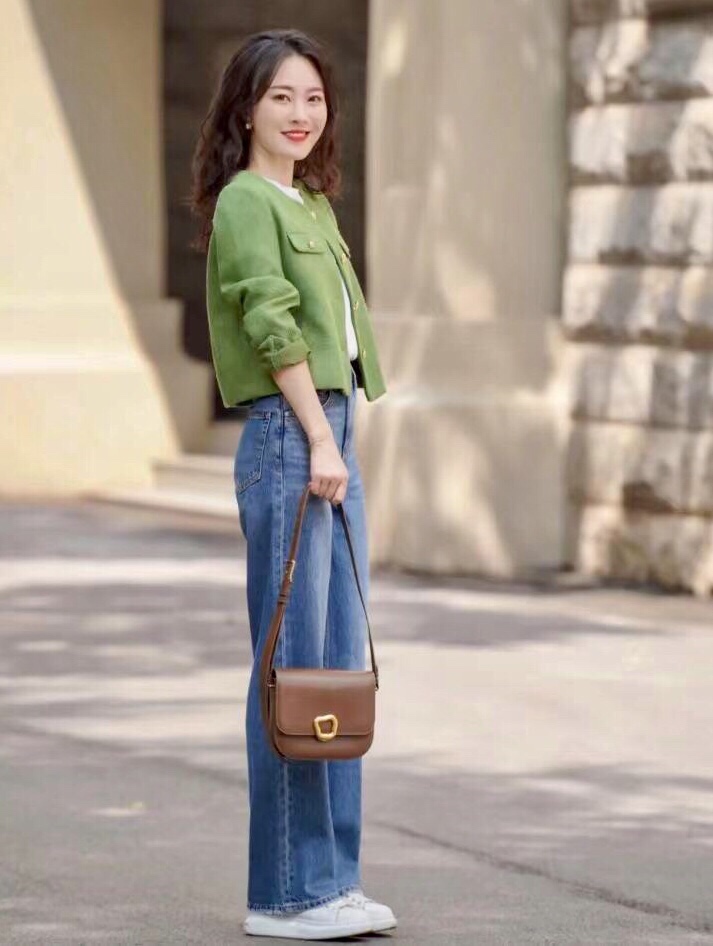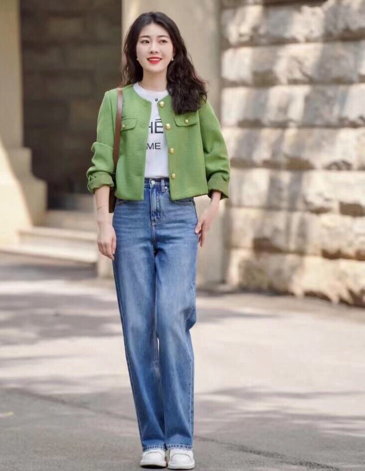 小香风外套搭配牛仔裤👖一眼看过去就知道这种高腰拖地的牛仔裤版型,非常显腿长,小个子也能轻轻松松驾驭。