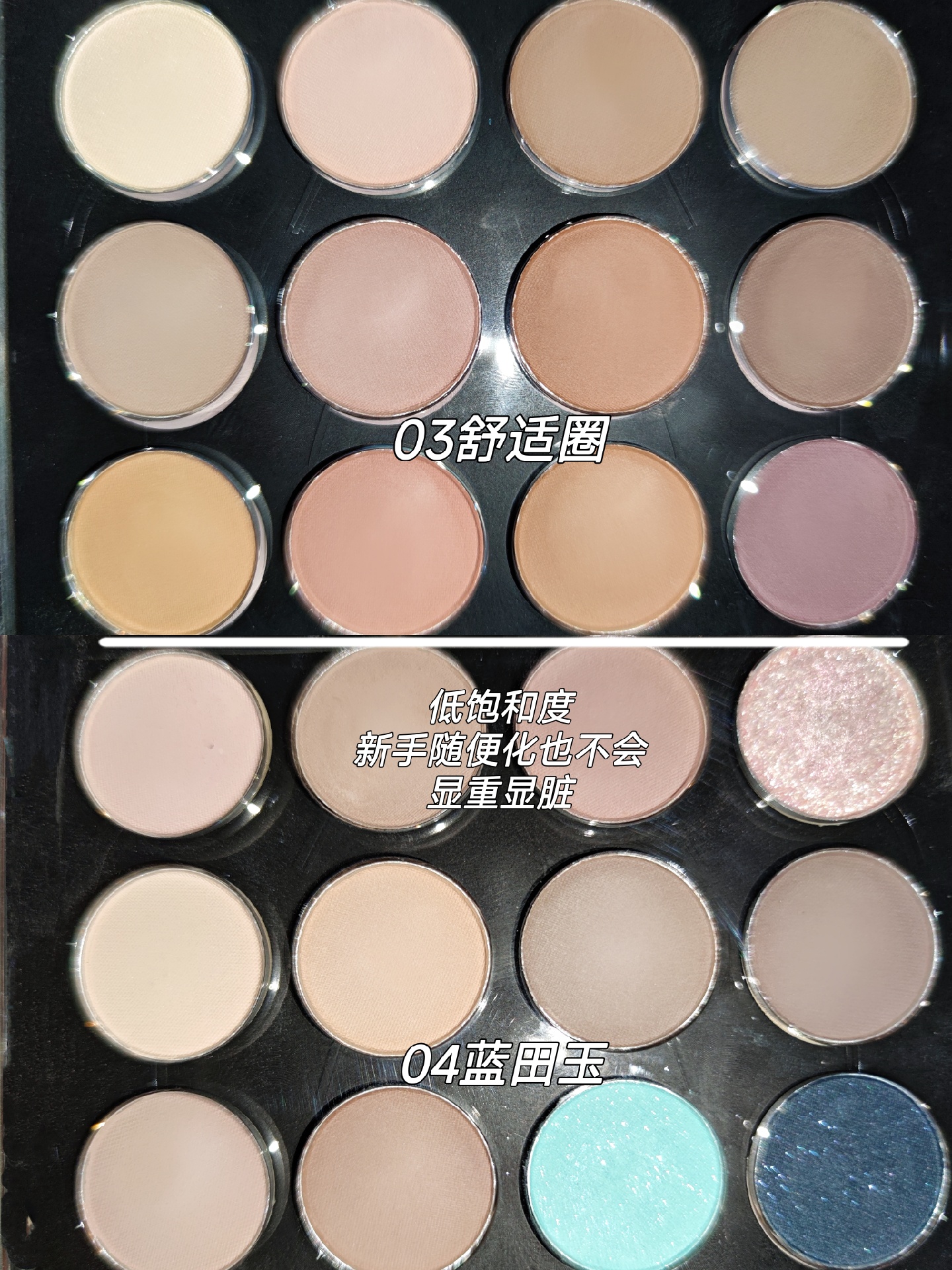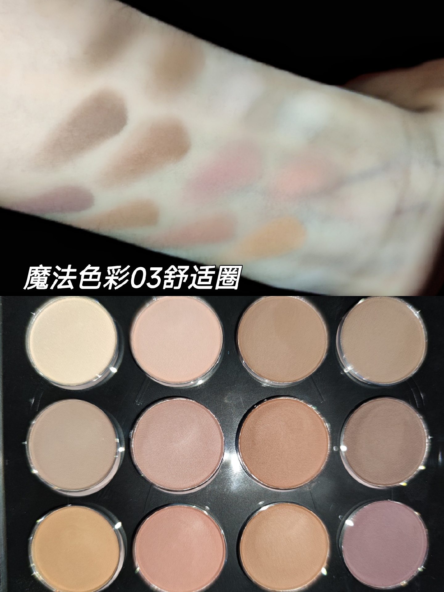 配色也很日常,早八妆通勤妆用这两盘完全可以搞定,03舒适圈里面可以大致分为粉色系和大地色系,右上角的灰粽色还可以拿来修鼻影