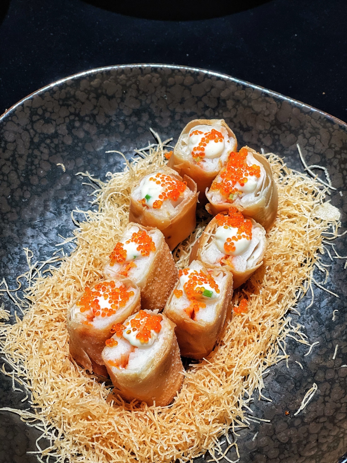蟹肉棒做的,外皮酥脆,沾上甜辣酱,好吃~