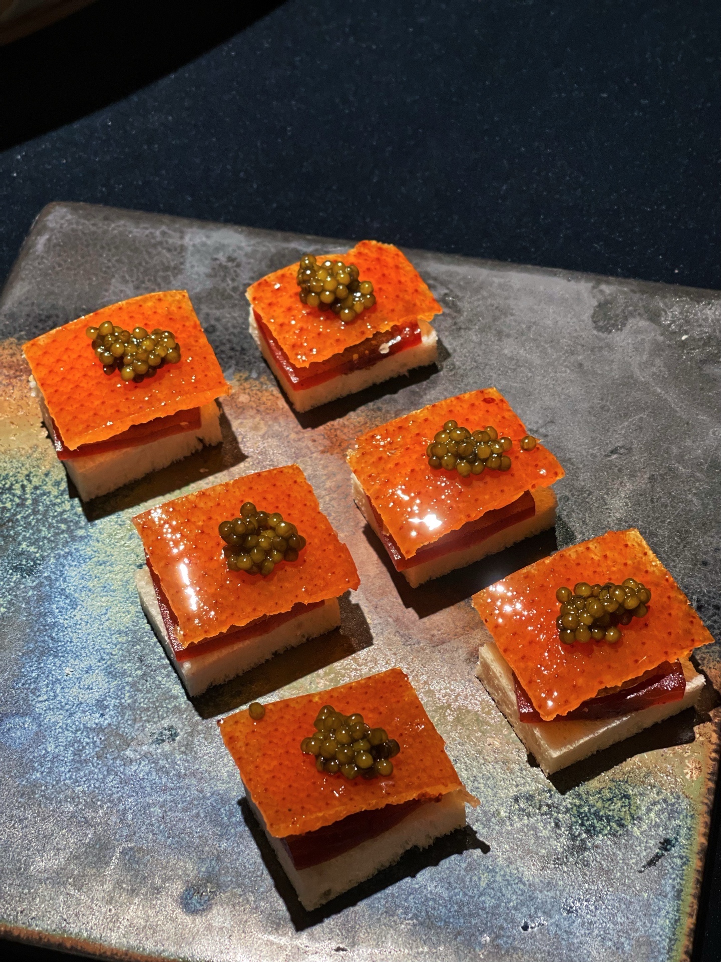 好像是第一次吃鱼子酱,原来是入口即化的感觉,烤鸭皮很脆,里边有一片山楂片,很好吃,解锁吃烤鸭新方式