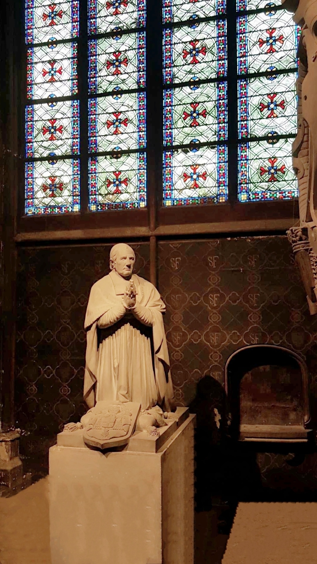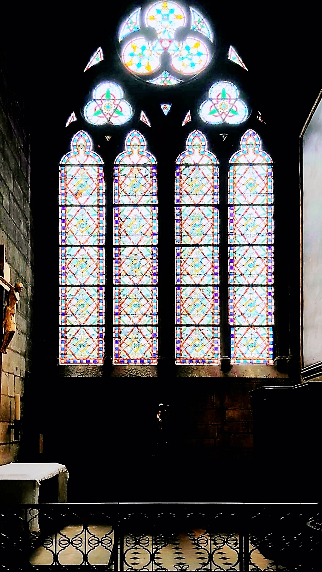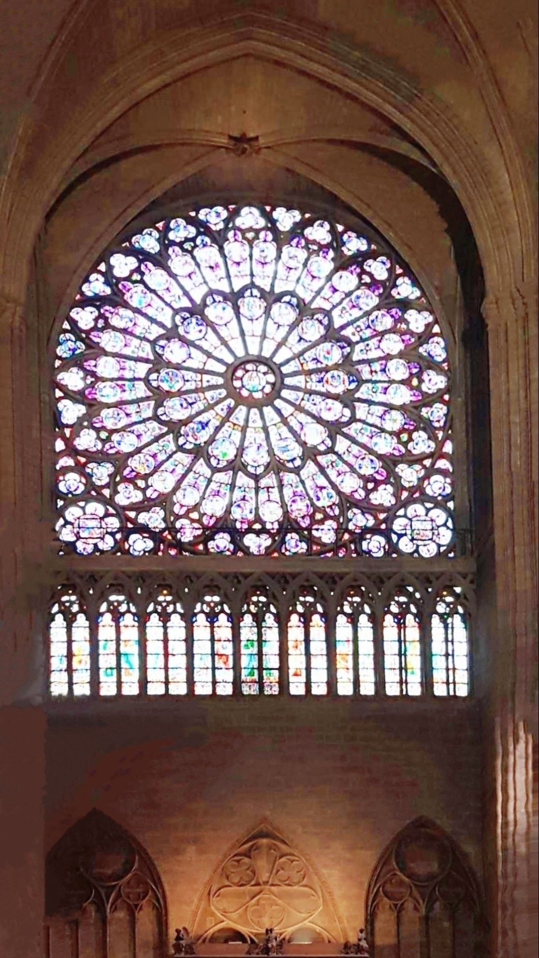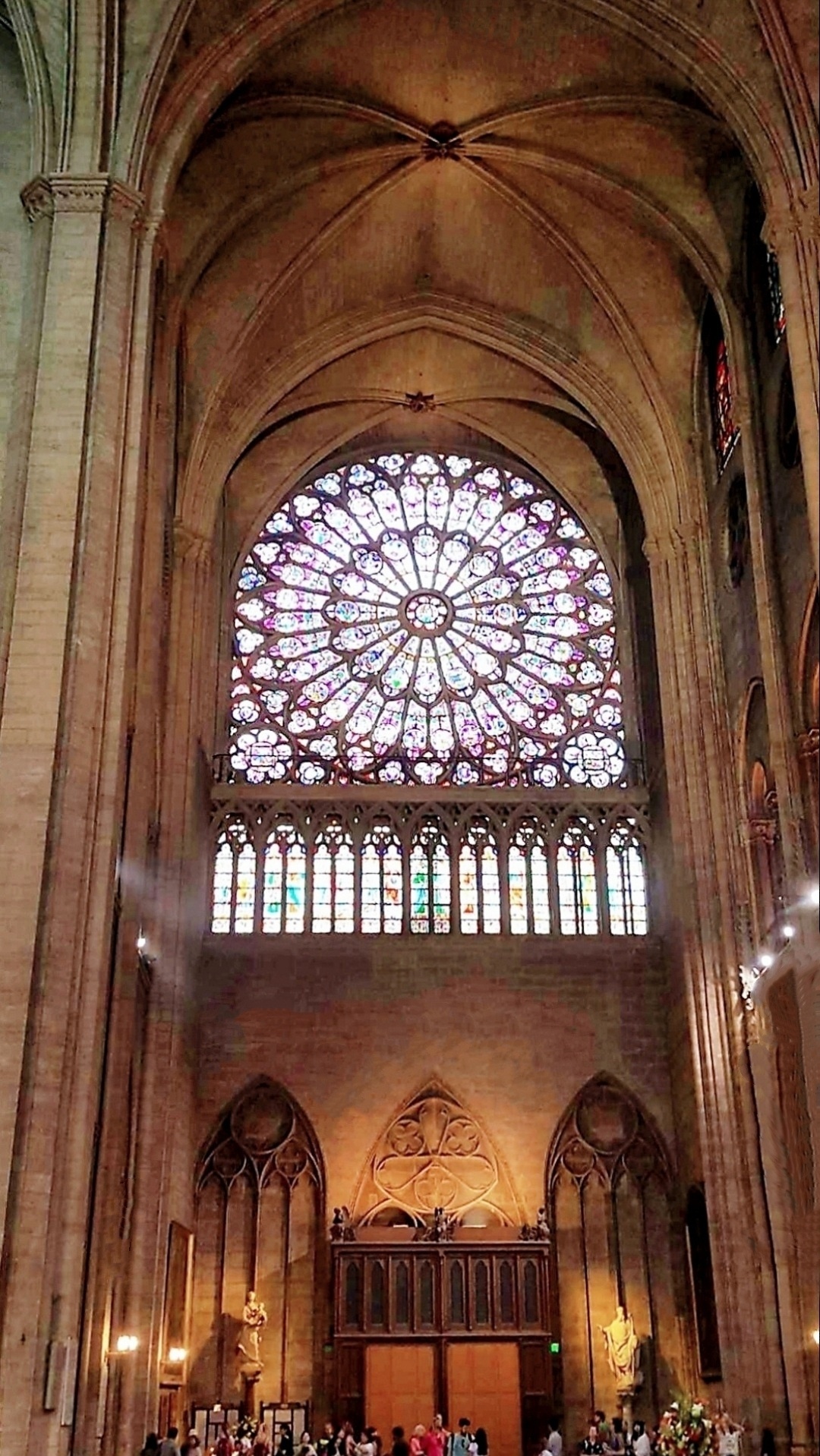 巴黎圣母院有三扇巨大的圆形玻璃窗,也称玫瑰花窗,图案呈放射状,花窗镶嵌着美丽的彩绘玻璃,因像玫瑰花形而得名,玫瑰花窗为哥特式建筑的特色之一。巴黎圣母院内部有29座小教堂围绕,装饰有祭坛、雕像及绘画。小教堂是为教徒“与上帝对话”、纪念死者而建的专用空间。小教堂边上设有一间玻璃房,教徒可以找坐堂神父咨询些心理问题。