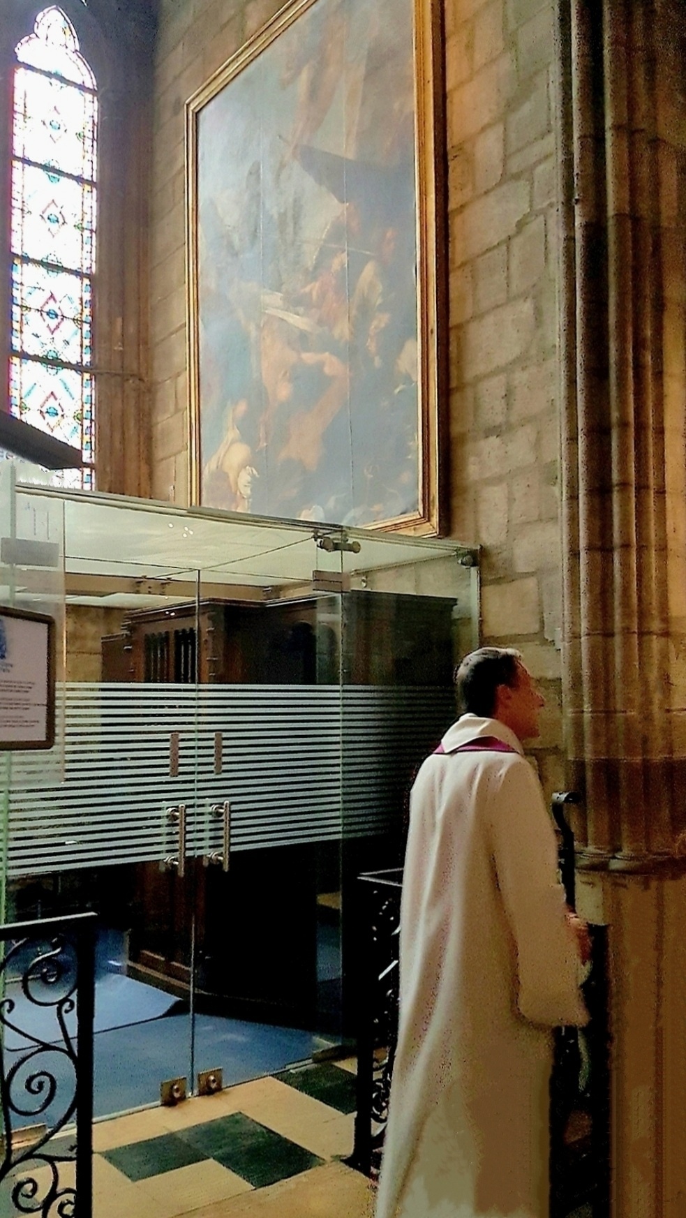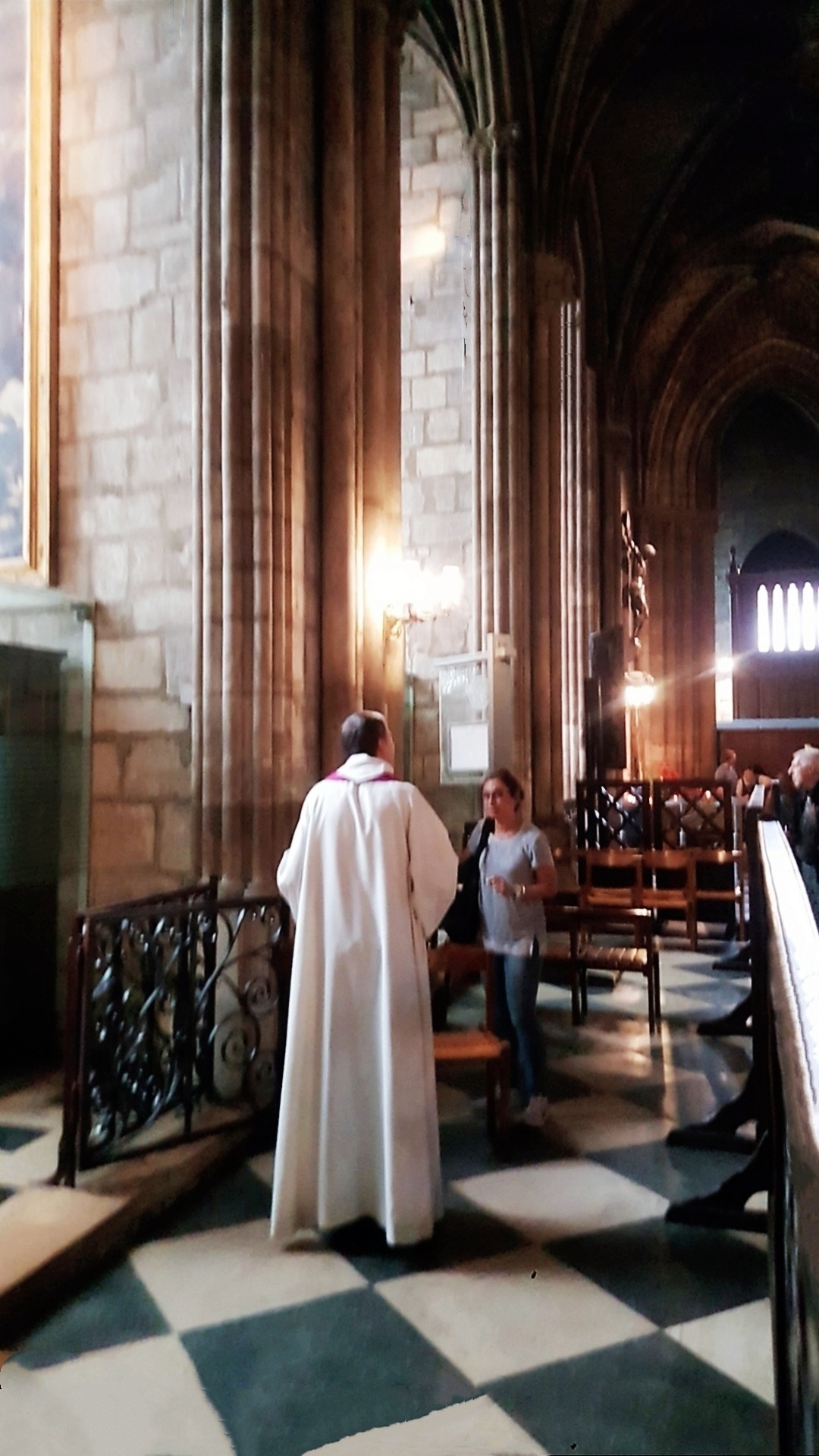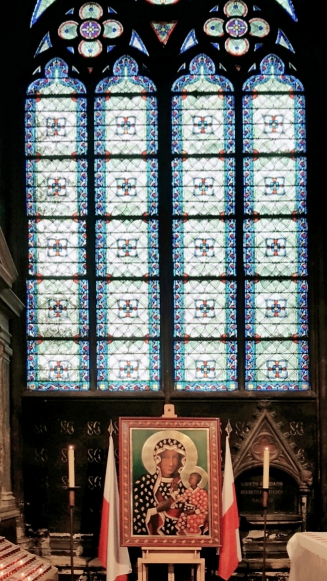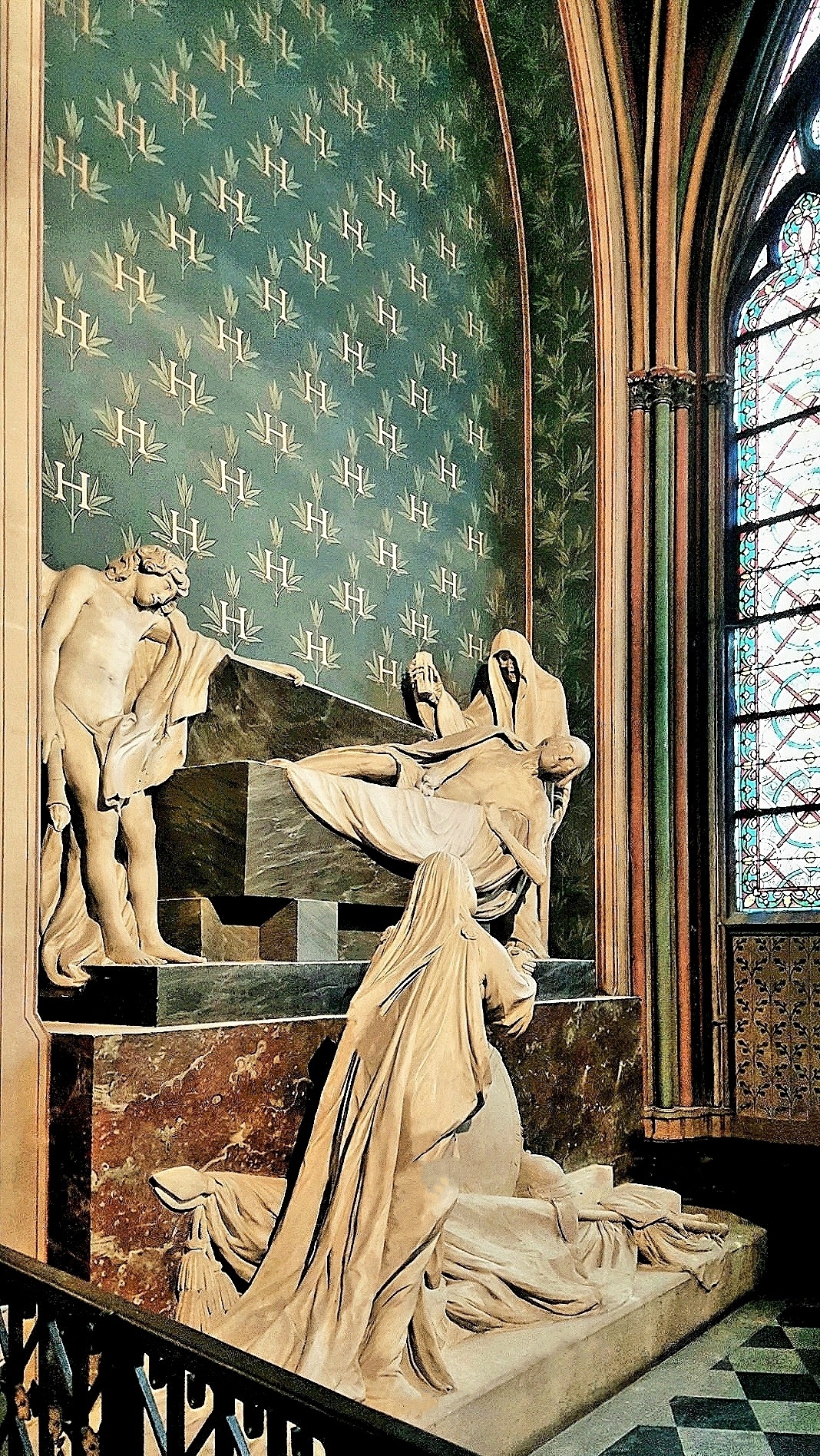 巴黎圣母院有三扇巨大的圆形玻璃窗,也称玫瑰花窗,图案呈放射状,花窗镶嵌着美丽的彩绘玻璃,因像玫瑰花形而得名,玫瑰花窗为哥特式建筑的特色之一。巴黎圣母院内部有29座小教堂围绕,装饰有祭坛、雕像及绘画。小教堂是为教徒“与上帝对话”、纪念死者而建的专用空间。小教堂边上设有一间玻璃房,教徒可以找坐堂神父咨询些心理问题。
