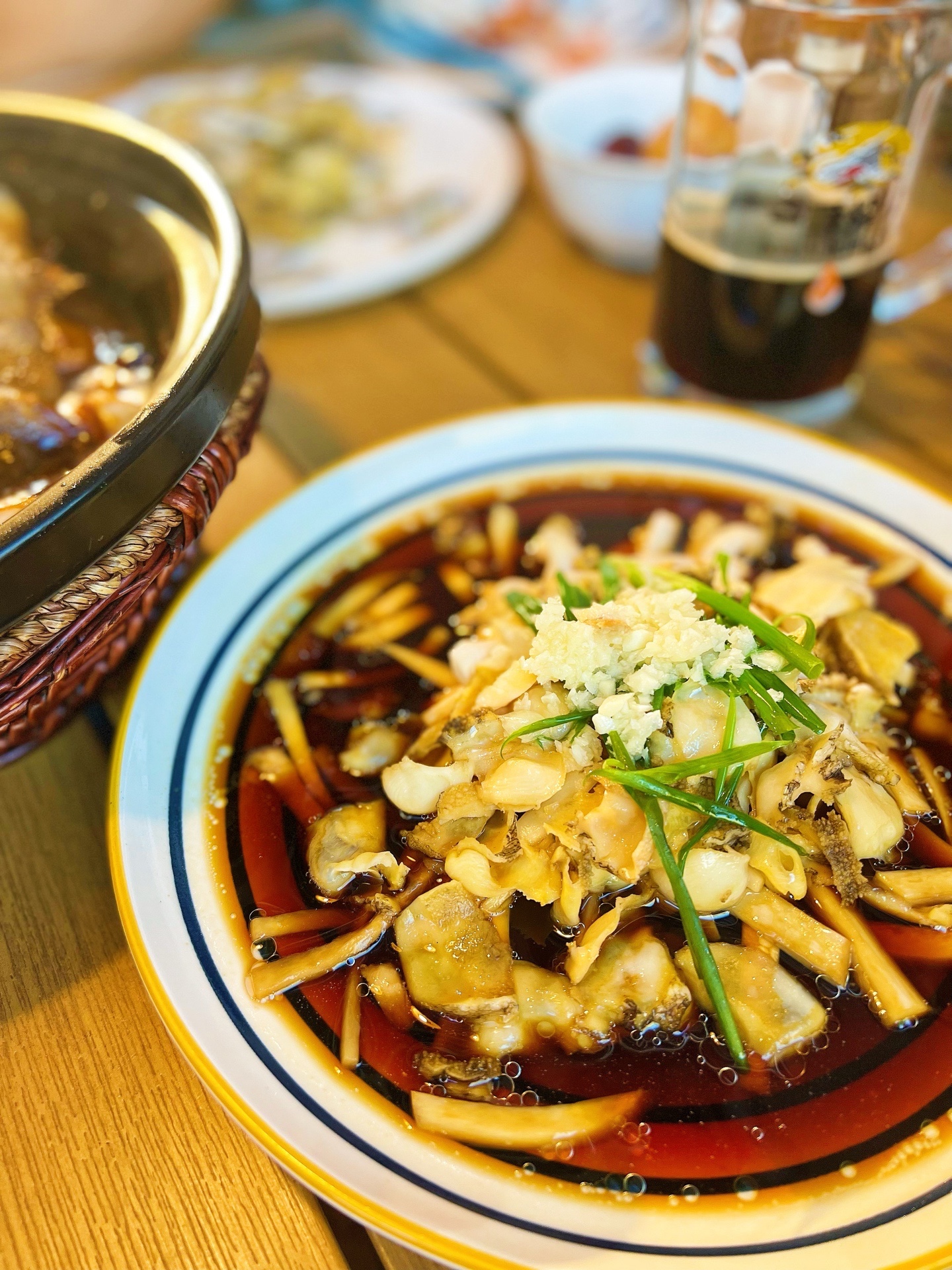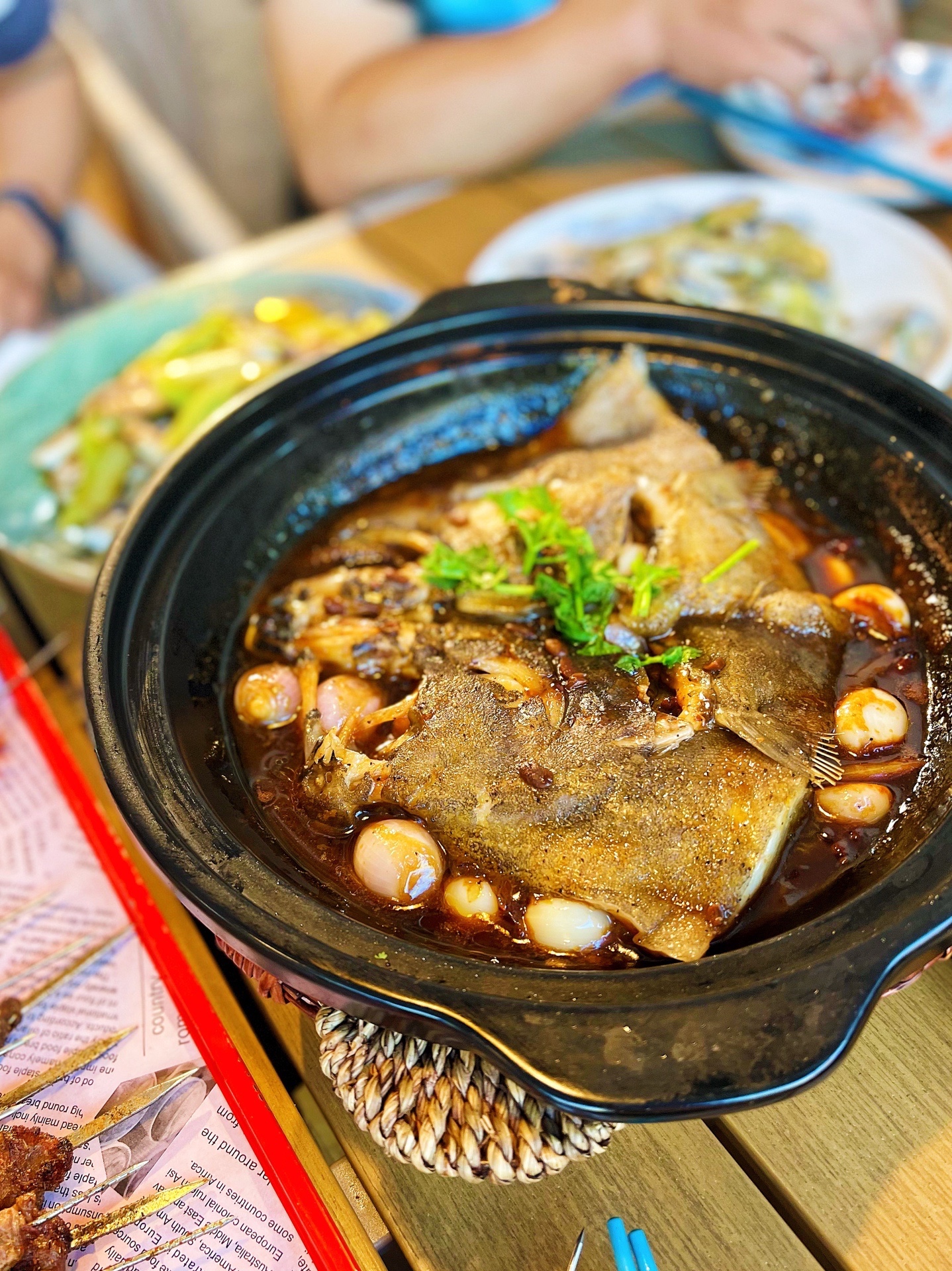 🍒「砂锅鲽鱼头」不亏是他家的扛把子,鱼肉很嫩,蒜瓣肉一夹就下来了。鱼皮油润,烤的香喷喷的。墙裂推荐!