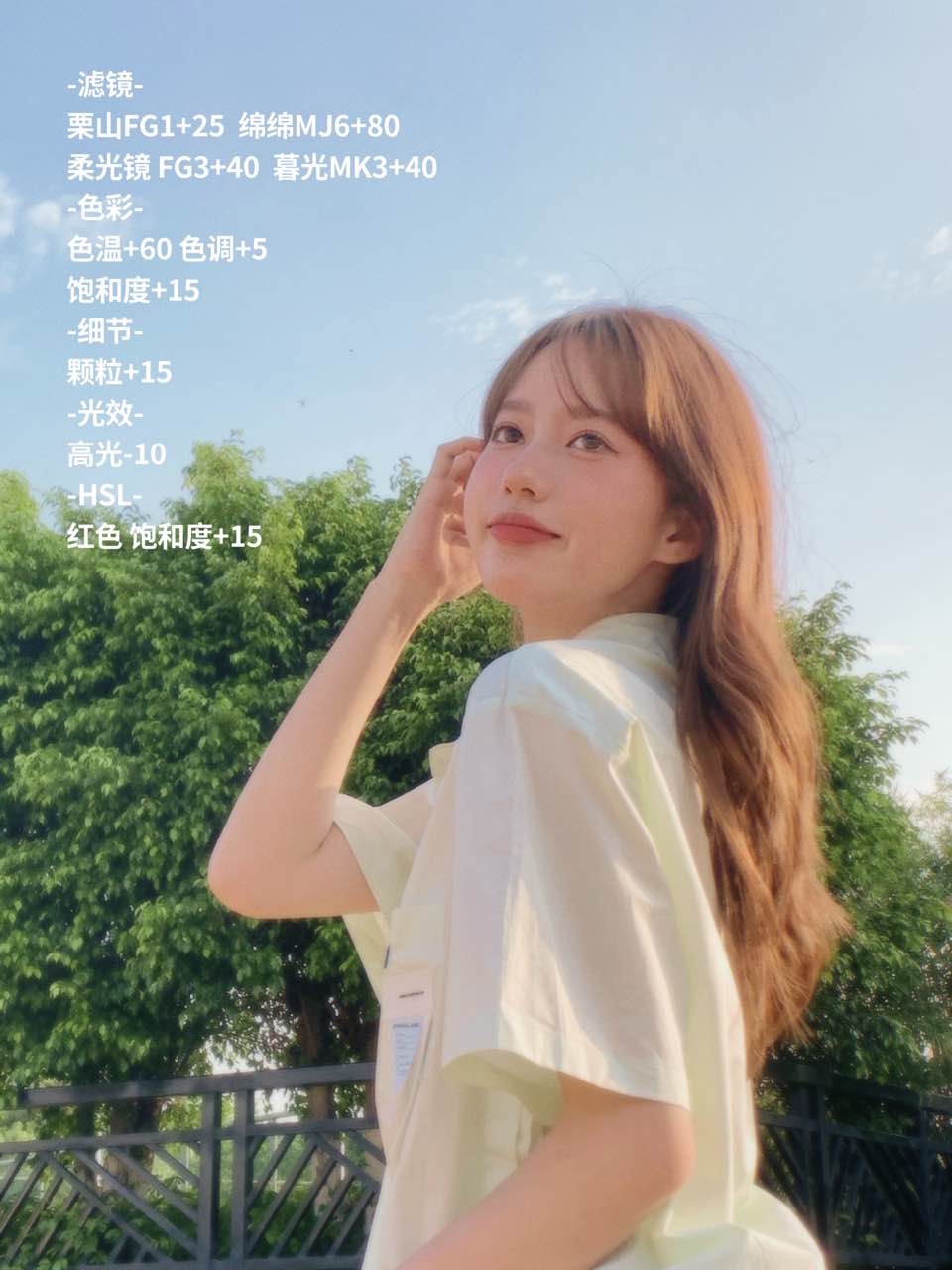 1.滤镜:「栗山FG1」+25%、「绵绵MJ6」+80、「柔光镜FG3」+40、「暮光MK3」+40;