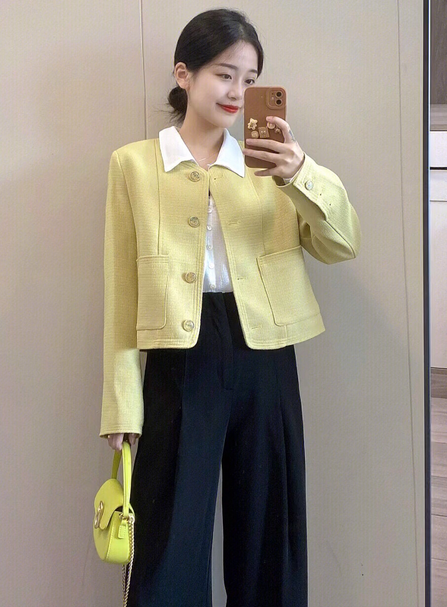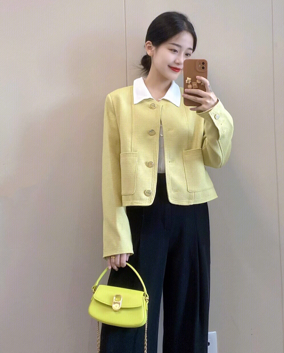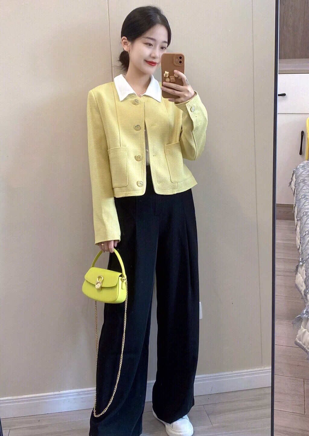 小香风外套搭配阔腿裤,简约干练,黄色的小香风很修饰肤色,显白又显嫩~