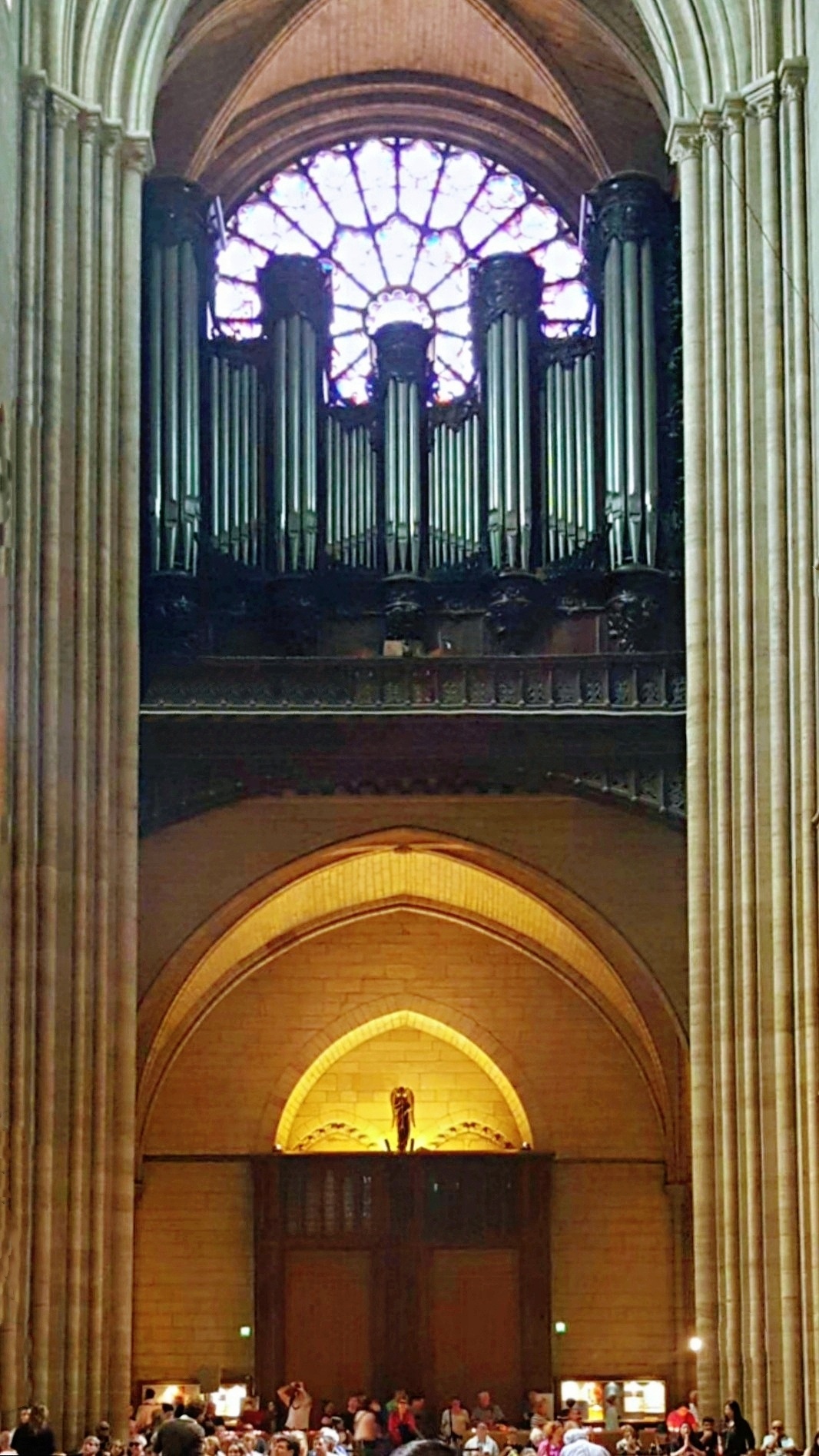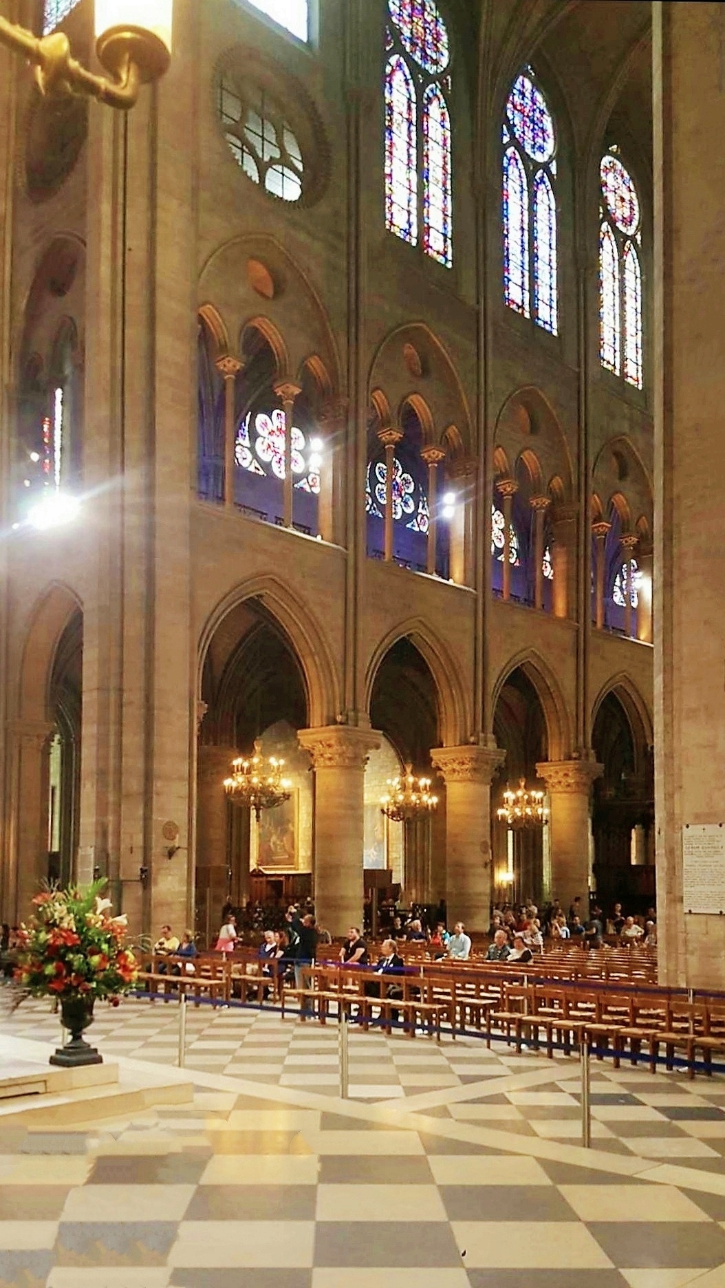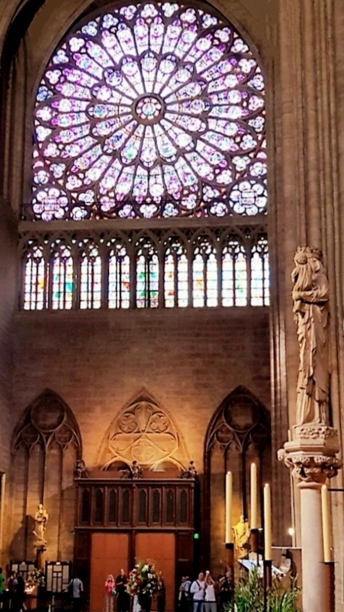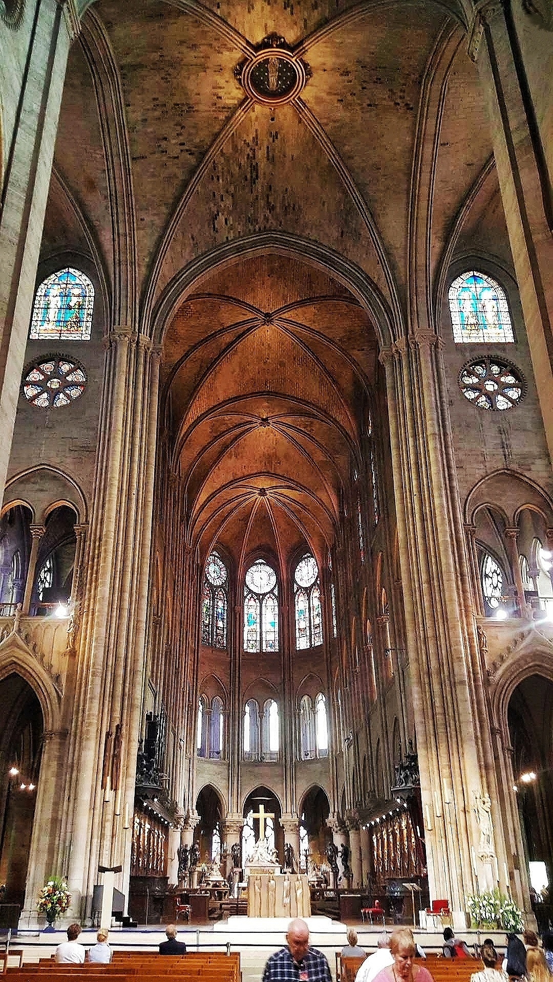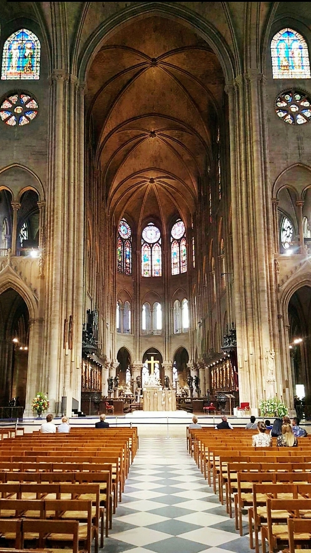 巴黎圣母院中堂是为仪式上的信徒保留的,即教堂主殿,是圣母院建筑的中心容器。从地面上升到拱顶共有十个跨度,每个跨度对应于每个支柱之间,作为过渡,柱子、拱廊、壁柱和柱廊突出了垂直效果。巴黎圣母院坐东朝西,内部长约127米,宽约48米,总高达96米,室内建筑面积达4800平方米。