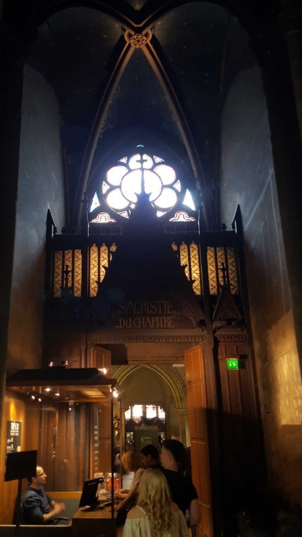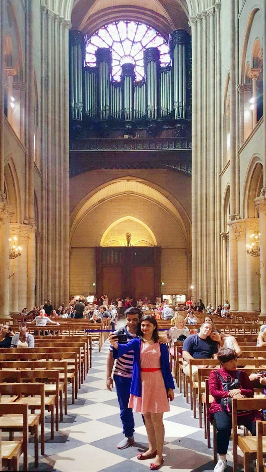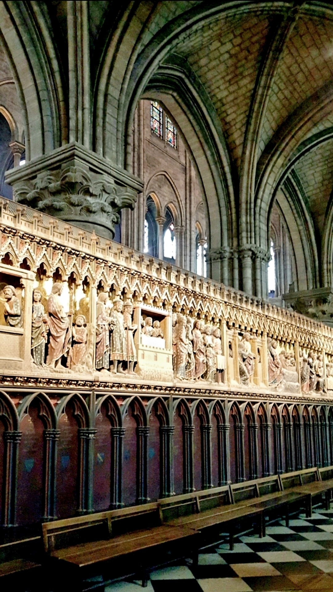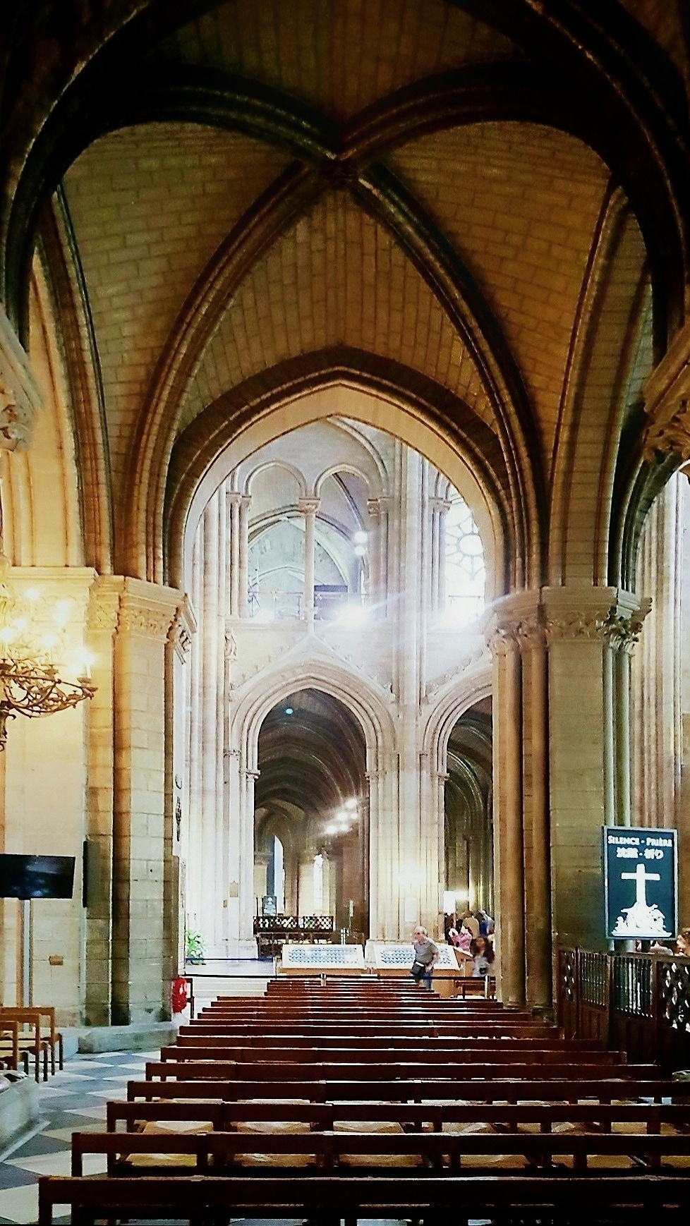 巴黎圣母院中堂是为仪式上的信徒保留的,即教堂主殿,是圣母院建筑的中心容器。从地面上升到拱顶共有十个跨度,每个跨度对应于每个支柱之间,作为过渡,柱子、拱廊、壁柱和柱廊突出了垂直效果。巴黎圣母院坐东朝西,内部长约127米,宽约48米,总高达96米,室内建筑面积达4800平方米。