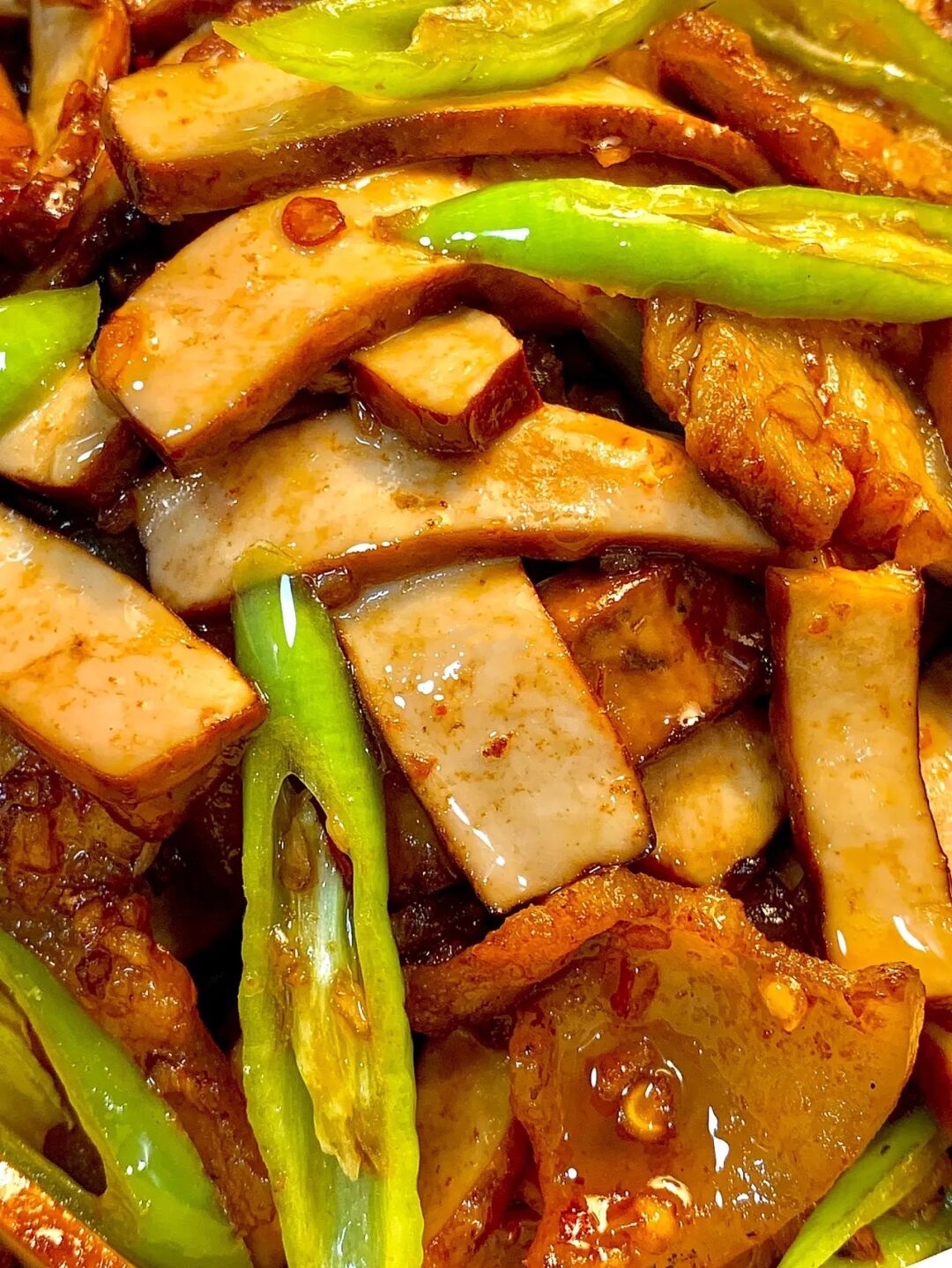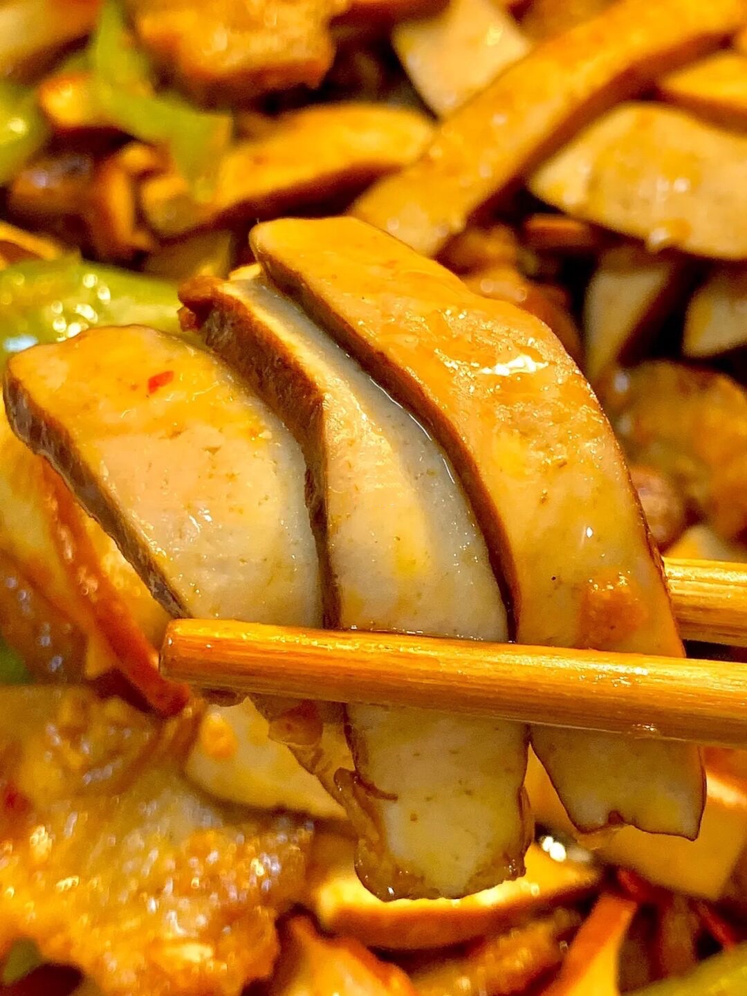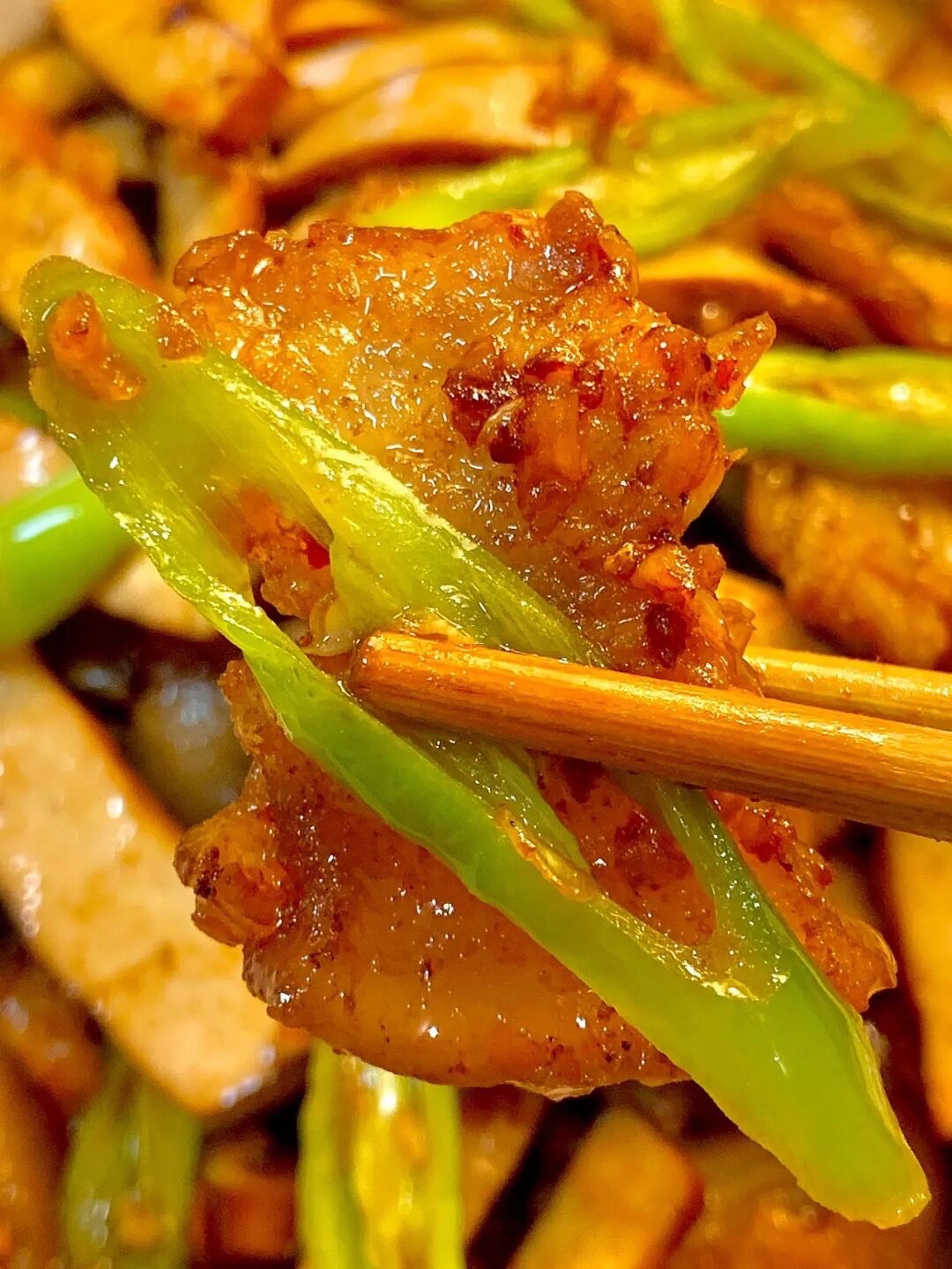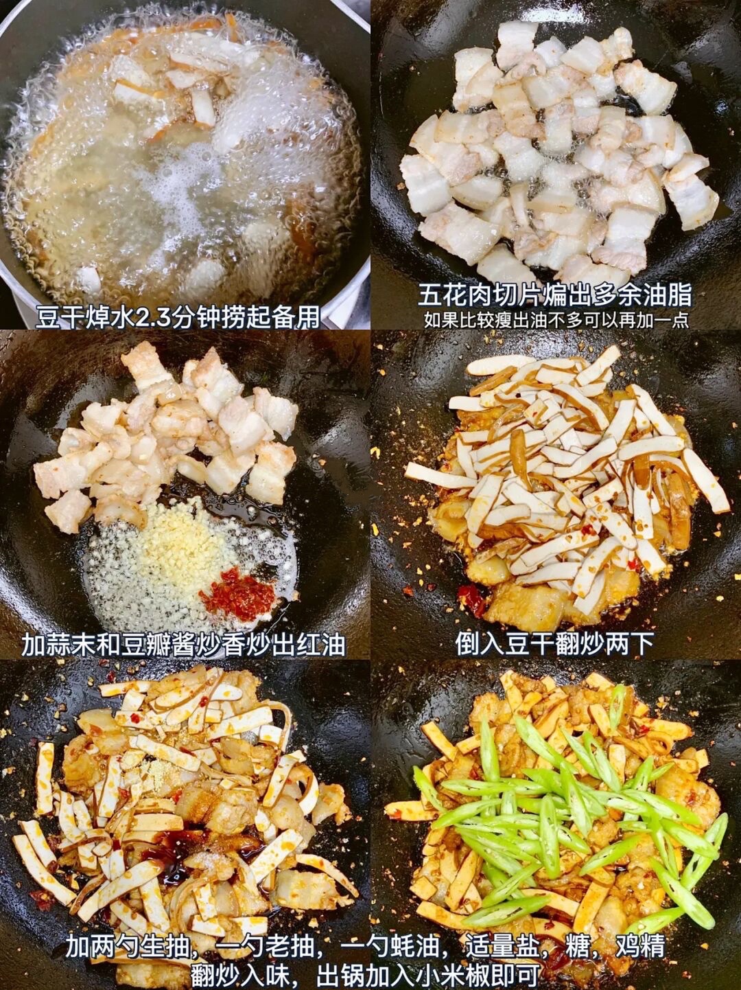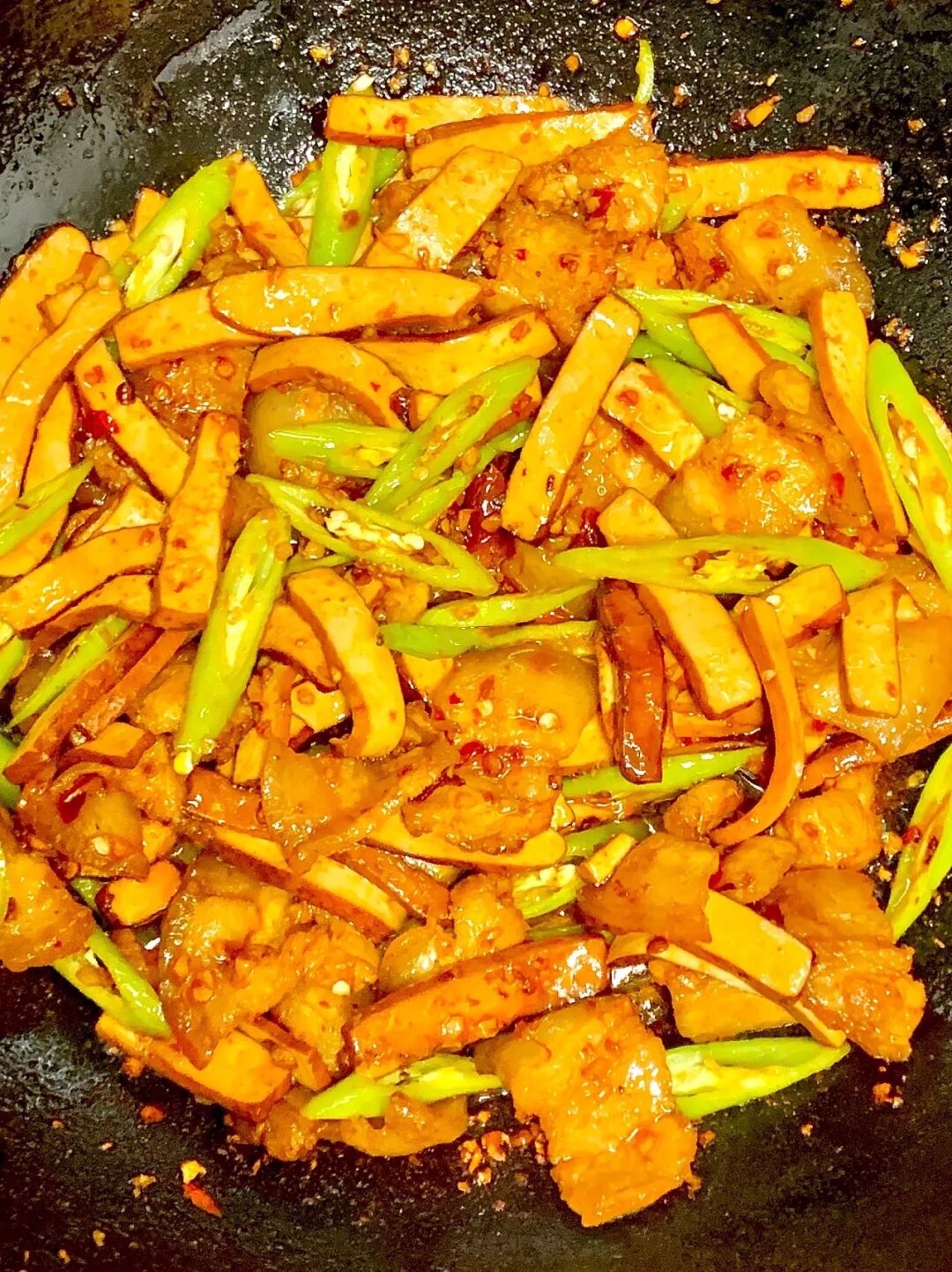 4️⃣倒入豆干,加两勺生抽,一勺老抽,一勺蚝油,适量盐,糖,鸡精翻炒入味就好啦,出锅前再撒一把杭椒圈搞定!