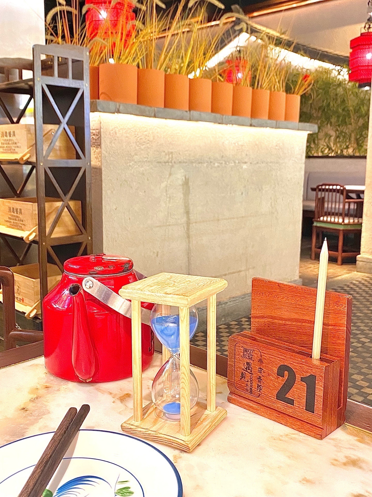 我去的时候是晚上九点左右,他们店里人不多,可能也有快打烊了的缘故。一进门服务员小姐姐特别热情,而且很亲切幽默,会给我们细心的推荐菜品,丝毫没有不耐烦,随叫随到,感觉到了店铺对员工培训非常细致。并且桌子上有个计时的沙漏,据说沙漏漏完了还没上菜,就可以免单嘻嘻,店家对他们家的上菜速度看起来非常有自信呀。