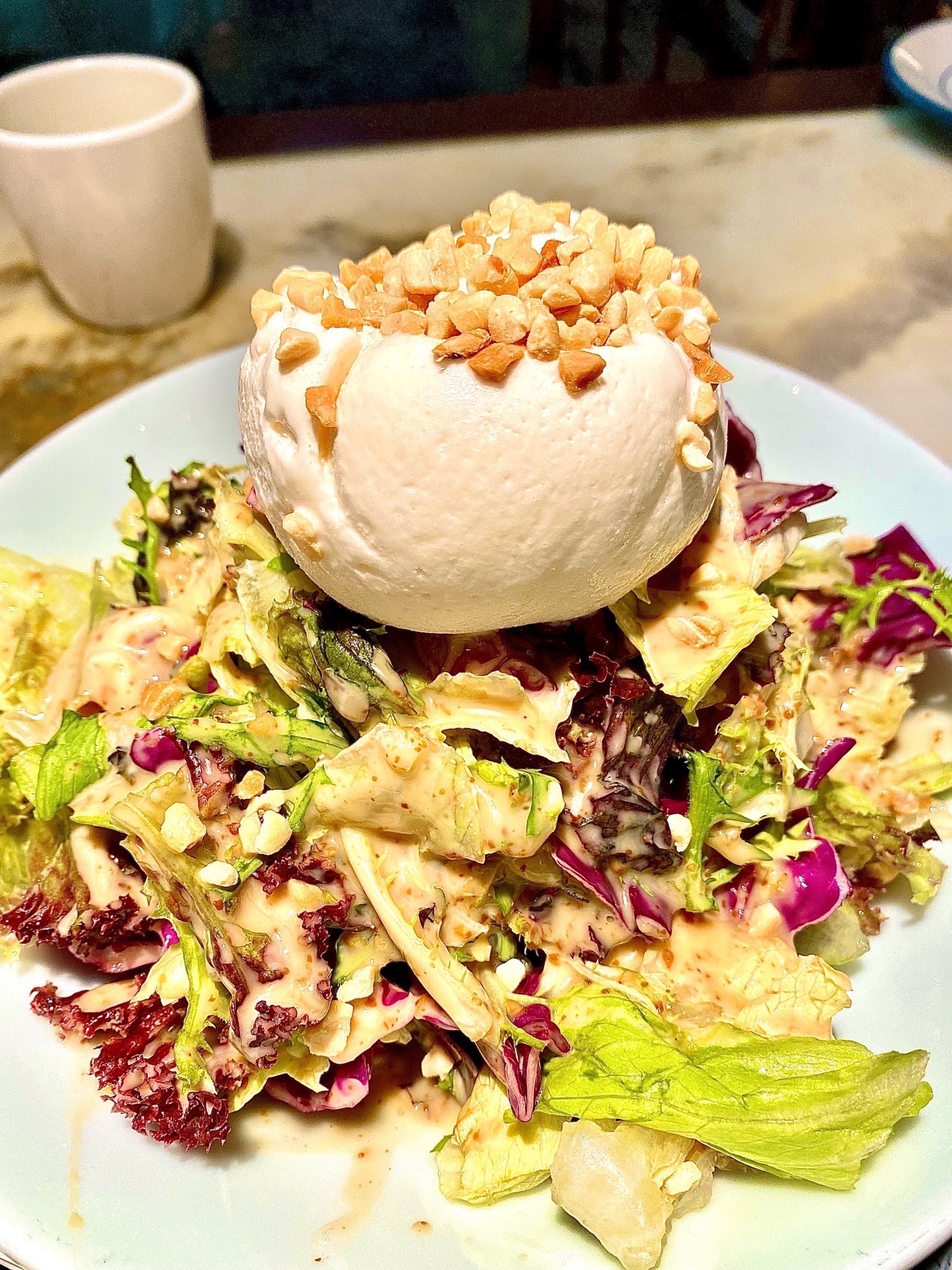 尝试了一个青花椒冰淇淋沙拉,本来觉得这个肯定是黑暗料理,没想到上来的时候出乎意料,颜值抗打,并且一点也不黑暗,蔬菜新鲜又好吃,嘎嘣脆,冰淇淋完美的搭配蔬菜,长见识了嘿嘿。